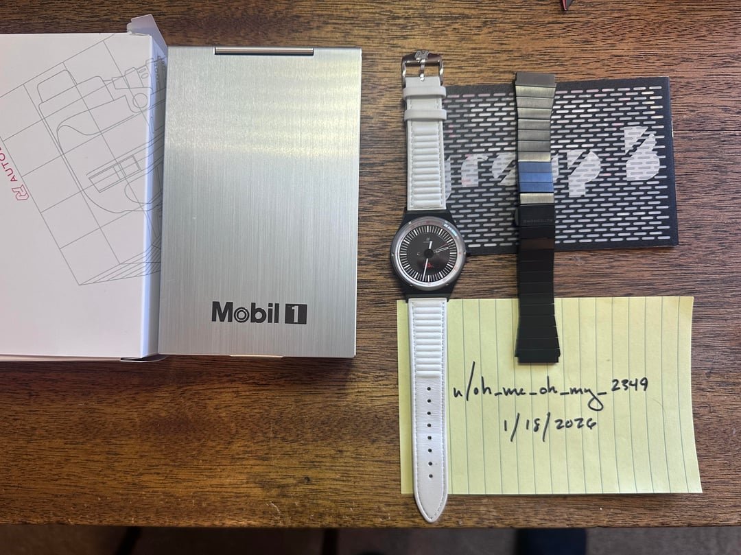Selling my like new Autodromo Group B Mobil 1 edition. This was a spontaneous purchase at the end of 2025 and I was so excited for it! I love the companies design aesthetic and I was not disappointed. Killer watch but it feels a little technical for my aesthetic. The bracelet is sized but barely worn. Included this white leather Autodromo band (so fresh). Complete kit. Asking $11:50 shipped in CONUS. Not trying to flip, just trusting my heart. Open to trades. I’m a fan of Oris and Autodromo. Also, saving up for Grand Seiko SbGW231.