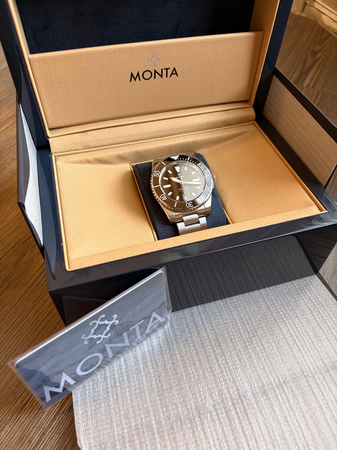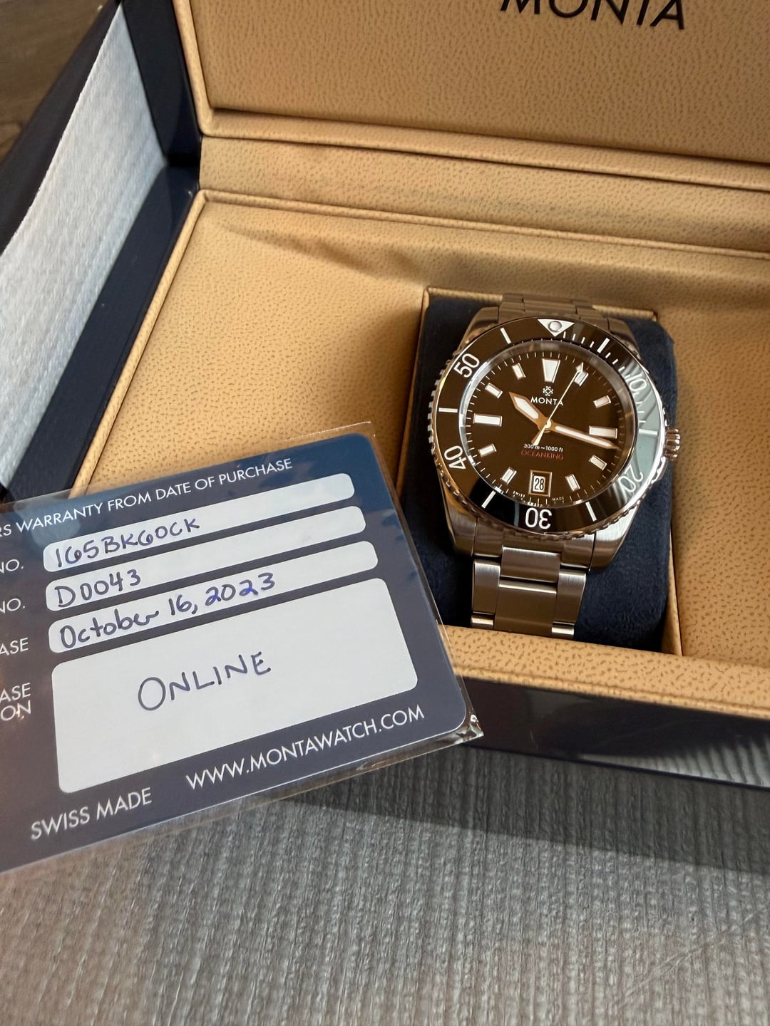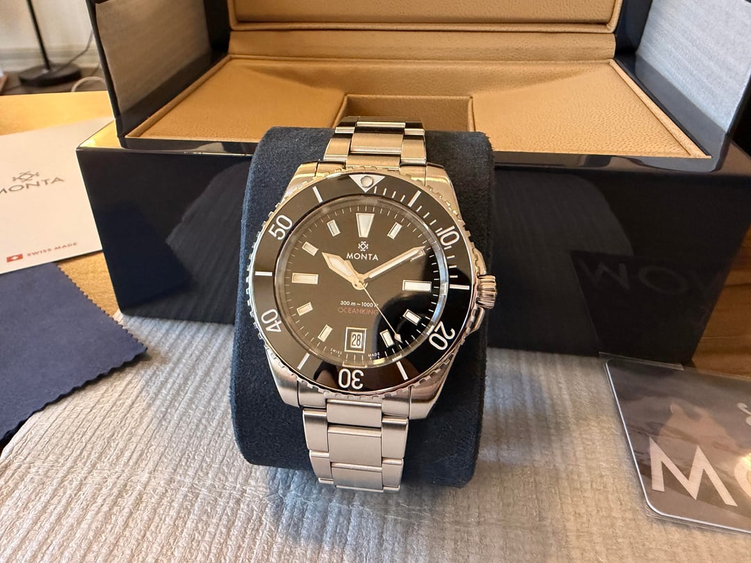 Selling this beautiful Monta Oceanking. I am the original owner, bought the watch from Monta in 2023. Watch is in great condition. Crystal and bezel are near mint, the case is in great condition (have a few hairline scuff on the side), but otherwise no dents. Bracelet is in great condition. All links included. Full package with all the included links, warranty card, and original box. Selling for $1500+shipping Not interested in trades right now CONUS. Will do Zelle, Venmo. Thank you! Images: https://imgur.com/a/monta-oceanking-UYn6htz Time stamp: https://imgur.com/a/monta-oceanking-timestamp-TJpEior