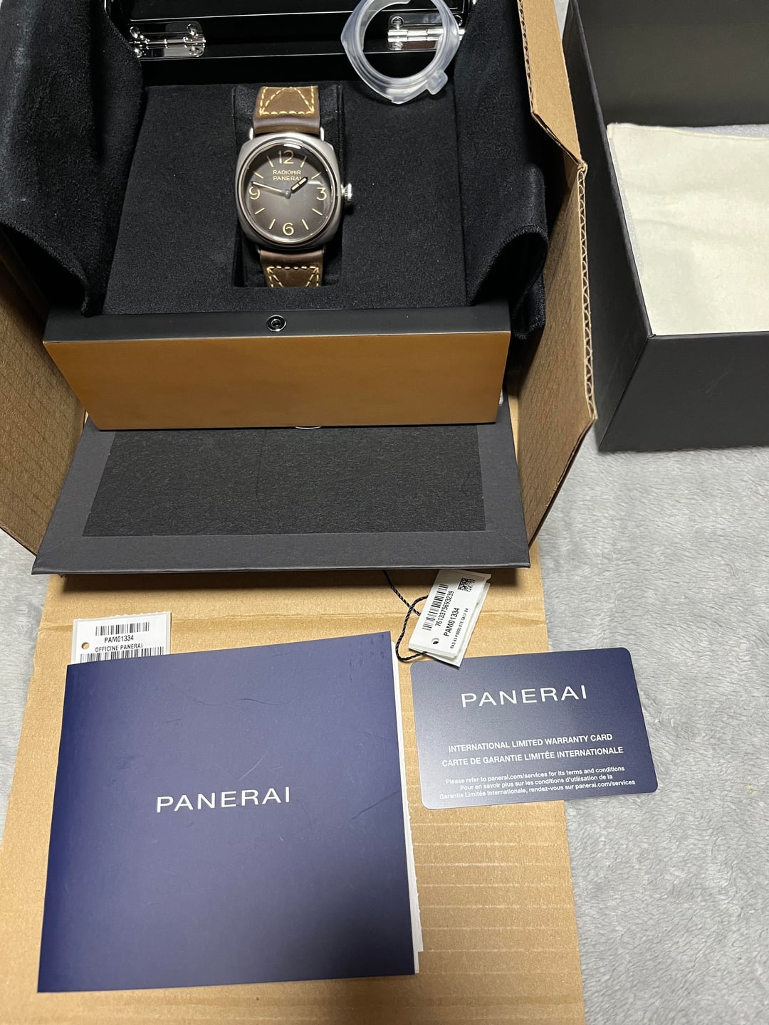 For sale - Panerai Radiomir 1334 Tre Giorni (PAM01334) The gradient grey dial is absolutely stunning in person. Pictures really don't do it justice. The factory warranty has been extended to Dec 2031. Overall mint condition with a few minor marks. Dec 2023 full set - triple boxes, papers, warranty card, factory stickers, hang tag. Price reduced to $3,980 shipped (**no trades please**). Amazing price!! Comps are around $5K. Thanks for looking!