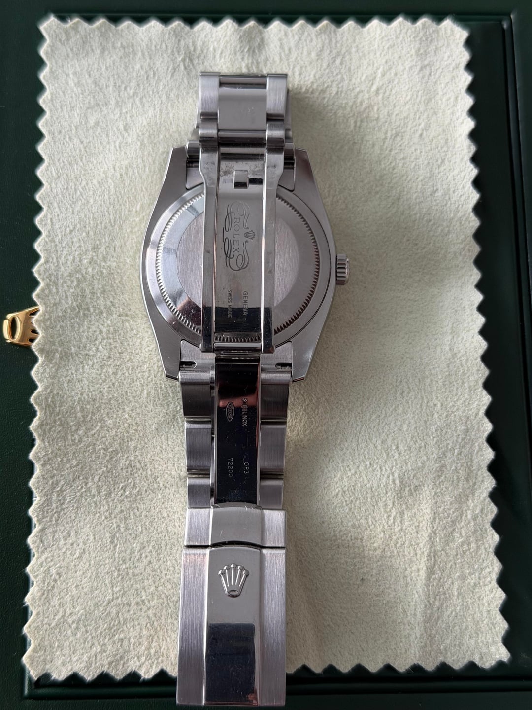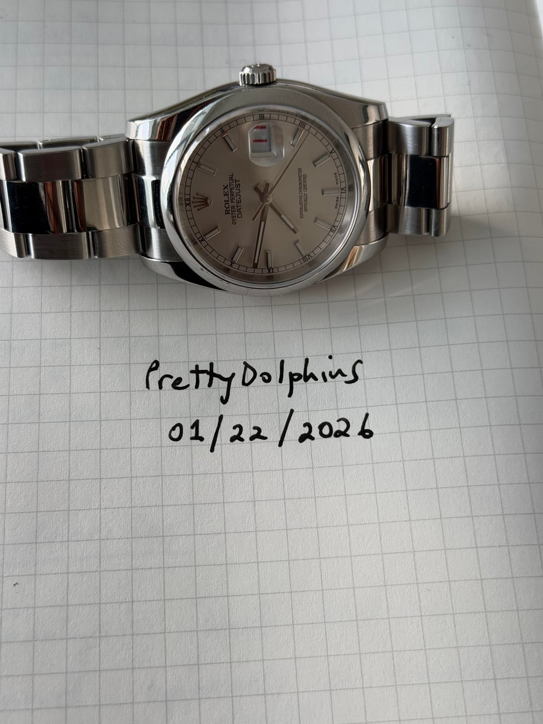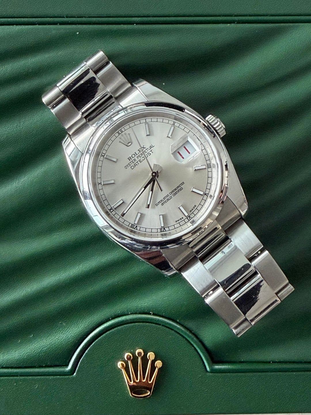 I am selling my Rolex Datejust 36 ref. 116200, full set, (2005-2006) Reference: 116200 Datejust 36, Oystersteel, smooth bezel, automatic calibre 3135, 100m water resistance, sapphire crystal with cyclops date. Year: 2005-2006 Size: 36 mm case, classic Datejust proportions with slightly beefier lugs vs earlier 5‑digit references. Dial / bracelet: Silver and Oystersteel bracelet Original inner and outer box July 2006 Dated Papers Condition: Excellent condition, Lightly used and worn carefully. Minor cosmetic scratches. Never polished Case and bracelet show light, honest wear but have never been polished (strong lines, crisp lugs and bezel edges) All functions working as they should; date flips cleanly at midnight Price: $7,100 Payment: Zelle or bank wire Shipping: Fully insured, tracked shipping. I will ship within 1 business day of cleared funds and provide tracking immediately Location: Downtown Los Angeles, CA. Happy to do a safe, in-person deal at a public place or reputable jeweler if local. Please comment here before PM. Happy to FaceTime for more verification processes.