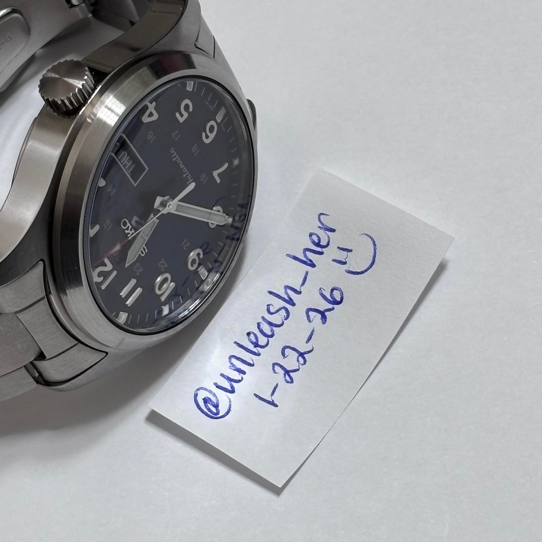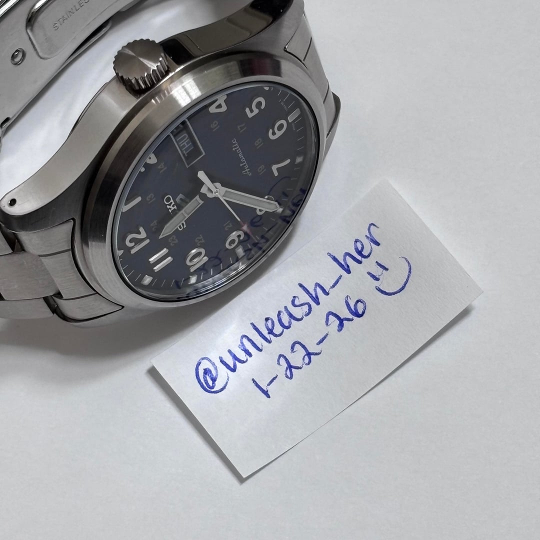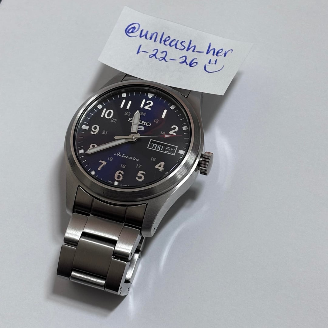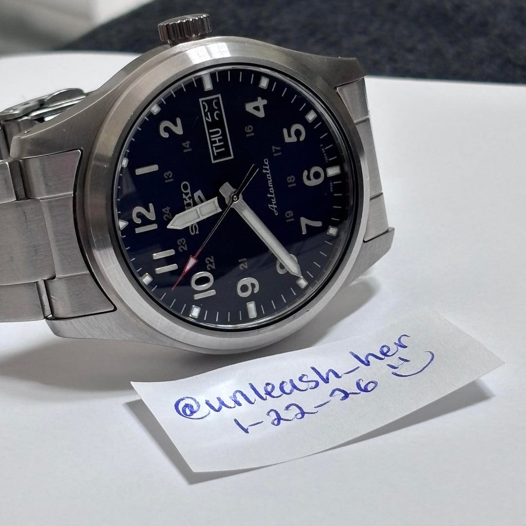 Really fun Seiko field watch with a stainless steel bracelet and a blue dial that pairs well with almost anything. The domed crystal has a very small micro scratch near the 2 o’clock marker that is difficult to notice. The case and bracelet show normal wear consistent with regular use. The bracelet is currently sized on the smaller end at approximately 6 to 6.5 inches, though most buyers will likely wear this on a strap. This watch does not include the box or extra links. Price: $125 shipped Payment: Venmo or PayPal Friends and Family with no notes, emojis 🐼 are fine! Shipping: USPS Ground Advantage