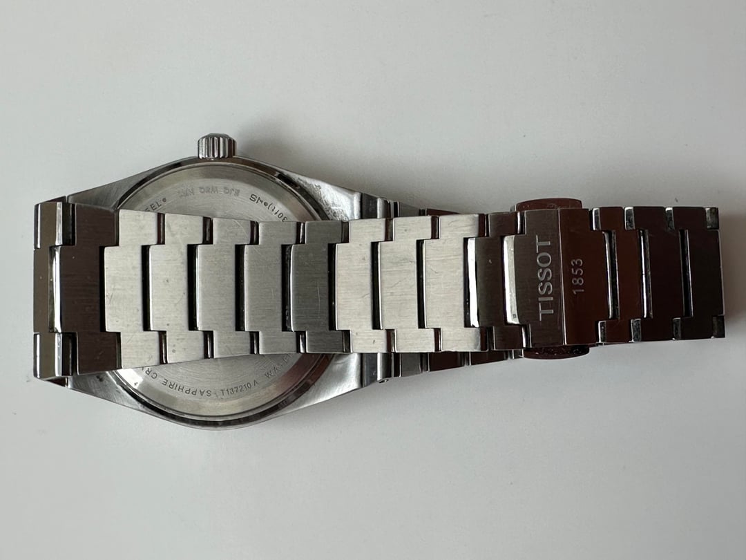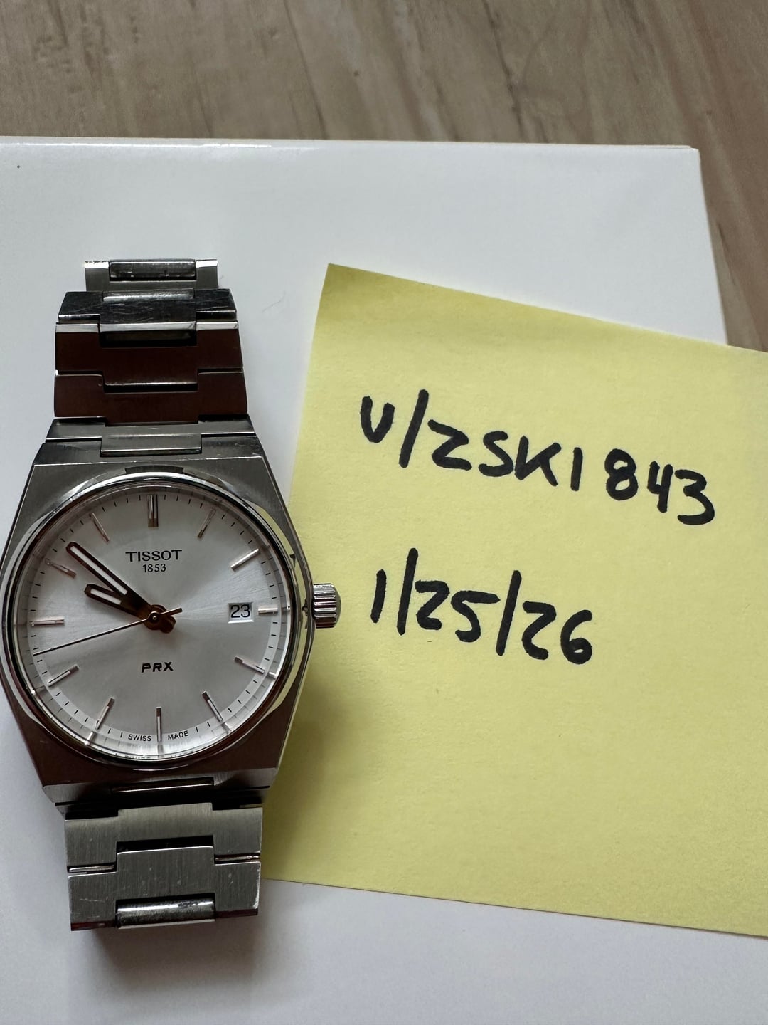 Selling my Tissot PRX Quartz 35mm Key Details: • Model & Size: Tissot PRX 35 mm, reference T137.210.11.031.00 (Quartz)  • Movement: Swiss Quartz, accurate and low maintenance  • Case & Crystal: 316L stainless steel case (tonneau shape), sapphire crystal, water-resistant to 100 m (10 bar)  • Bracelet: Integrated stainless steel with quick-release system for strap changes  • Dial: Silver-tone, minimal branding, date at 3 o’clock, luminous stick indices (bronze/gold-tone) • Condition: Good but shows that it’s been worn and appreciated. The crystal is perfect. The bracelet has scuffs from regular wear on it. Could truly use a polishing. Works perfect, brand new battery installed 8/19/25. Does not include box or papers. Does not include extra links. The condition is fully visible on the images. Seriously, be mindful of the condition here, it’s very clearly been worn and well loved. • Price - $160 shipped to CONUS. PayPal F+F or Zelle.