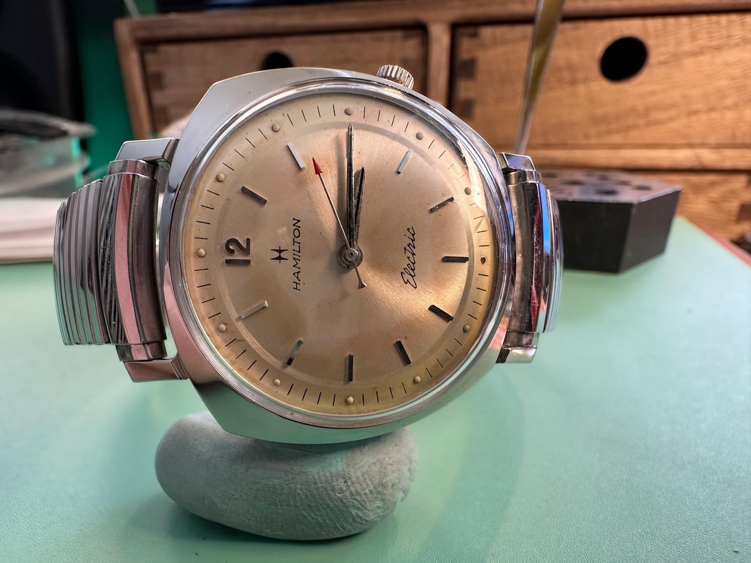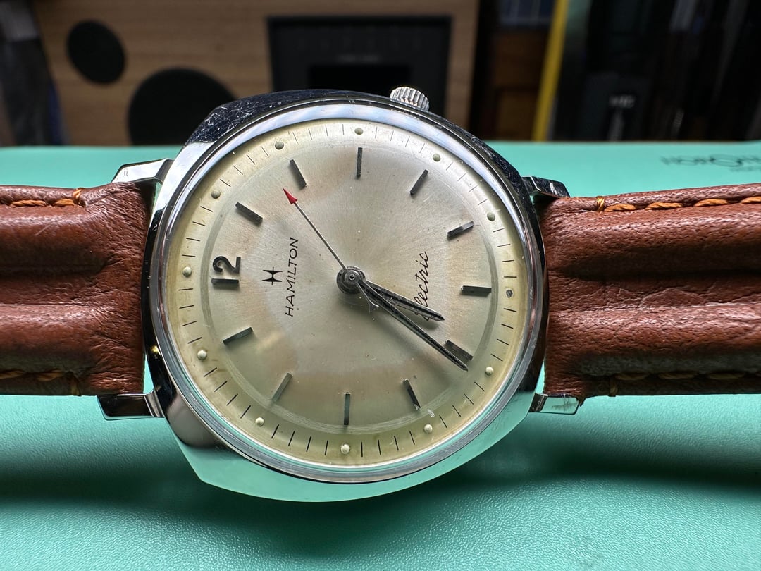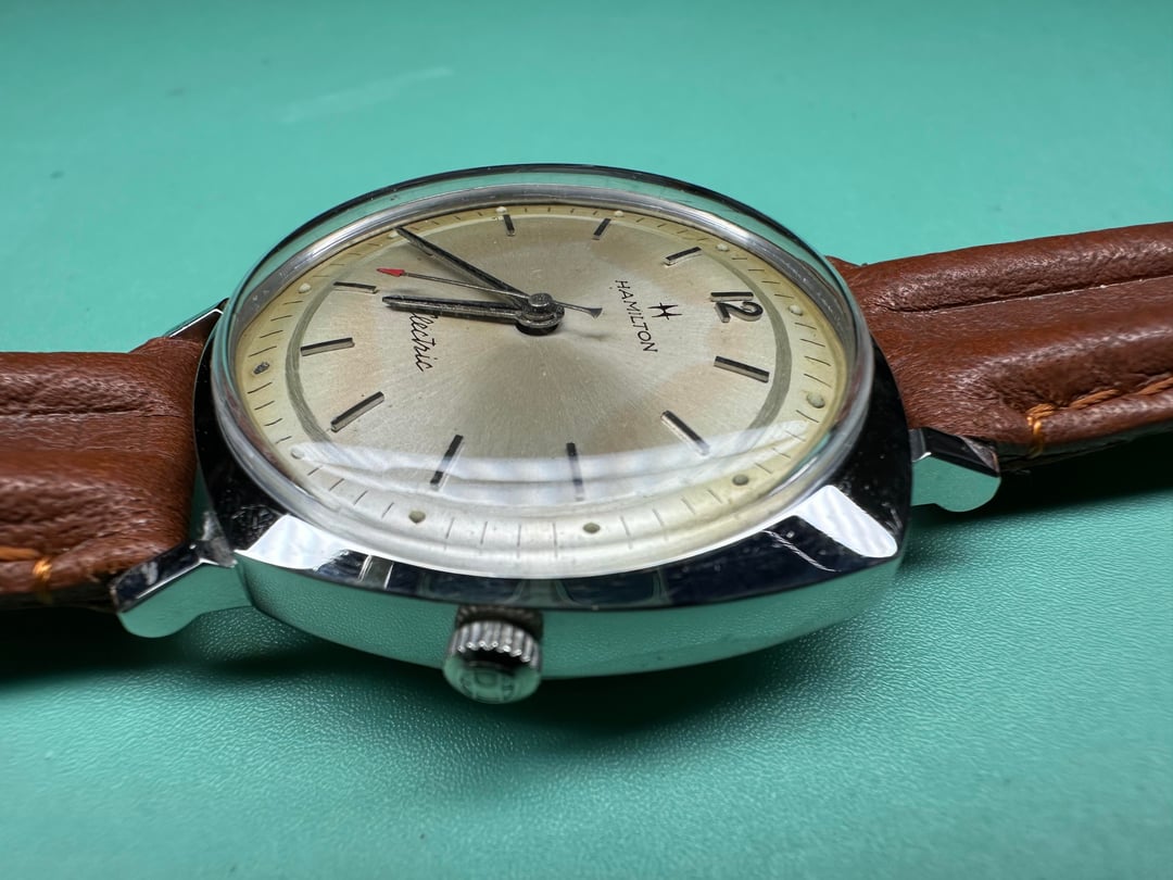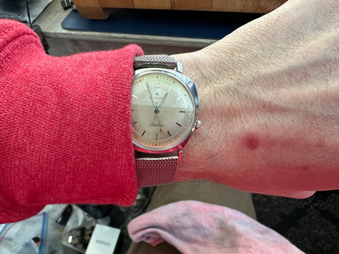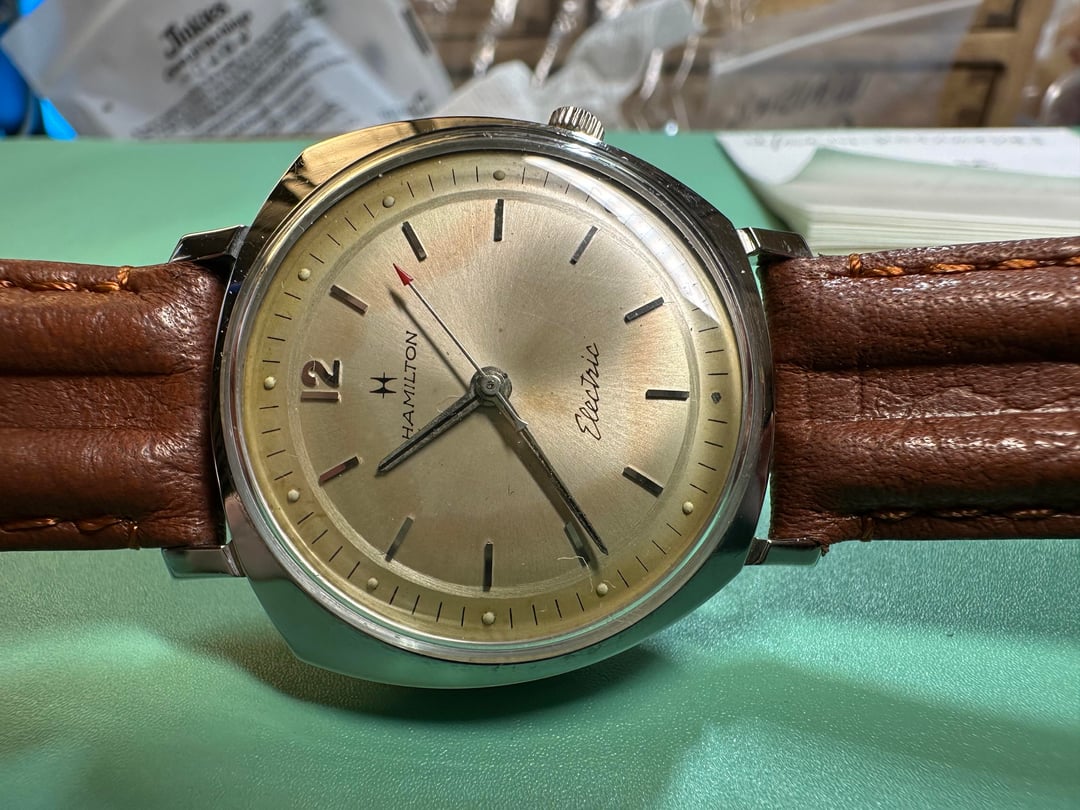 **The Story** This is a Hamilton Sea-Lectric II, originally released circa 1962. It features the famous asymmetric stainless steel case designed by Richard Arbib and was manufactured by the Star Watch Case Company in Lancaster, PA. While the exterior is pure 1960s "Space Age" cool, the internals have been upgraded for the modern era. **The Movement Upgrade** The original, notoriously finicky electric movement has been replaced with a high-quality Swiss Ronda quartz movement. While purists may prefer the original, this conversion makes the watch a significantly better daily wearer. • Worry-Free Reliability: This Ronda movement keeps near-perfect time and is extremely durable compared to the original 505 electric movements. • Easy Maintenance: It runs on a standard 371 (SR920SW) silver oxide battery. These are inexpensive and available at almost any drugstore. • Authentic Aesthetic: The stainless steel case (Ref. P575700), original dial, and red-tipped seconds hand are all preserved. **Premium Longines Bracelet** This watch comes paired with a leather strap and two Speidel bracelets. However, I also have a Longines period-correct Milanese mesh bracelet. It features the iconic "winged hourglass" logo embossed on the textured clasp. These high-quality vintage mesh bracelets are highly collectible on their own and provide an industrial look that perfectly matches the stainless steel case. I’d ask for $99 if that is to be included. **Quick Specs** • Case Material: Stainless Steel (Star W.C. Co.) • Case Reference: P575700 • Movement: Ronda Swiss Quartz (Conversion) • Lug Width: 18mm • Battery Type: SR920SW / 371 • Bracelet: Vintage Longines Mesh with winged hourglass logo **Payment & Shipping** $399 shipped in CONUS without Longines mesh. Accepted: Venmo or PayPal Friends & Family (F&F). PayPal G&S: Accepted only if you have at least five (5) confirmed transactions on r/WatchExchange, and you must add an additional 5% to cover the fee.