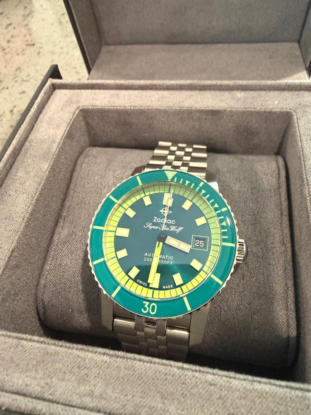 For sale is my Zodiac Super Sea Wolf - ZO9310. \-A few blemishes on the clasp, but otherwise the watch is pristine. The box does have some knicks on it which I have taken photos of. \-I only wore it on maybe 5 occasions over the last 2 months or so. I had every intention of keeping it, but it just doesn't go with most of my everyday attire. \-Currently sized for a 7-ish inch wrist, and extra links are included. \-It came with documentation for the pineapple dream watch (card, and cool little patch) which is also included. But I don't think it goes with this ref# technically. \-$450 shipped; price is firm right now. \-Please let me know if you have any questions, and I hope it finds a new home!
