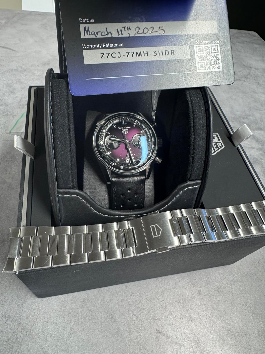 \-Tag CBS2219.FC6607 Smokey Purple Carrera 39mm watch fits 6" and up perfectly! \-Includes tag box, warranty card, informational booklet, black racing strap with infinitely adjustable deployant and extra tag flat bracelet. \-This is super new 2025 unit! \-Lovely condition. Bracelet has been worn a handful of times. Has mostly lived on the strap. Happy to facetime for further condition checks. \-Competitively priced, All current US based listings go for 6+ without the additional bracelet. Asking a firesale price of $4975 shipped - this is a limited time no-haggle price (no trades) as a grail has just opened up for me. While I ship anywhere in CONUS Sig Required fully insured, I am also available to in person buyers in Chicago area. Available for facetime to check out the watch as well. Please see my extensive history on this platform, including recent sales of a Moser Pioneer, Zenith Chronomaster Sport, No Time to Die, Pelagos, white speedmaster, and many others. I have ebay and other references available as well timestamp in image carousel