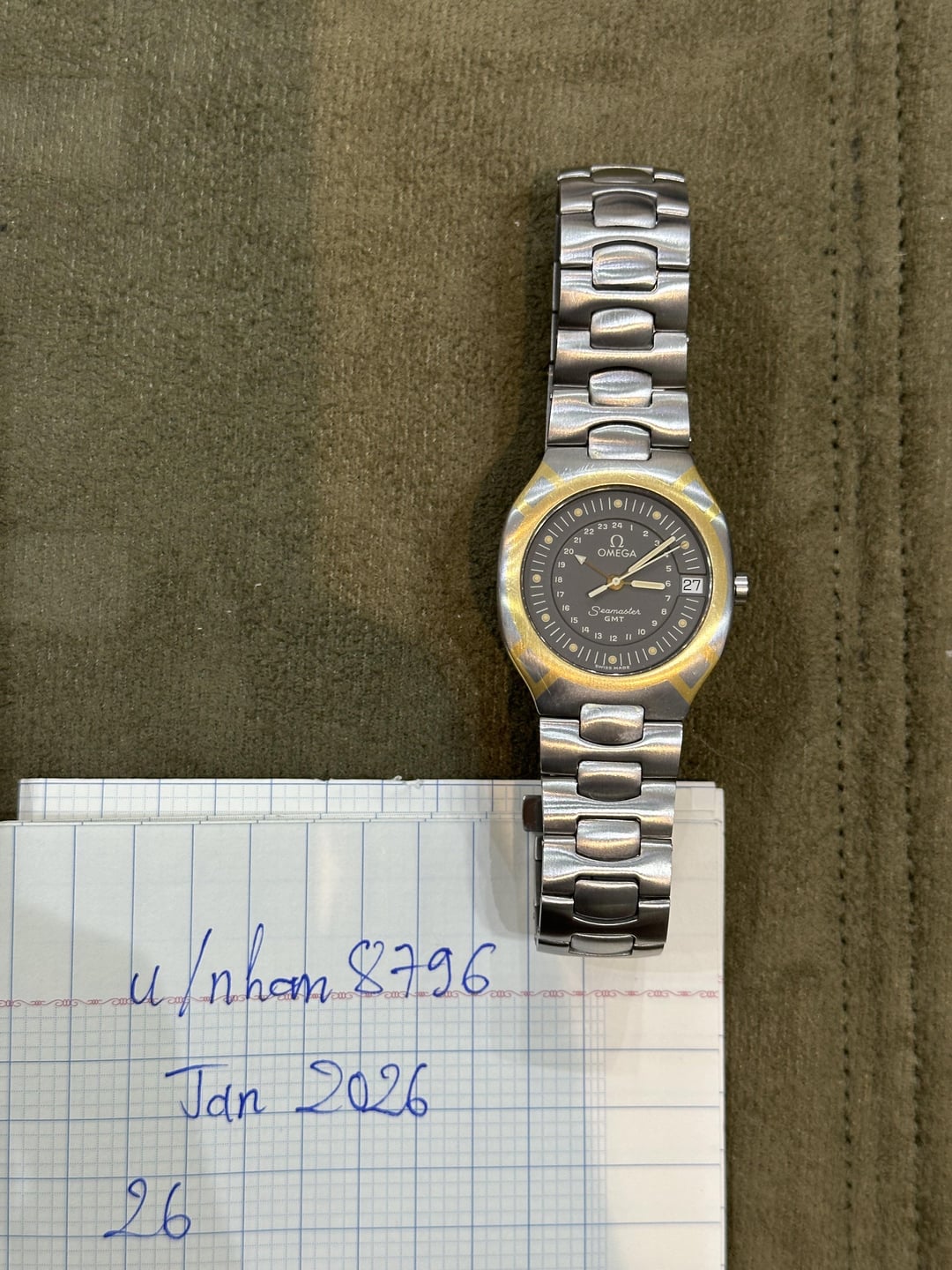 Hi all, Letting go of an Omega Seamaster Polaris GMT quartz, ref. 396.1122. Classic late-80s / early-90s Omega design with the iconic 18K gold accents. The watch is 100% original, in excellent overall condition. Dial is very clean and untouched, hands and markers match nicely. Quartz movement is running properly and keeps time as it should. Specs: • Reference: 396.1122 • Case: Stainless steel with solid 18K gold accents • Case size: 32mm (wears balanced, very comfortable) • Dial: Original grey dial, flawless condition • Movement: Omega quartz GMT • Functions: Time, date, GMT • Bracelet: Original Omega bracelet, fits up to ~18cm wrist Condition: • Excellent condition overall • Dial is flawless • Case and bracelet show only light, honest wear • No polishing abuse, lines still sharp • Everything original Price: $799 (Includes shipping, serviced, and tariff covered) Shipping: Worldwide via UPS/DHL Payment: PayPal F&F or G&S (+4.5% paid by buyer) No trades at this time Feel free to ask any questions.