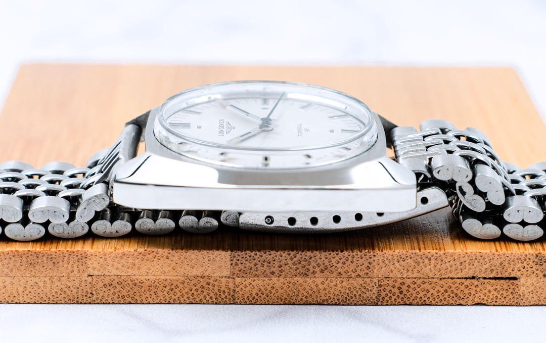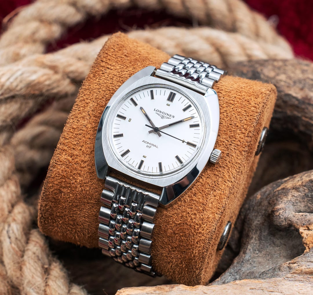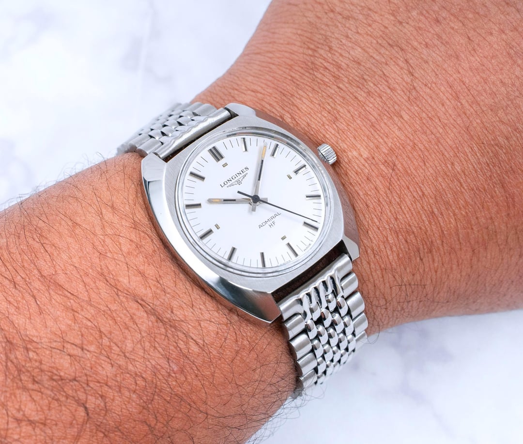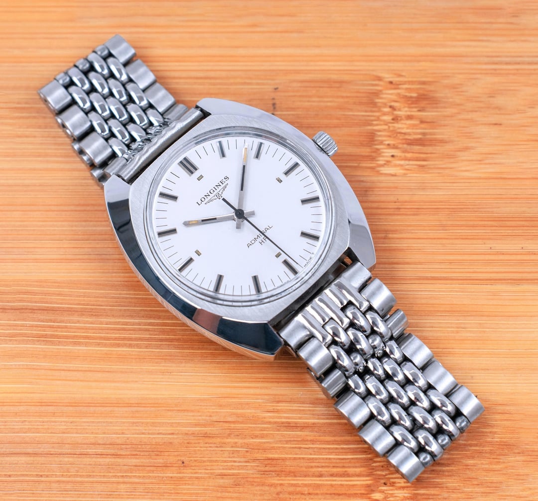 A very rare Longines Admiral HF (High Frequency) Mechanical watch in great condition. A special edition made for the 1972 Munich Olympics as engraved on caseback. Stunning satin White sunburst dial with raised indexes. Robust oversized beefy sharp cushion case. Solid build quality. Creative design on the piece makes it a conversation piece. In an era of inflated prices of modern sports watches, this is a bargain. A classic. Signed crown. Movement has been serviced. Great time keeping. Amazing condition, ready to be used as a daily driver. Such pieces should be appreciated upfront to experience at full measure, pictures don't do justice to it. Sunlight brings out most of its beauty. Professionally polished keeping all the sharp brushed lines, edges and mirror finishing. A sporty dress watch. Comes with an aftermarket BOR (Beads of rice) bracelet, unsigned clasp, pairs well with the watch. I will also add a handmade leather strap with it. Great collectible. Handling it, I can definitely guarantee this is superior to modern watches of the same price zone. Longines is known to produce watches as classic as this, simple time only minimalistic dial yet sophisticated and complex high end movements. This example is a wonderful example of classic watch design. It is a design language that's timeless. Check my Instagram: [https://instagram.com/hour.lust](https://instagram.com/hour.lust) PRICE: $649 USD via Paypal, Wise, Crypto. FREE DHL 5 day shipping worldwide. Considering a full service has been done to the watch, I'm asking a reasonable price. I have a good number of exchanges here for a safe transaction * Reference number: 2303-1 * Case size: 37 mm (w/crown) * Lug to Lug size: 40 mm * Case thickness: 9 mm * Lug width: 18 mm * Longines Caliber 6942 High-frequency 28800bph movement Pics: [https://imgur.com/a/9mcGMWC](https://imgur.com/a/9mcGMWC) TS: [https://imgur.com/a/K4OeIrW](https://imgur.com/a/K4OeIrW)