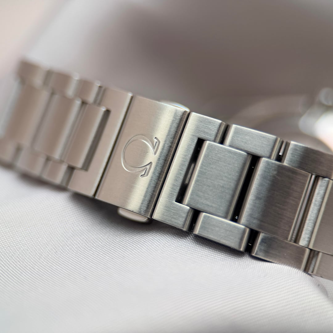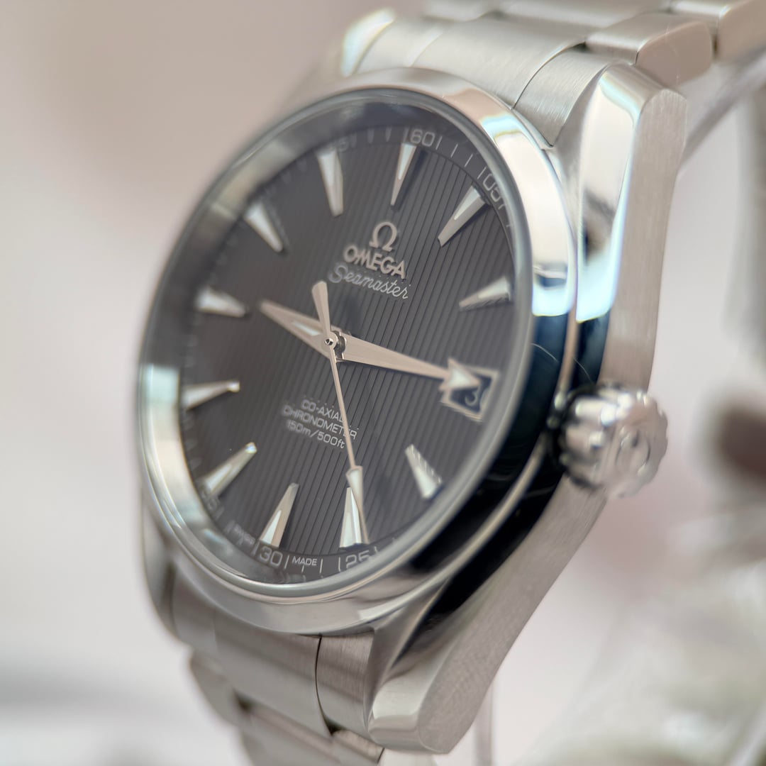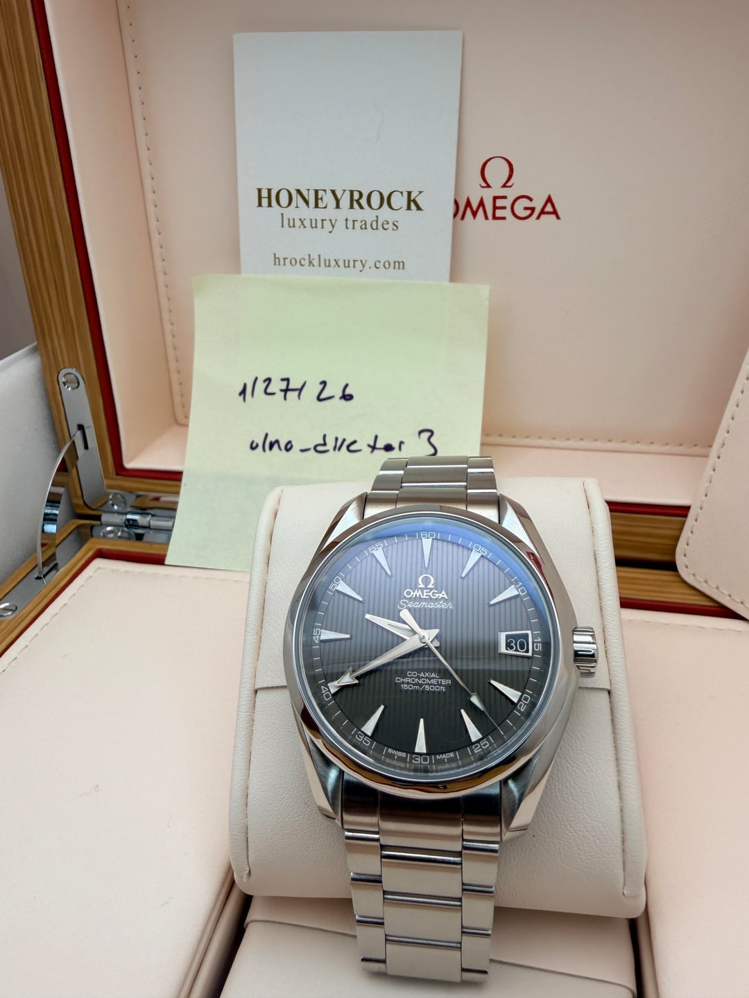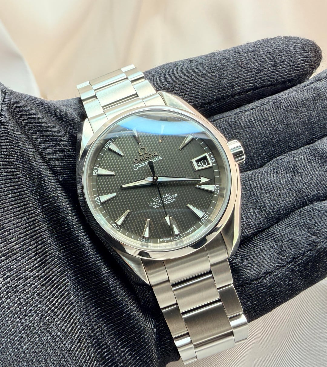 Omega Seamaster Aqua Terra 38.5mm – “Grey Skyfall Teak Dial” Ref. 231.10.39.21.06.001 | 2020 | Full Set | Excellent Price: 4150 + ship CONDITION This example is in miny condition, showing virtually no signs of wear. The grey teak “Skyfall-style” dial is crisp, clean, and beautifully preserved — a rare find, especially for a discontinued 38.5mm model. Bracelet fits up to 18 cm . INCLUDES Full Set — outer box, inner wooden box, operating instructions, all cards (warranty/pictogram/master chronometer), card holder, and bracelet links. ⸻ ABOUT THIS WATCH This 2020 Aqua Terra 38.5mm features the highly sought-after grey teak “Skyfall” dial, a colorway now discontinued and increasingly difficult to source in this condition. The horizontal teak pattern gives the dial a refined yet sporty character, shifting beautifully between charcoal, silver, and slate depending on the light. Inside beats Omega’s in-house Calibre 8500 Co-Axial, offering a smooth 60-hour power reserve, twin-barrel architecture, and strong anti-magnetic resistance. The proportions of the 38.5mm case make it one of the most versatile Aqua Terra sizes ever produced — comfortable, balanced, and perfect for daily wear. Collectors value this reference for its combination of wearability, dial aesthetics, and discontinued status, making well-preserved full-set pieces especially desirable.
