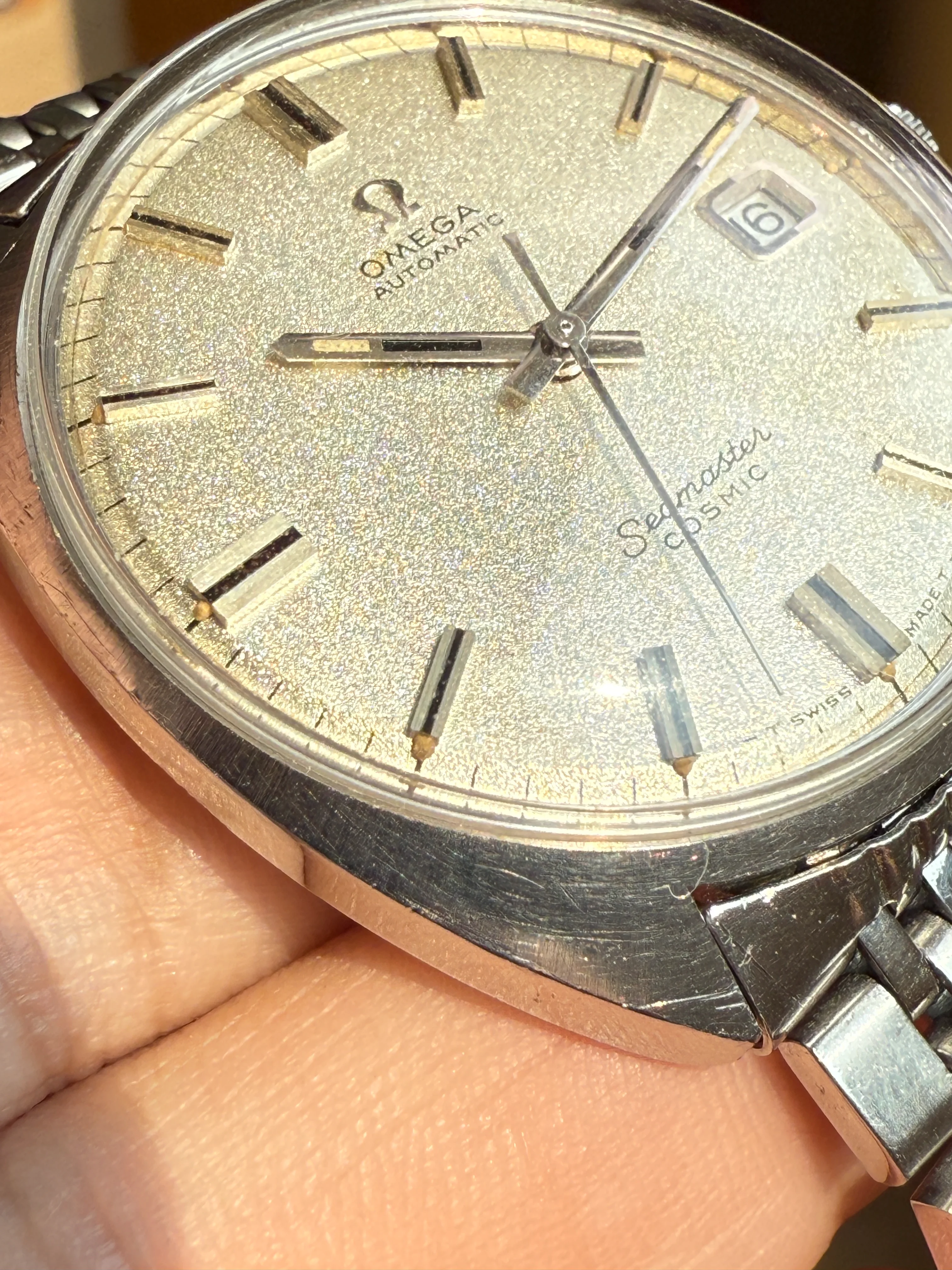 A very nice stainless steel Omega Cosmic 166.026, 35mm, yellow-tone sand dial, black painted hour markers with lume, original Omega 1503/523 bracelet (19 links).