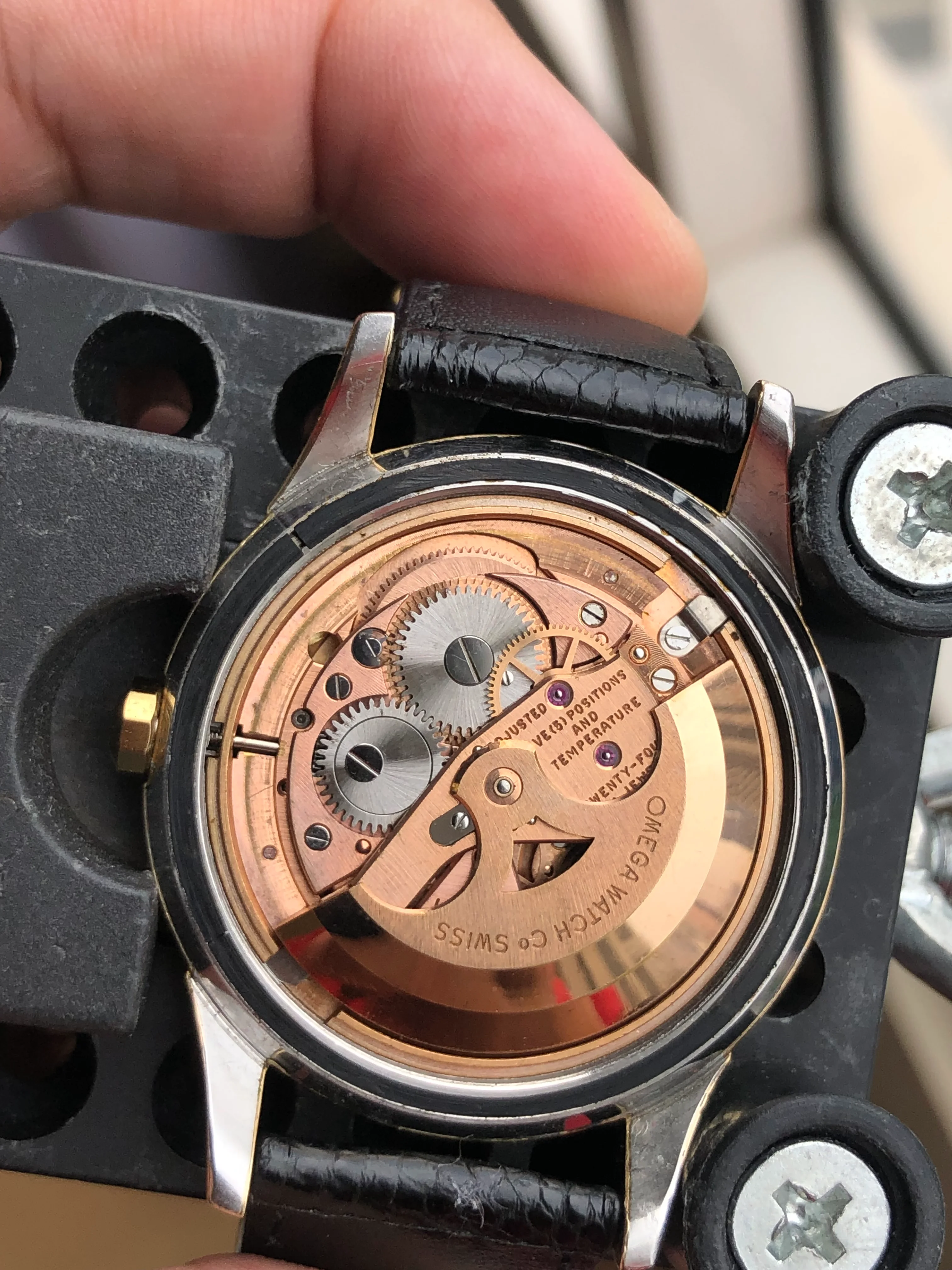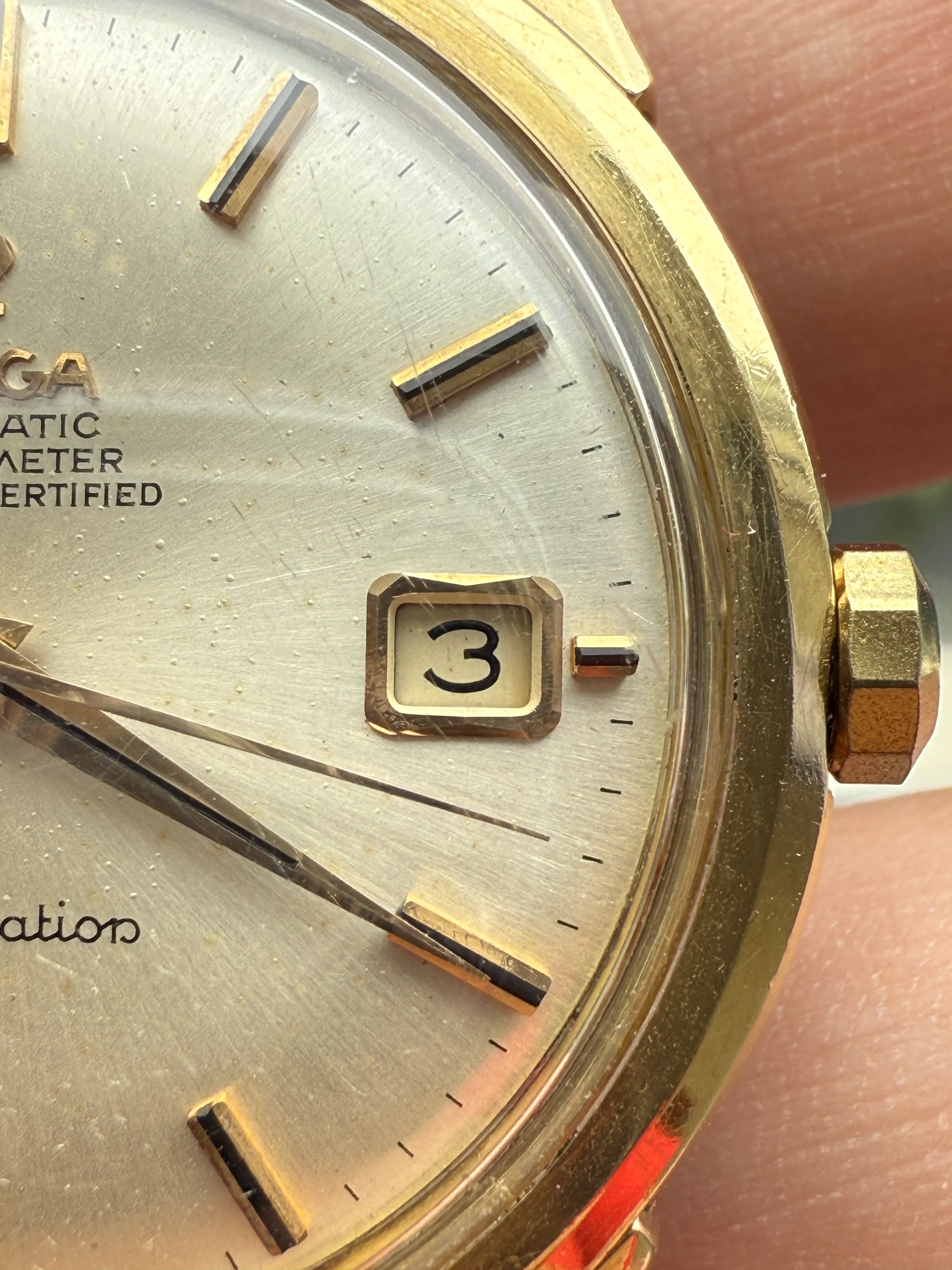 - Dial: Original white aged dial with evenly distributed small spots, applied Omega logo, onyx inserted hour markers, dauphine hands, faceted date-aperture frame at 3; prints, hands and hour markers are all good.