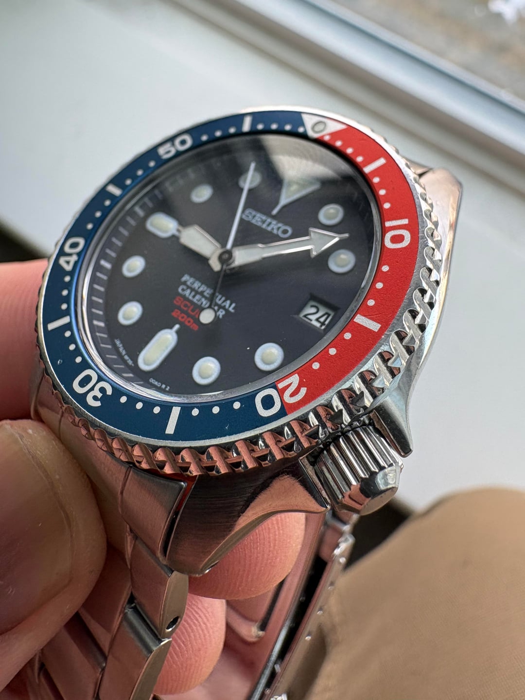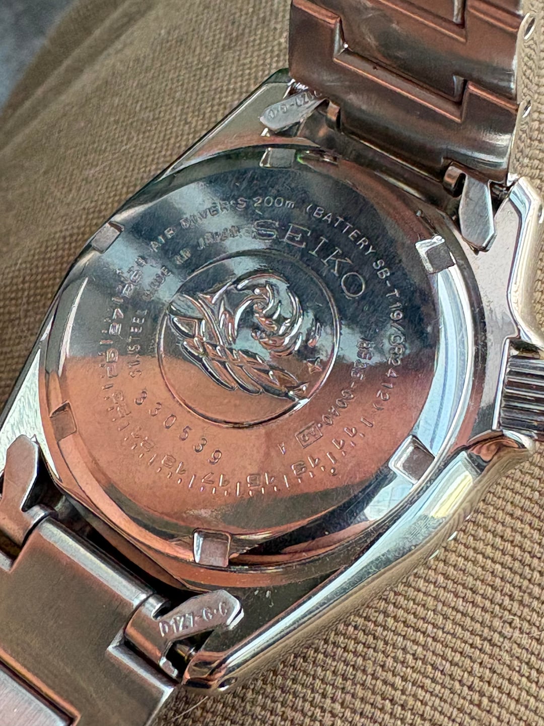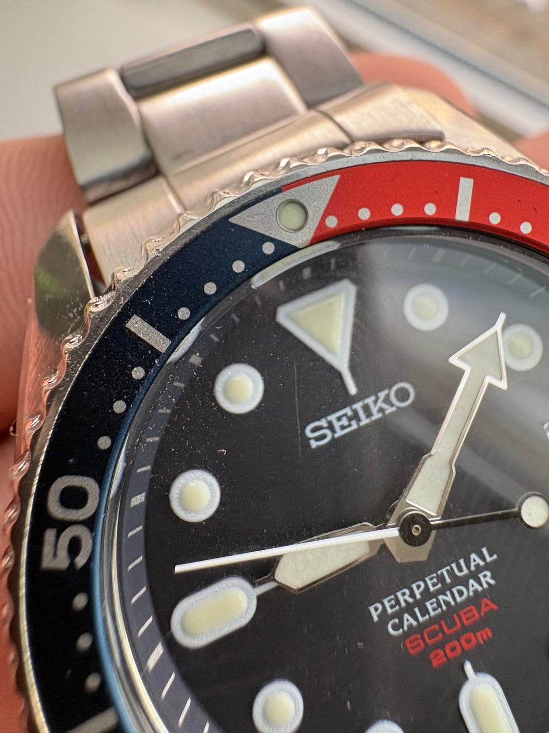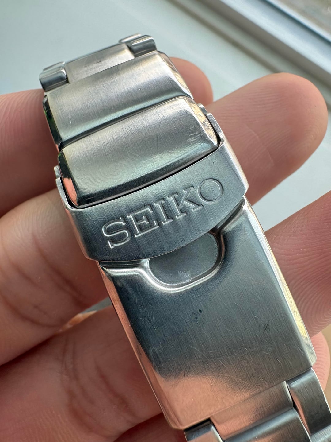 I bought this in near mint condition from Japan. There is a scratch on the crystal as pictured near the “S” of the Seiko under the 12oclock lume plot. A couple of hairline scratches on the bracelet. The watch is fit for a 7.25” wrist atm, and has no extra links with it. Small bezel scratches at minute markers 3,7,15,22,31. The battery has an 8-year lifespan, with the next replacement due in 2029. Asking $700 shipped CONUS. Paypal FF or Venmo. PM for any more details.