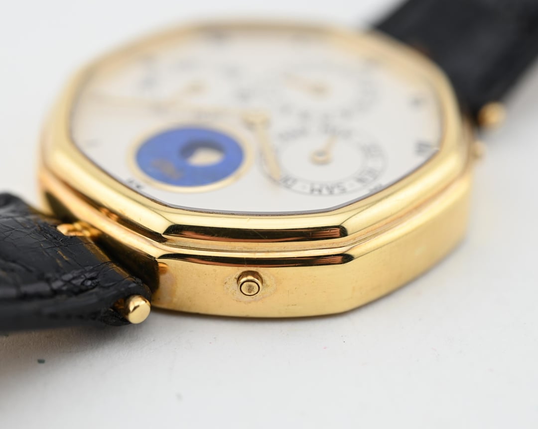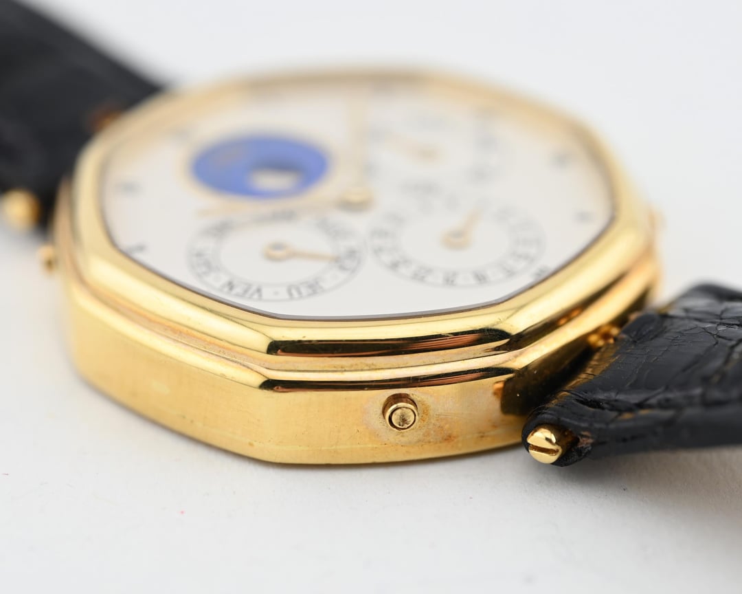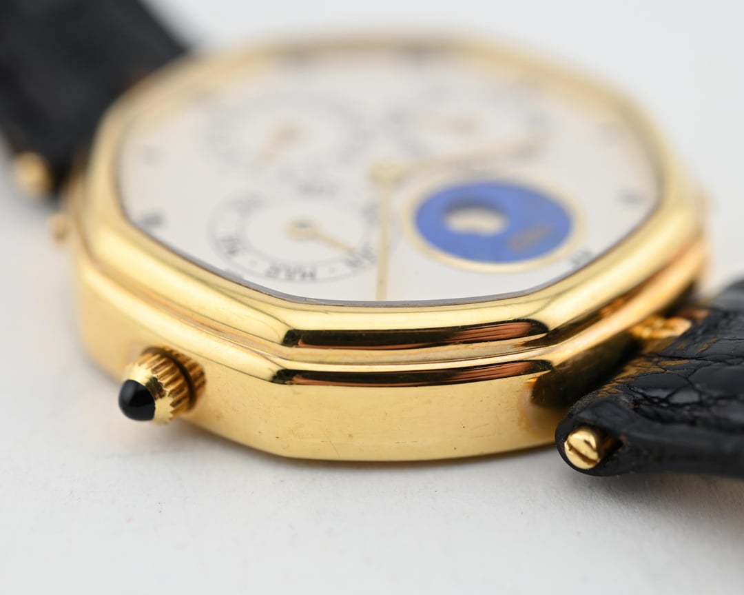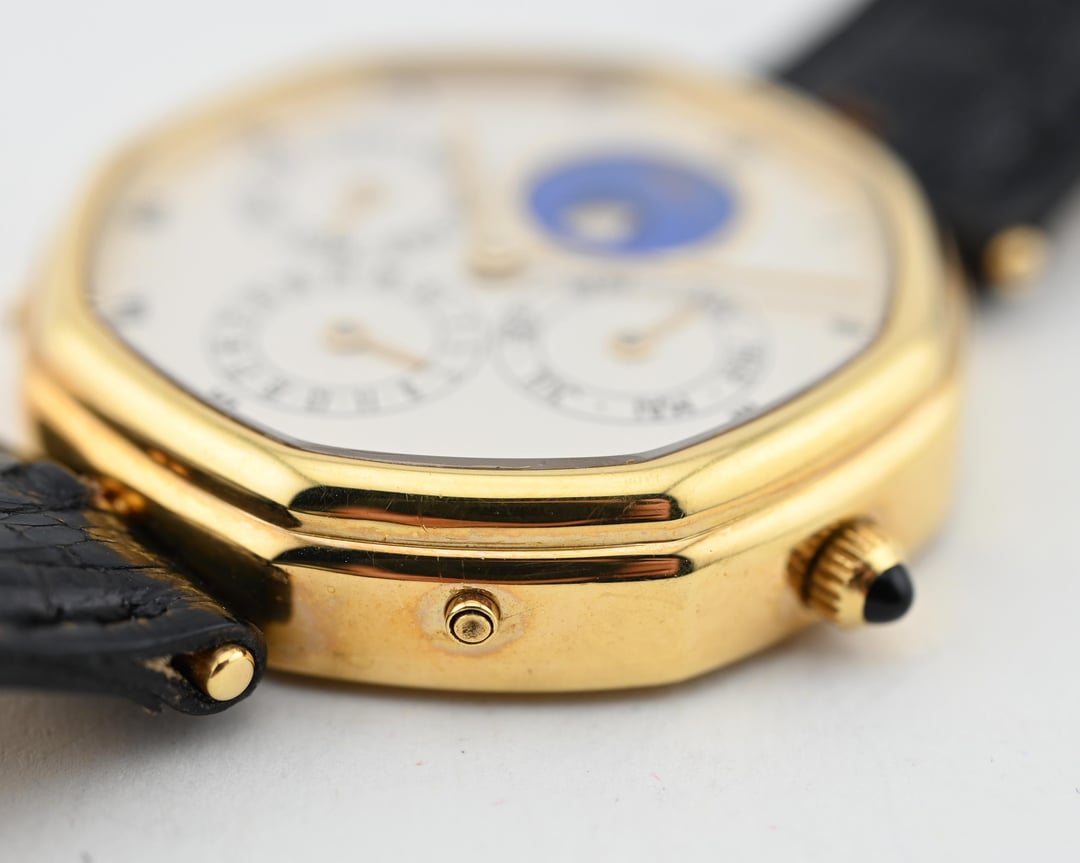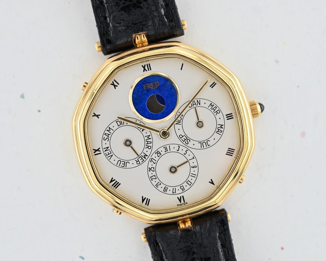 If you are looking for a serious horological complication with serious pedigree and style consider this Gerald Genta ref. G1840.4 perpetual calendar in a 34.5mm 18k yellow gold lugless case which wears exceptionally well. The movement is an automatic, perpetual calendar based off a F. Piguet cal. 71 movement with a module added for the complication. The watch dates to approx. 1985 and features an opaline dial with applied gold numerals and a stunning lapis lazuli moonphase. What makes this watch *really* special is the fact that is completely devoid of Gerald Genta branding and instead is signed "Fred" both on the dial and on the caseback. The case is full and the hallmarks are sharp. The Fred brand refers to a Parisian jeweler founded in 1936 which was bought out by LVMH in 1995. It was at one time a supplier to the royal family of Monaco. **Reference:** Gerald Genta for FRED Reference G1840.4 **Case:** The 34 x 34 x 7.9 mm solid yellow gold octagonal case is in very good condition throughout with well defined stepped bezel, vertices, and caseback engravings. **Dial:** That opaline white dial has a slight warmth and richness to it and extremely fine texture that provides a real richness that really pulls you into the dial. The calendar apertures are laid out in a very classis manner, offset by the gold applied surround of the Lapiz Lazuli moon phase window. The dial and hands are in very good condition exhibiting only minor wear near the “VI” hour marker. **Movement:** The Frederic Piguet caliber 71 derived movement is modified a module for full perpetual calendar functionality. The watch is winding, setting, and running well at approximately -7 s/d, averaged across 6 positions. **Includes:** The watch is presented on an aftermarket alligator strap measuring 70 x 115 and original buckle in very crisp condition. **Price:** $10,850 USD including fully insured shipping from Phoenix, AZ to a FedEx Office location or commercial address within the continental US, international shipping available at cost based on location. Payment by ACH or wire, no trades please. I have all positive references here, [Chrono24](https://www.chrono24.com/dealer/meticulist/index.htm), forums, and [Instagram (@)meticulist](http://instagram.com/meticulist). All available watches can be found at [meticulist.net](http://meticulist.net/)