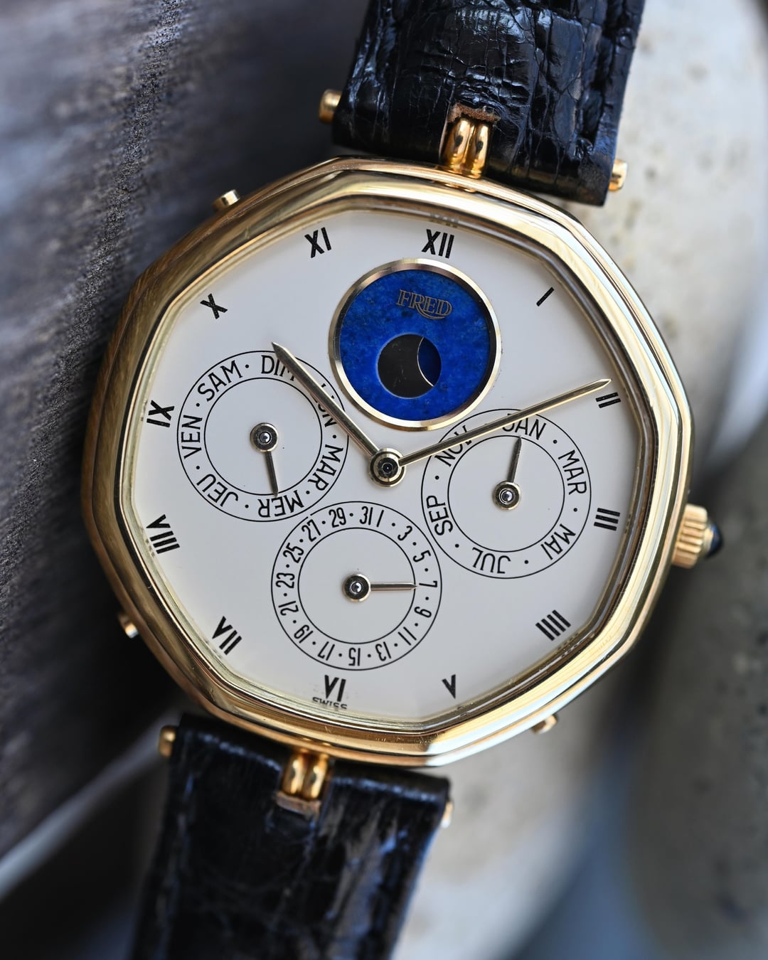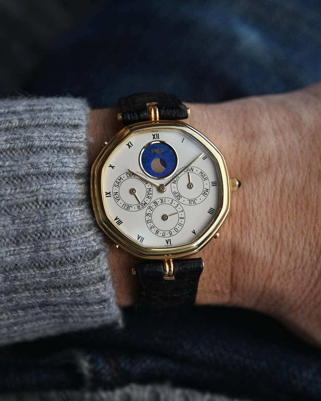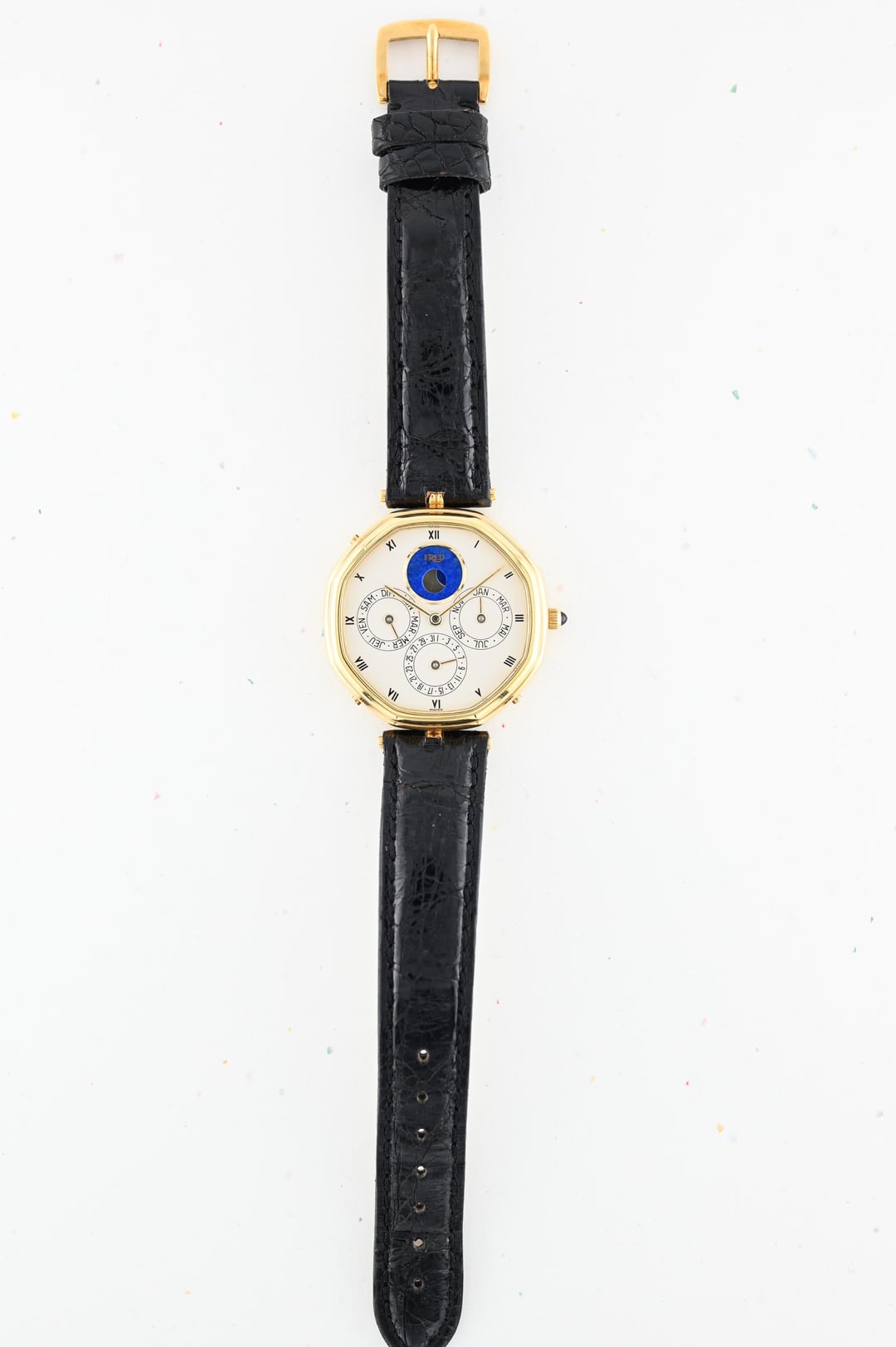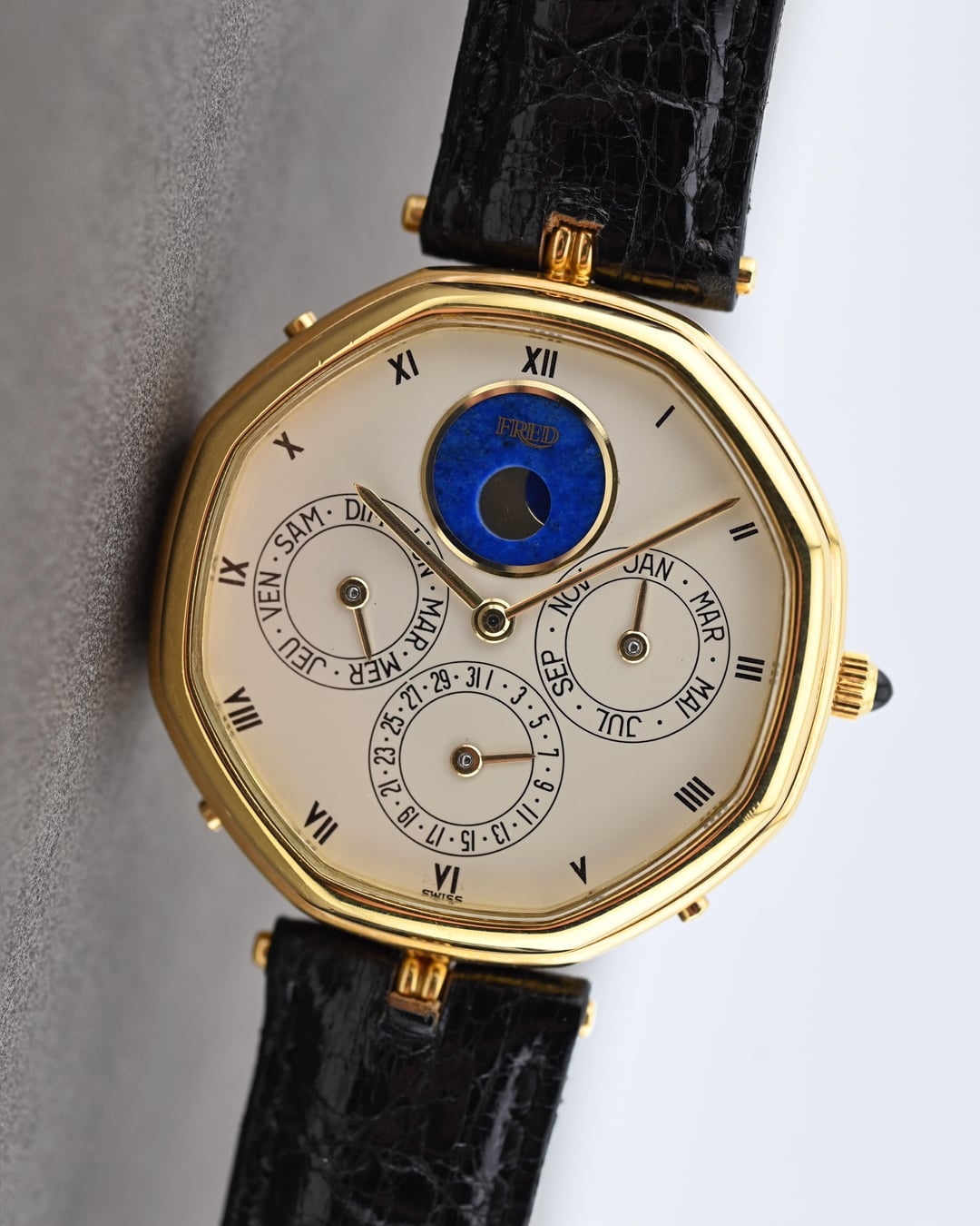 If you are looking for a serious horological complication with serious pedigree and style consider this Gerald Genta ref. G1840.4 perpetual calendar in a 34.5mm 18k yellow gold lugless case which wears exceptionally well. The movement is an automatic, perpetual calendar based off a F. Piguet cal. 71 movement with a module added for the complication. The watch dates to approx. 1985 and features an opaline dial with applied gold numerals and a stunning lapis lazuli moonphase. What makes this watch *really* special is the fact that is completely devoid of Gerald Genta branding and instead is signed "Fred" both on the dial and on the caseback. The case is full and the hallmarks are sharp. The Fred brand refers to a Parisian jeweler founded in 1936 which was bought out by LVMH in 1995. It was at one time a supplier to the royal family of Monaco. **Reference:** Gerald Genta for FRED Reference G1840.4 **Case:** The 34 x 34 x 7.9 mm solid yellow gold octagonal case is in very good condition throughout with well defined stepped bezel, vertices, and caseback engravings. **Dial:** That opaline white dial has a slight warmth and richness to it and extremely fine texture that provides a real richness that really pulls you into the dial. The calendar apertures are laid out in a very classis manner, offset by the gold applied surround of the Lapiz Lazuli moon phase window. The dial and hands are in very good condition exhibiting only minor wear near the “VI” hour marker. **Movement:** The Frederic Piguet caliber 71 derived movement is modified a module for full perpetual calendar functionality. The watch is winding, setting, and running well at approximately -7 s/d, averaged across 6 positions. **Includes:** The watch is presented on an aftermarket alligator strap measuring 70 x 115 and original buckle in very crisp condition. **Price:** $10,850 USD including fully insured shipping from Phoenix, AZ to a FedEx Office location or commercial address within the continental US, international shipping available at cost based on location. Payment by ACH or wire, no trades please. I have all positive references here, [Chrono24](https://www.chrono24.com/dealer/meticulist/index.htm), forums, and [Instagram (@)meticulist](http://instagram.com/meticulist). All available watches can be found at [meticulist.net](http://meticulist.net/)