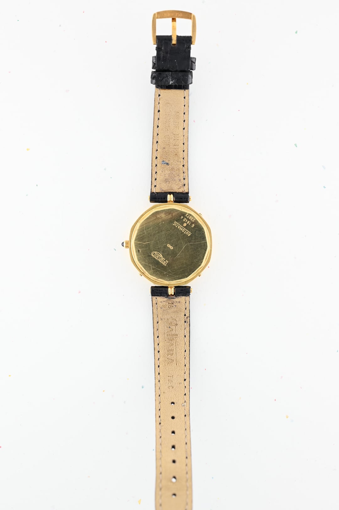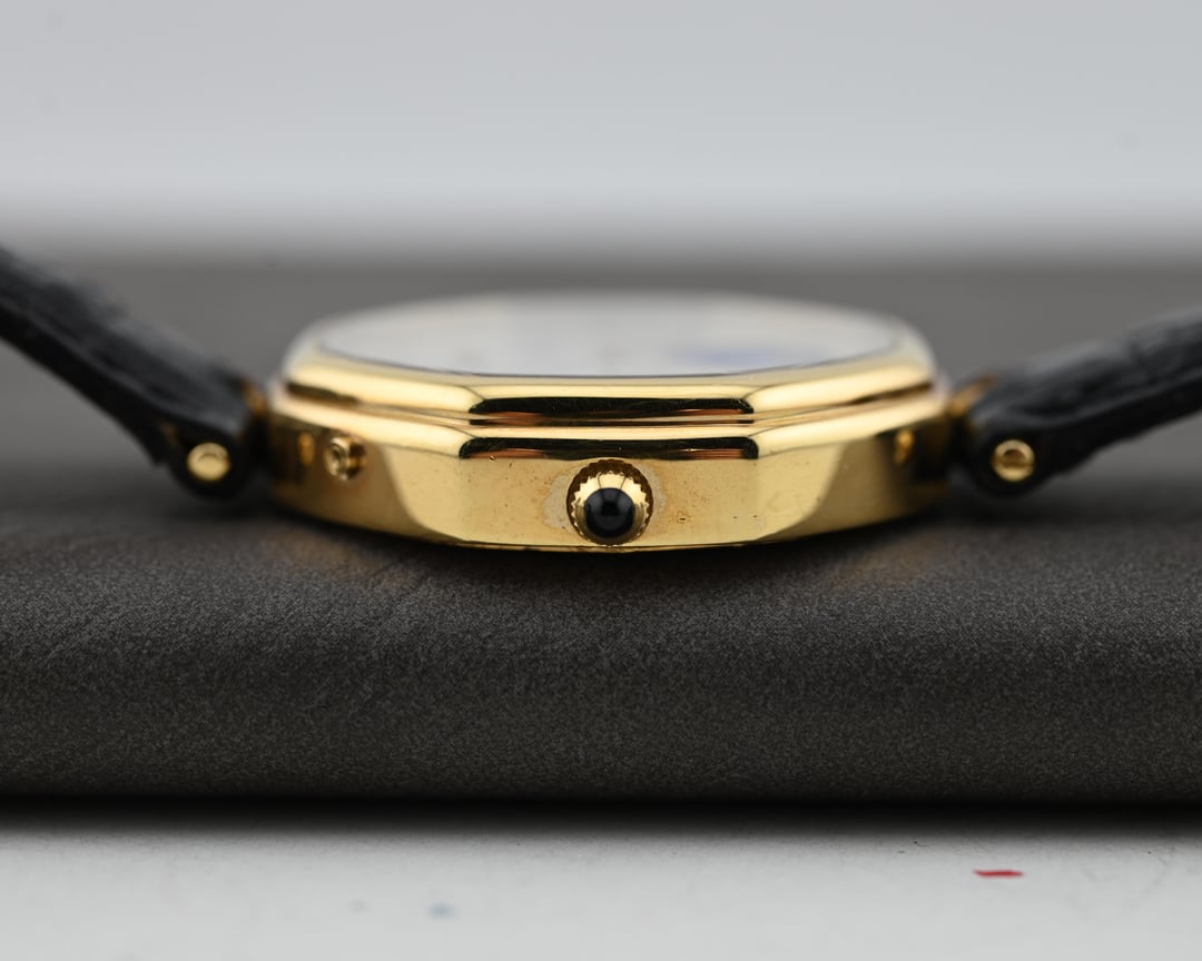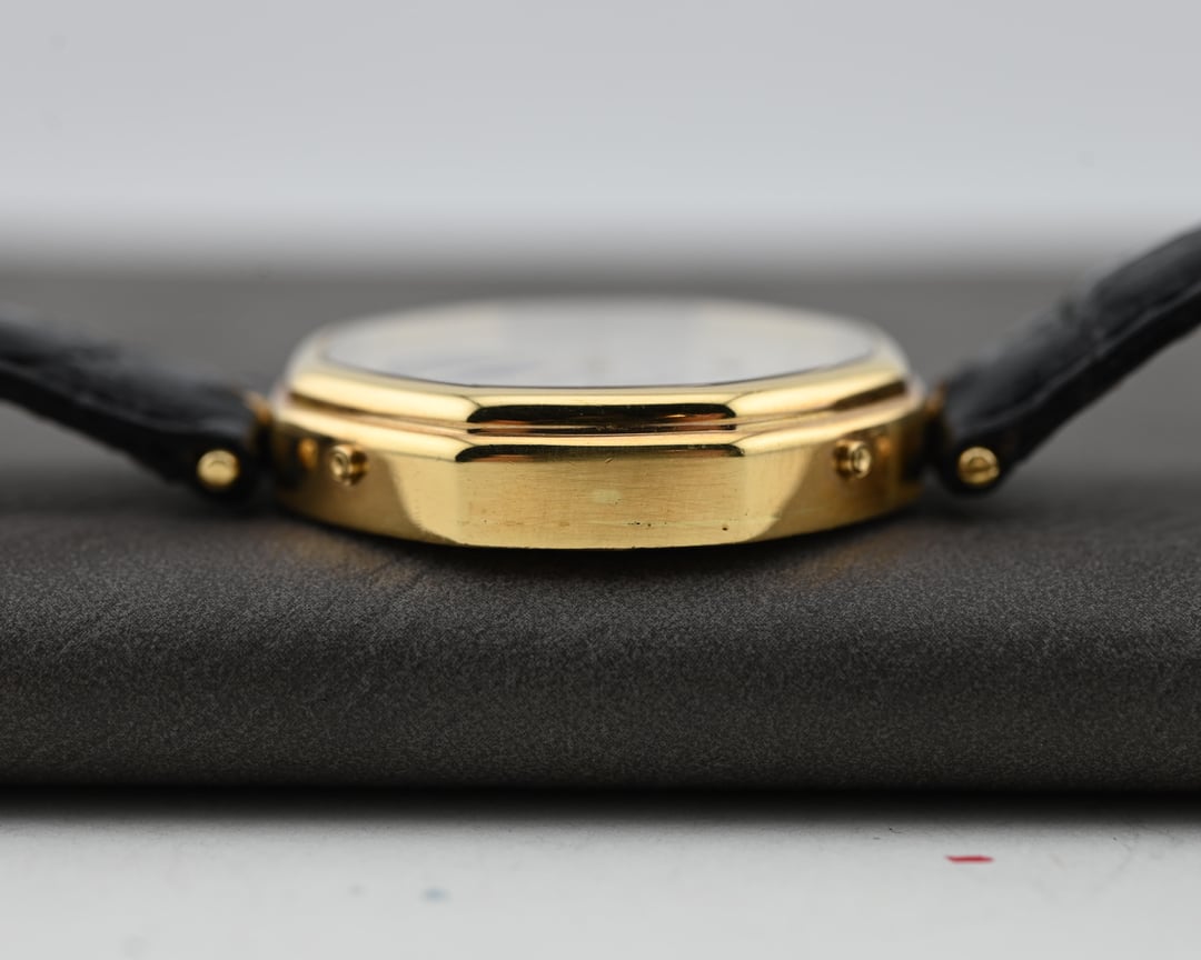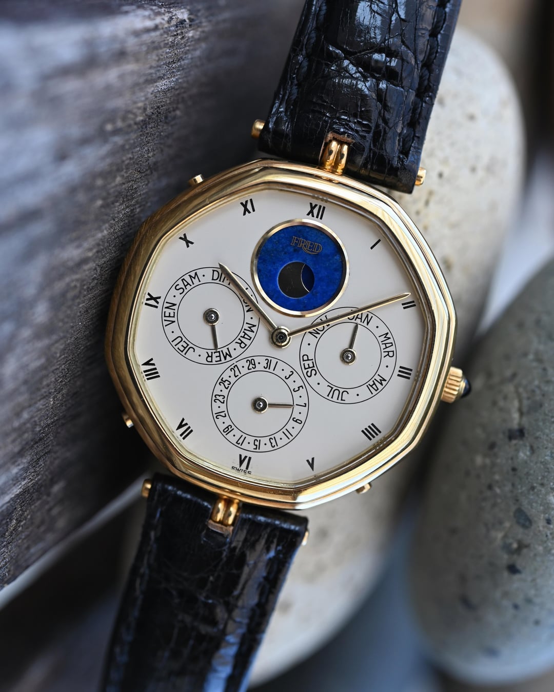 If you are looking for a serious horological complication with serious pedigree and style consider this Gerald Genta ref. G1840.4 perpetual calendar in a 34.5mm 18k yellow gold lugless case which wears exceptionally well. The movement is an automatic, perpetual calendar based off a F. Piguet cal. 71 movement with a module added for the complication. The watch dates to approx. 1985 and features an opaline dial with applied gold numerals and a stunning lapis lazuli moonphase. What makes this watch *really* special is the fact that is completely devoid of Gerald Genta branding and instead is signed "Fred" both on the dial and on the caseback. The case is full and the hallmarks are sharp. The Fred brand refers to a Parisian jeweler founded in 1936 which was bought out by LVMH in 1995. It was at one time a supplier to the royal family of Monaco. **Reference:** Gerald Genta for FRED Reference G1840.4 **Case:** The 34 x 34 x 7.9 mm solid yellow gold octagonal case is in very good condition throughout with well defined stepped bezel, vertices, and caseback engravings. **Dial:** That opaline white dial has a slight warmth and richness to it and extremely fine texture that provides a real richness that really pulls you into the dial. The calendar apertures are laid out in a very classis manner, offset by the gold applied surround of the Lapiz Lazuli moon phase window. The dial and hands are in very good condition exhibiting only minor wear near the “VI” hour marker. **Movement:** The Frederic Piguet caliber 71 derived movement is modified a module for full perpetual calendar functionality. The watch is winding, setting, and running well at approximately -7 s/d, averaged across 6 positions. **Includes:** The watch is presented on an aftermarket alligator strap measuring 70 x 115 and original buckle in very crisp condition. **Price:** $10,850 USD including fully insured shipping from Phoenix, AZ to a FedEx Office location or commercial address within the continental US, international shipping available at cost based on location. Payment by ACH or wire, no trades please. I have all positive references here, [Chrono24](https://www.chrono24.com/dealer/meticulist/index.htm), forums, and [Instagram (@)meticulist](http://instagram.com/meticulist). All available watches can be found at [meticulist.net](http://meticulist.net/)