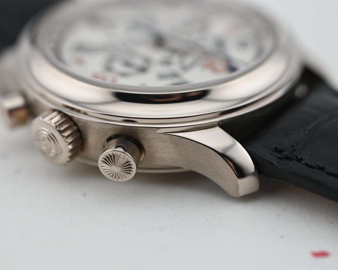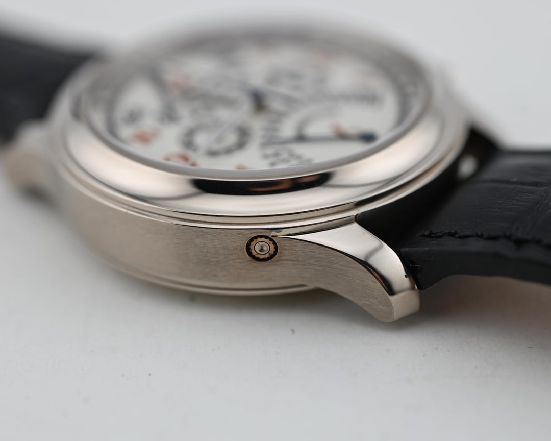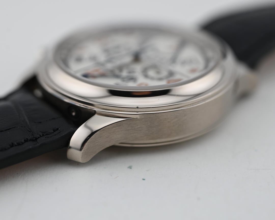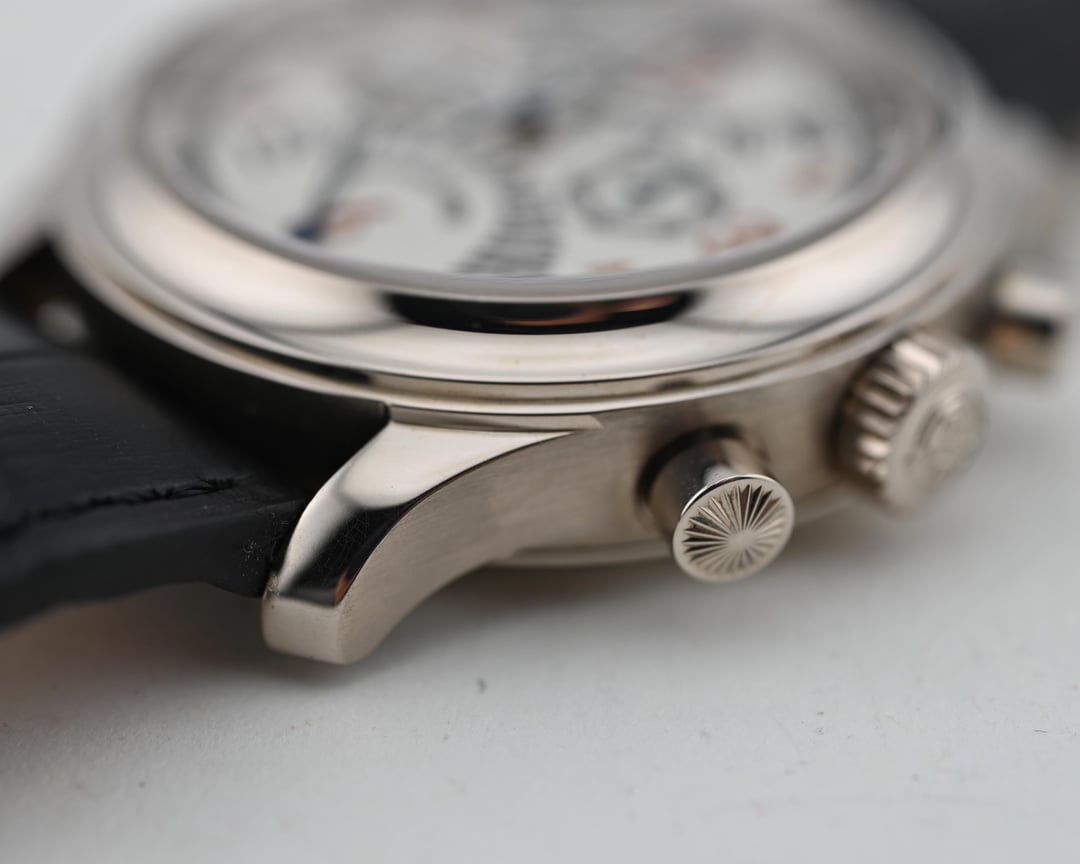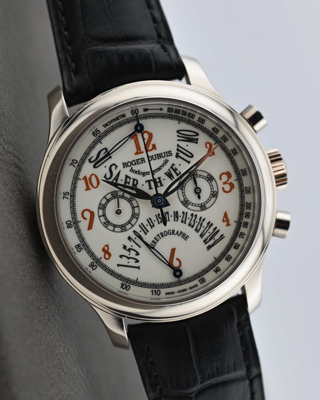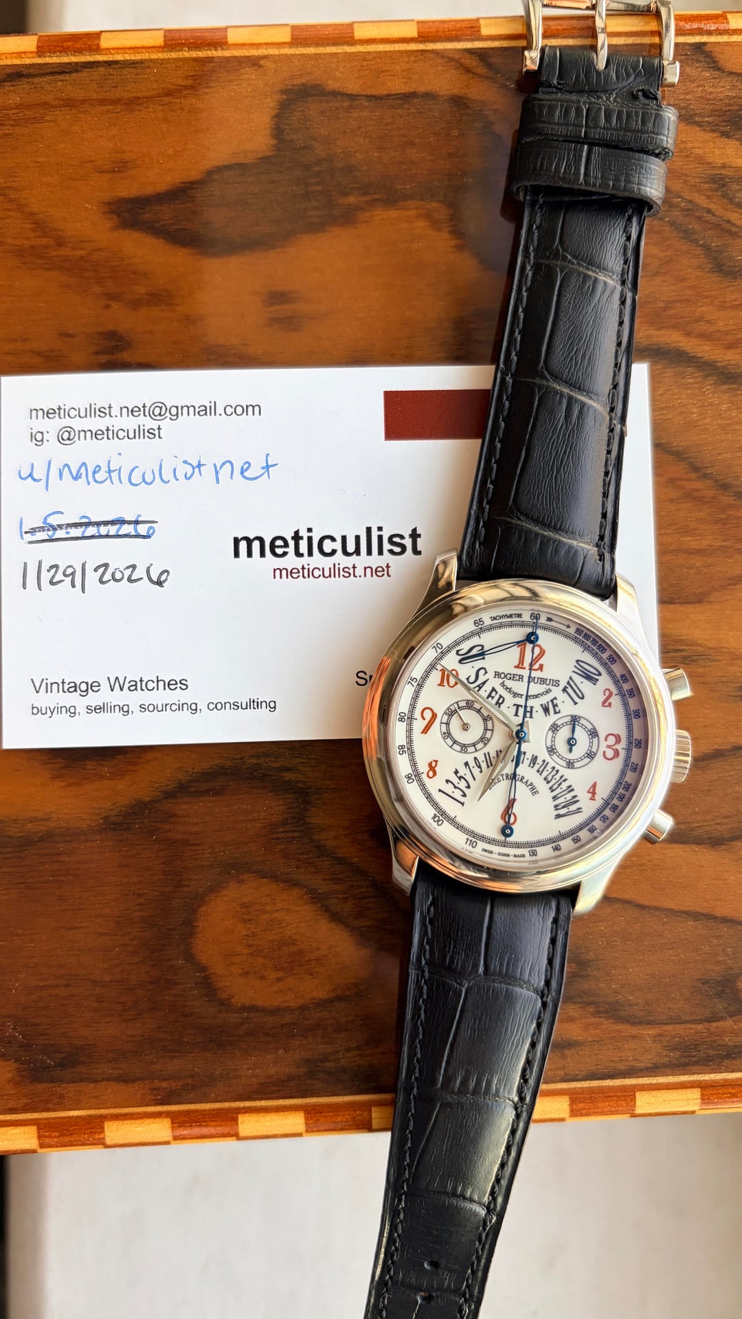An early, rare, and absolutely stunning Roger Dubuis Hommage Bi-Retrograde Chronograph Reference H40 560 series in white gold with original presentation box. This watch is achingly beautiful from every angle, and particularly interesting at off angles, highlighting a seemingly endless list of intricate and fascinating details such as the polished concave bezel, anti-slide “tasti-tondi” style pushers, unique hollowed and heat blued sub register hands, highlighting the stylized red Arabic numerals, and the richness and depth of the lacquered white dial. The party continues on the movement side with a beautifully finished manually wound and Geneva Seal caliber RD5630 movement, based on the infamous Lemania 2310 caliber complete with Geneva striping, anglage, black polishing, a capped column wheel, and swan’s neck regulator. Far more interesting and detailed than anything from Patek or the like, presenting a tremendous value and serious collection capstone. **Reference:** Hommage Bi-Retrograde Chronograph H40-560 **Case:** The 40 x 47 x 14 mm solid white gold case is in excellent overall condition, and appears to be unpolished. **Dial:** The white lacquered dial has a glassy milky richness and depth to it, appearing to be enamel, highlighting the layers and thickness of the printed scales and numerals. The dial and hands are free from defects as pictured. **Movement:** The RD5630 caliber is a heavily modified Lemania 2310 base that features a Geneva Seal on the balance cock as well as on the movement base plate under the balance wheel. The finishing is intricate and classic and the watch is winding, setting, and running well, with crisp calendar changes at midnight. The watch is running at approximately +/- 0 s/d, averaged across 6 positions. **Strap:** The watch is presented on a black alligator strap with calfskin lining in good shape measuring 75 x 120 mm and including the original signed white gold buckle in very good condition. **Includes:** Presented with one of the coolest wooden boxes I’ve seen with multiple grain patterns throughout and a rich leather presentation inside depicting and describing the importance of the Geneva Seal. Accompanied by the original leather hang tag. No additional booklets or papers are present. **Price:** $38,000 USD including fully insured shipping from Phoenix, AZ to a FedEx Office location or commercial address within the continental US, international shipping available at cost based on location. Payment by ACH or wire, no trades please. I have all positive references here, [Chrono24](https://www.chrono24.com/dealer/meticulist/index.htm), forums, and [Instagram (@)meticulist](http://instagram.com/meticulist). All available watches can be found at [meticulist.net](http://meticulist.net/) Thanks mods for the space.