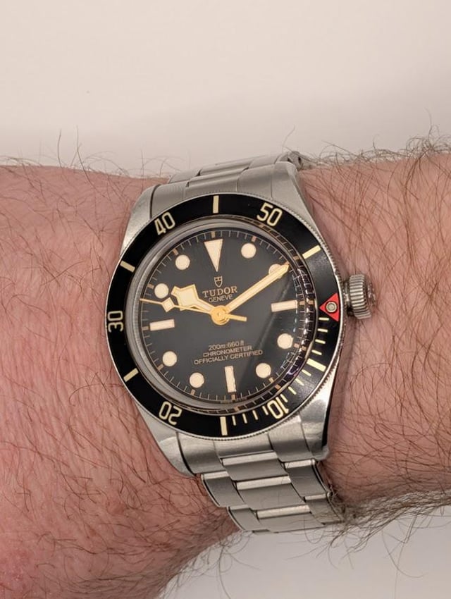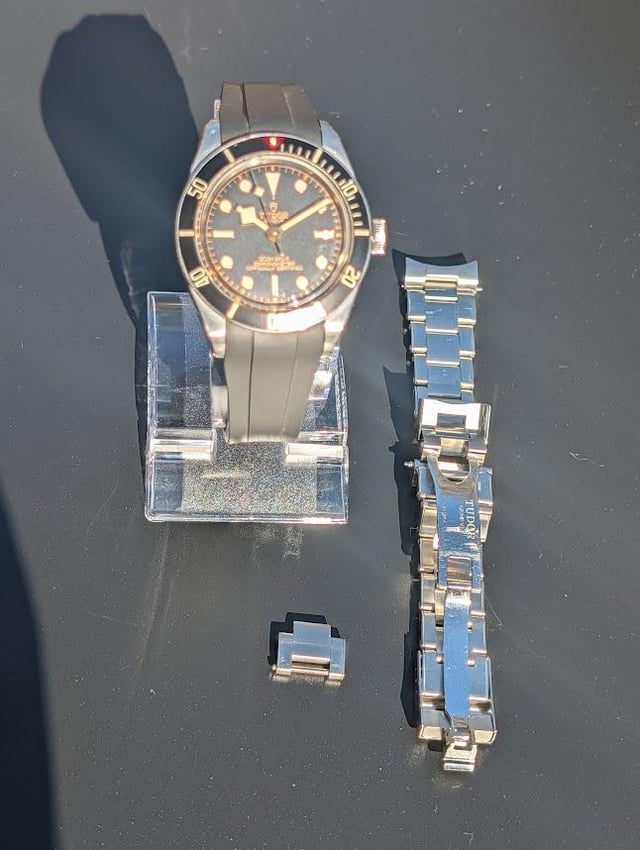 📍 MODEL: Tudor BB58 Gilt 79030n 39mm 📍 PRICE: $2,200 + G&S fee + Shipping 📍 OVERVIEW Up for sale is my BB58 Gilt 79030N 39mm, with original bracelet and a Vanguard rubber strap. No box or papers. I purchased the watch from BRANDEAR on ebay in Sept 2023 and it was authenticated by ebay but I have no box or papers. I believe it is from 2022. You can see the serial number in the photos, but I can't seem to find a manufacture date based on the serial number. 📍 EXTERIOR Honest wear with surface scratches on the case and clasp and some wear on the bezel (see photos). I took photos in direct sunlight so you can see all the flaws but the scratches are much harder to see in normal light. I promise it looks great! 📍 FUNCTIONALITY All functions working well (Crown, bezel, and timekeeping work great, no issues). 📍 INCLUSIONS: Bracelet: Original stainless steel rivet bracelet includes 11 total links (fits up to \~7" wrist). It fits my 6.5" wrist a little loosely, and then there is one spare link. Extras: Includes a Vanguard Black Integrated Rubber Strap. 📍 SHIPPING: USPS Registered, or Fedex, whichever the buyer prefers. CONUS only please. 📍 PAYMENT: Paypal g&s Happy to do a video call!