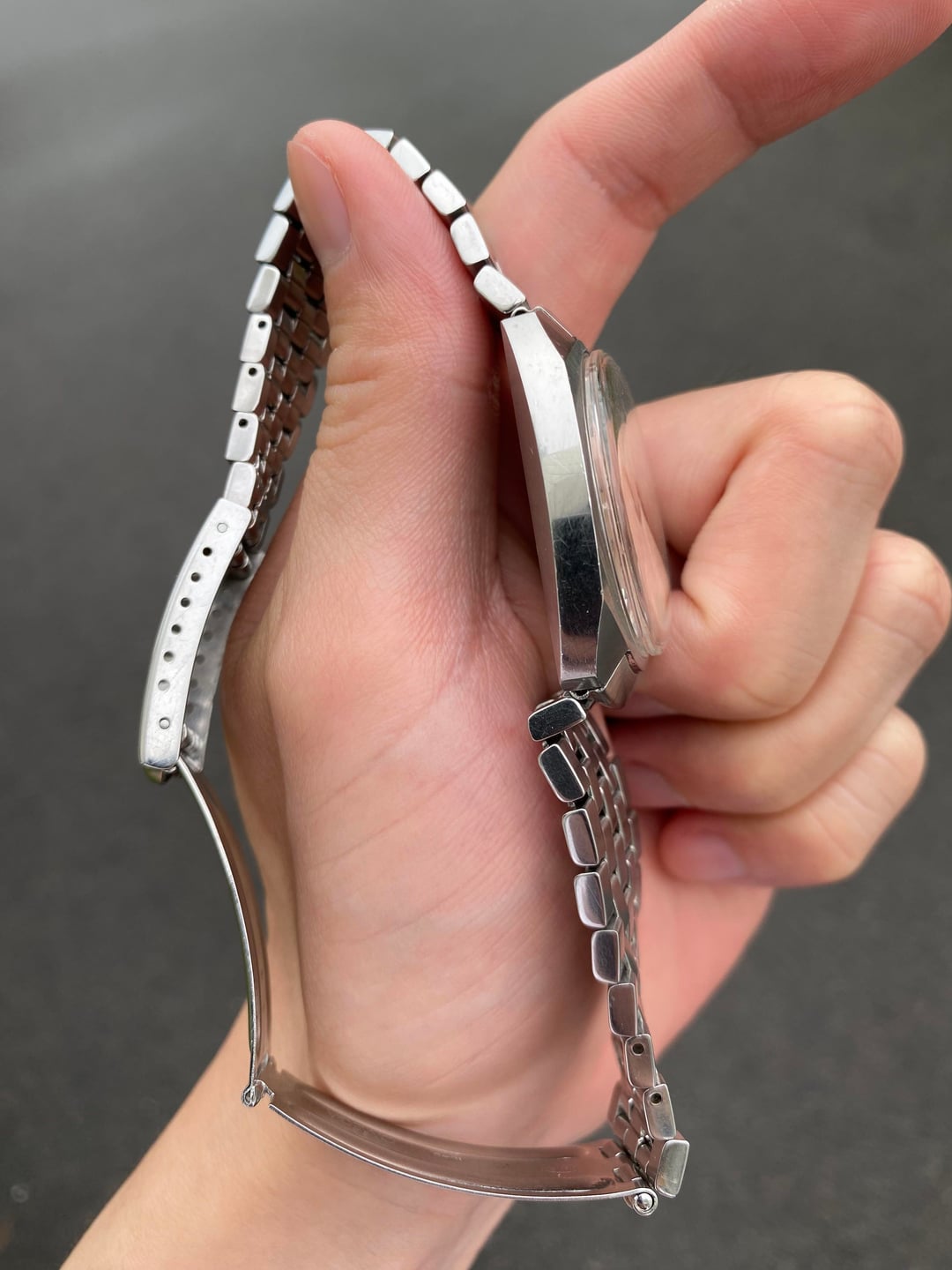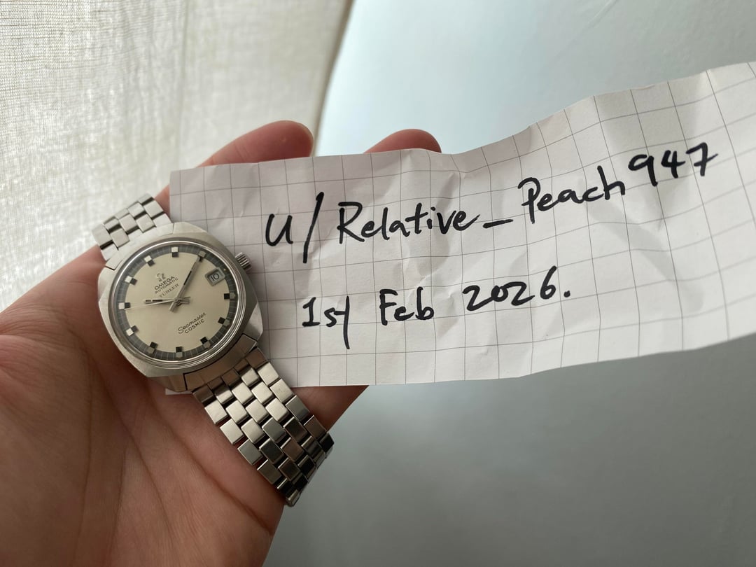 Hi everyone! I’m offering this super cool spaceship-like Omega Seamaster Cosmic with the awesome caliber 565 quick-setting date automatic movement. It bears the reference 166.022, and even comes with its original brick style bracelet and correct end links that completes and form a seamless edge around the lugs and case. Its funky retro-futuristic design is very reminiscent of the aesthetic that came about in the late 60s through 70s—due to that era’s fascination with sci-fi and space exploration. The ‘Türler’ co-branding printed beneath the Omega logo indicates that it was retailed through the prestigious Swiss retailer Türler, adding a layer of collectability. The well-preserved off-white sunburst dial is accented with applied black and steel hour markers, with a striking inner black minute track embellished with bold rectangular-style hash marks, creating a distinctive visual frame. The acrylic glass is original and signed with an Omega logo in the center. All of its tritium lume plots are present as well with no flakes. Its unique end links form part of the geometrical case, and completes the full cushion-style case design seamlessly, and gives it a more substantial presence on the wrist despite its humble dimension of 35mm. The excellent caliber 565 has been serviced around June this year, and runs perfectly with a snappy date change. The bracelet is also long and will fit wrists up to approximately 18.5cm with removable links to resize. For the great condition with original bracelet, I’m looking for a reasonable $950 shipped (duties covered by me) from Singapore via reliable Fedex to wherever you may be. I accept payment through Wise (preferred), Revolut, or bank wire. Please let me know if you have any questions. I'm happy to jump on a video call for the added assurance too. Thank you! David