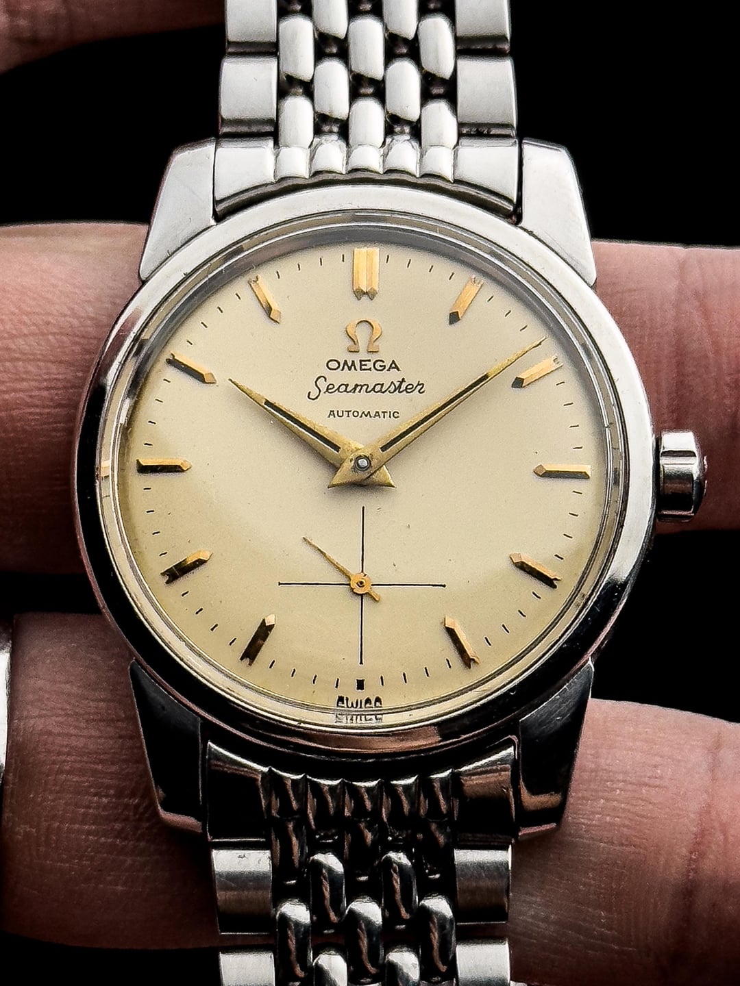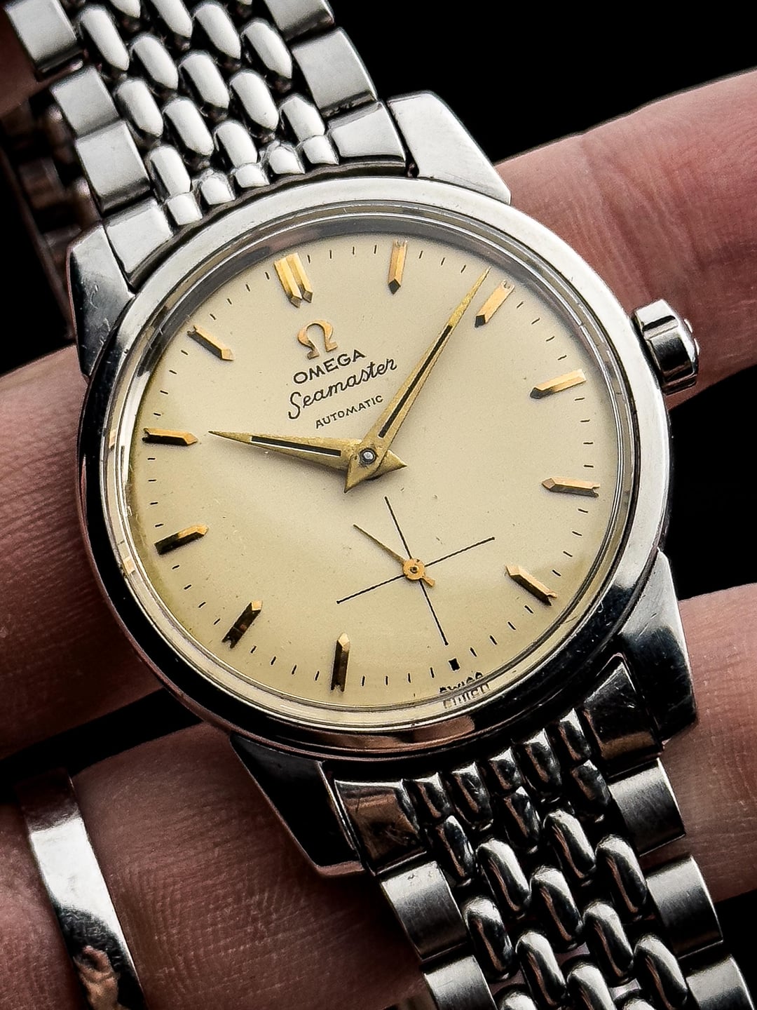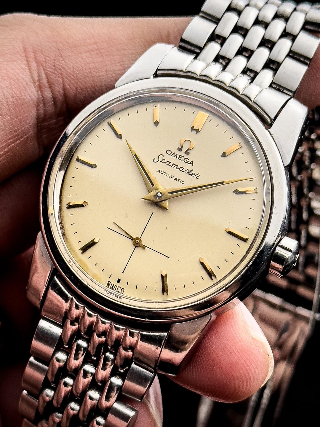 Up for sale is the 1950s Omega Seamaster Ref.2846 37mm in Great Original Condition Photos: https://drive.google.com/drive/folders/1r8KslUplzZlcsE5RqLoW0_lSzQmsCNSz Video: https://drive.google.com/file/d/1fJbATm0SQ0i2_FiLILLxpMyNmOqnStdg/view?usp=drivesdk Timestamp: https://drive.google.com/file/d/1Wp1D-mLiAbwuwYSTKIBPPx8sd8PaHQmf/view?usp=drivesdk Offered here is a beautiful example of the early Omega Seamaster, a model born from real-world necessity and refined into one of the most important lines in Swiss watchmaking. Introduced after World War II, the Seamaster was the world’s first waterproof automatic wristwatch, combining a screw-back case with an automatic movement to reduce water ingress from crown operation—practical innovation, executed with restraint. This particular 1950s Seamaster showcases everything that makes vintage Omega so appealing. Housed in a well-balanced stainless steel case measuring 36.8mm across, 41.3mm lug-to-lug, and just 11.8mm thick, it wears with classic presence without ever feeling oversized. The cream-toned dial is subtle and understated, catching light gently rather than flashing it back. The texture adds depth without distraction, staying true to the era’s philosophy of clarity and usability. Upright gold bar indices with a cut finish sit beautifully against the dial, paired with elegant gold-tone dolphin hands that strike a perfect balance between legibility and refinement. The cursive “Seamaster” script and minimalist text layout give the watch a quiet confidence that feels timeless. The case itself is classic Omega—clean, proportioned, and free of unnecessary decoration. The flowing lines from the mid-case into the gently tapering lugs show thoughtful design, while the flat bezel frames the dial perfectly and keeps everything visually balanced. Inside beats the Omega Calibre 491, a 19-jewel automatic movement from Omega’s mature automatic era. Known for its reliability and stable winding efficiency, it’s a movement built with longevity in mind—honest, durable, and made to be worn. The watch is in great original condition with minor scratches fitting for its age with no dent. The crystal is flawless, dial is clean with even patina. Watch comes fitted on OEM bracelet with full links that fits up to 22 cm (9 inches). Watch is serviced so it’s keeping great time. Watch comes with standard box (no papers). Price: $1700 + $60 flat shipping (via DHL/ UPS express with tariffs/duty fee covered). Payment via PayPal F&F or G&S (+4.6% fee paid by the buyer). Not accepting trades. Feel free to message me with any questions or if you’re interested. Have a great day! Check out my other watches on Instagram: @jasonswatchcorner