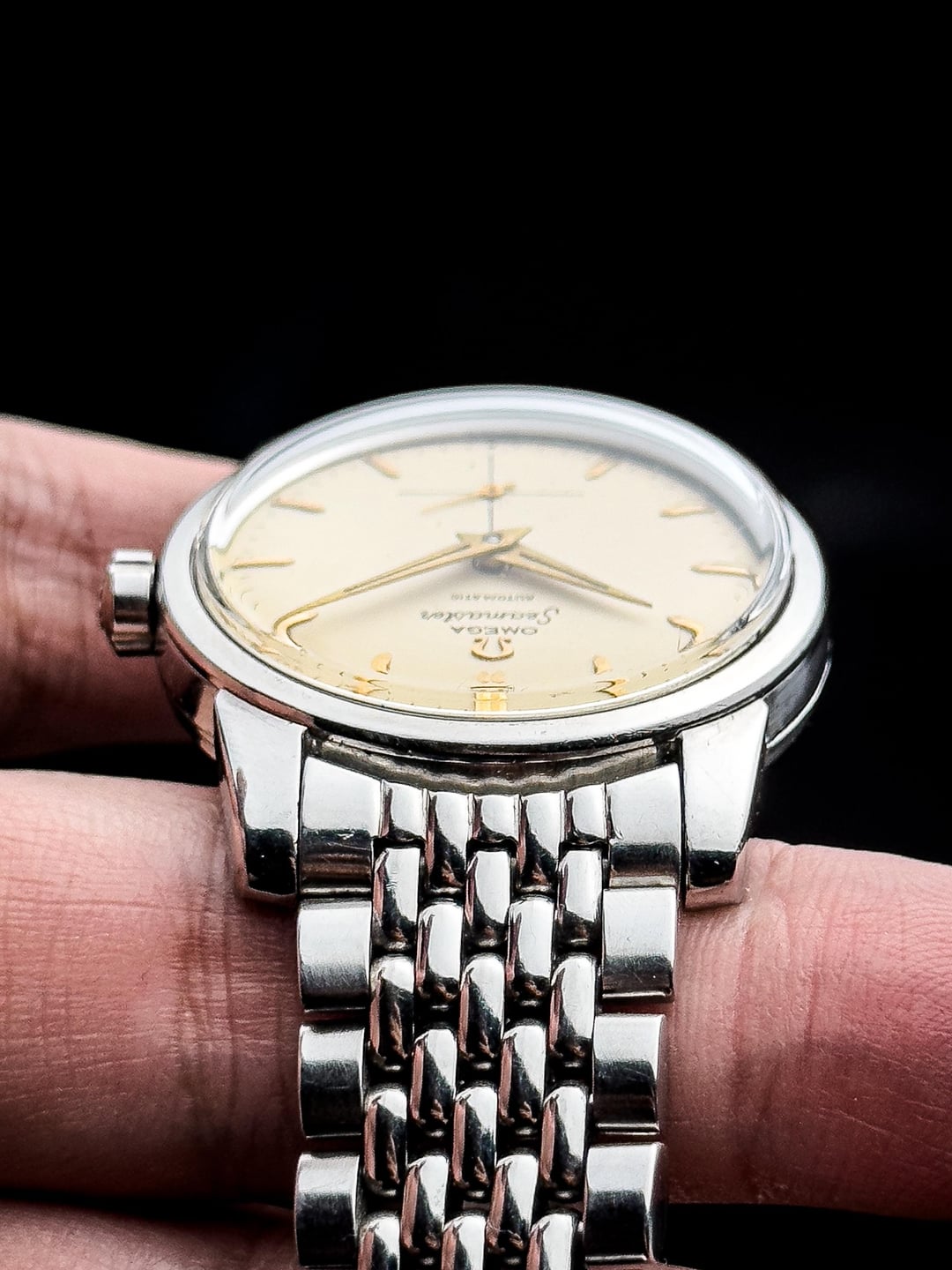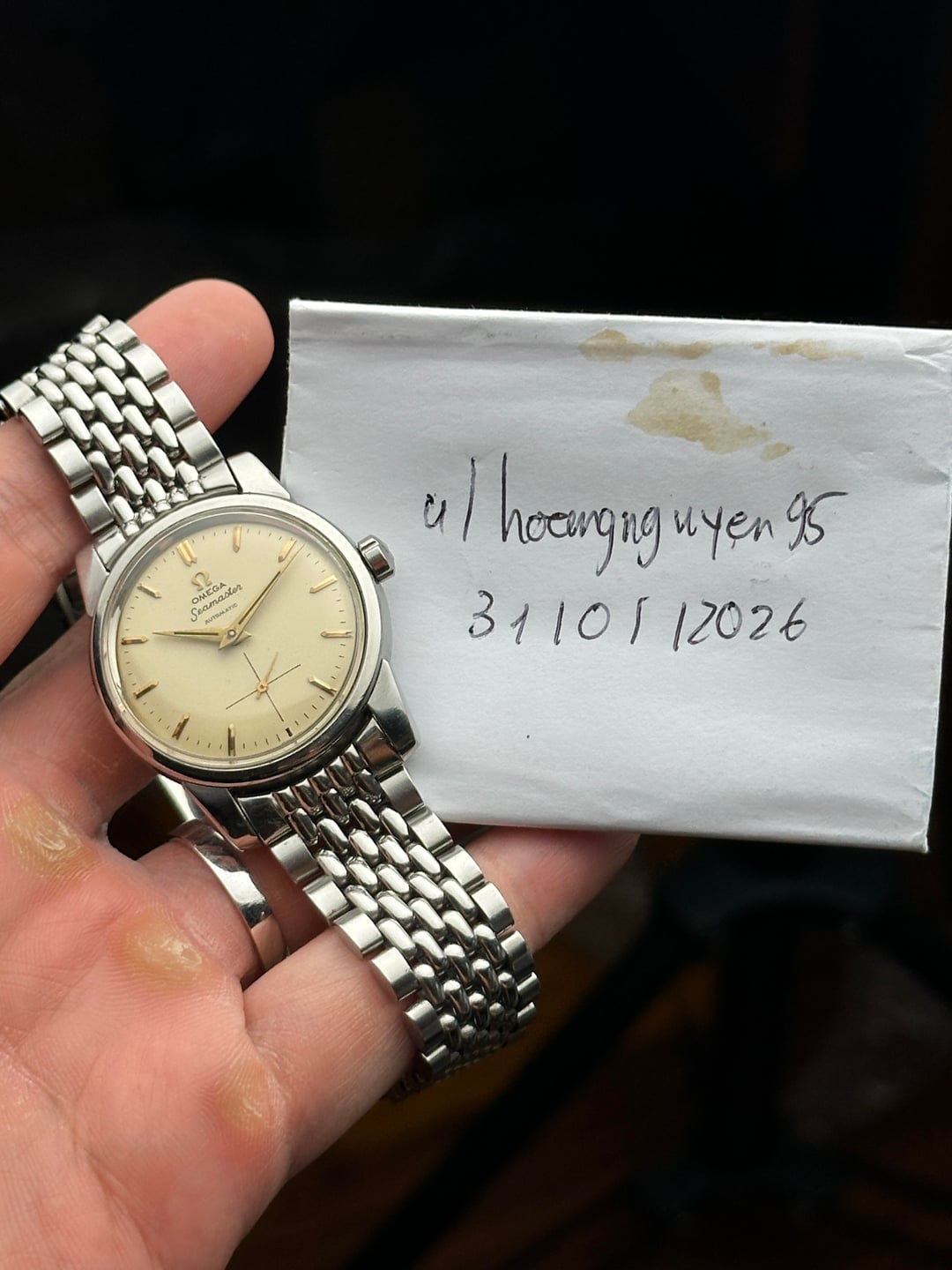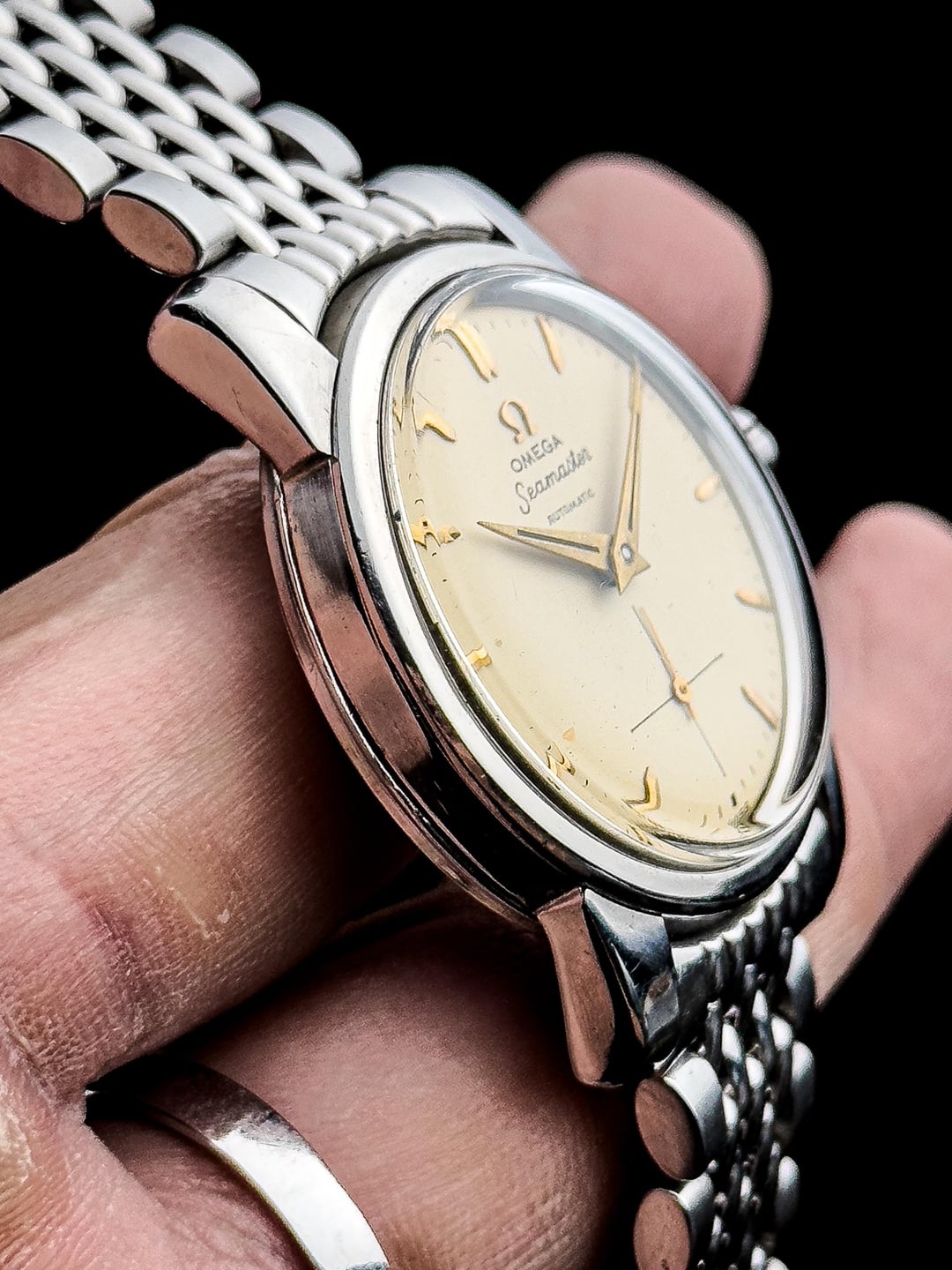Up for sale is the 1950s Omega Seamaster Ref.2846 37mm in Great Original Condition Photos: https://drive.google.com/drive/folders/1r8KslUplzZlcsE5RqLoW0_lSzQmsCNSz Video: https://drive.google.com/file/d/1fJbATm0SQ0i2_FiLILLxpMyNmOqnStdg/view?usp=drivesdk Timestamp: https://drive.google.com/file/d/1Wp1D-mLiAbwuwYSTKIBPPx8sd8PaHQmf/view?usp=drivesdk Offered here is a beautiful example of the early Omega Seamaster, a model born from real-world necessity and refined into one of the most important lines in Swiss watchmaking. Introduced after World War II, the Seamaster was the world’s first waterproof automatic wristwatch, combining a screw-back case with an automatic movement to reduce water ingress from crown operation—practical innovation, executed with restraint. This particular 1950s Seamaster showcases everything that makes vintage Omega so appealing. Housed in a well-balanced stainless steel case measuring 36.8mm across, 41.3mm lug-to-lug, and just 11.8mm thick, it wears with classic presence without ever feeling oversized. The cream-toned dial is subtle and understated, catching light gently rather than flashing it back. The texture adds depth without distraction, staying true to the era’s philosophy of clarity and usability. Upright gold bar indices with a cut finish sit beautifully against the dial, paired with elegant gold-tone dolphin hands that strike a perfect balance between legibility and refinement. The cursive “Seamaster” script and minimalist text layout give the watch a quiet confidence that feels timeless. The case itself is classic Omega—clean, proportioned, and free of unnecessary decoration. The flowing lines from the mid-case into the gently tapering lugs show thoughtful design, while the flat bezel frames the dial perfectly and keeps everything visually balanced. Inside beats the Omega Calibre 491, a 19-jewel automatic movement from Omega’s mature automatic era. Known for its reliability and stable winding efficiency, it’s a movement built with longevity in mind—honest, durable, and made to be worn. The watch is in great original condition with minor scratches fitting for its age with no dent. The crystal is flawless, dial is clean with even patina. Watch comes fitted on OEM bracelet with full links that fits up to 22 cm (9 inches). Watch is serviced so it’s keeping great time. Watch comes with standard box (no papers). Price: $1700 + $60 flat shipping (via DHL/ UPS express with tariffs/duty fee covered). Payment via PayPal F&F or G&S (+4.6% fee paid by the buyer). Not accepting trades. Feel free to message me with any questions or if you’re interested. Have a great day! Check out my other watches on Instagram: @jasonswatchcorner