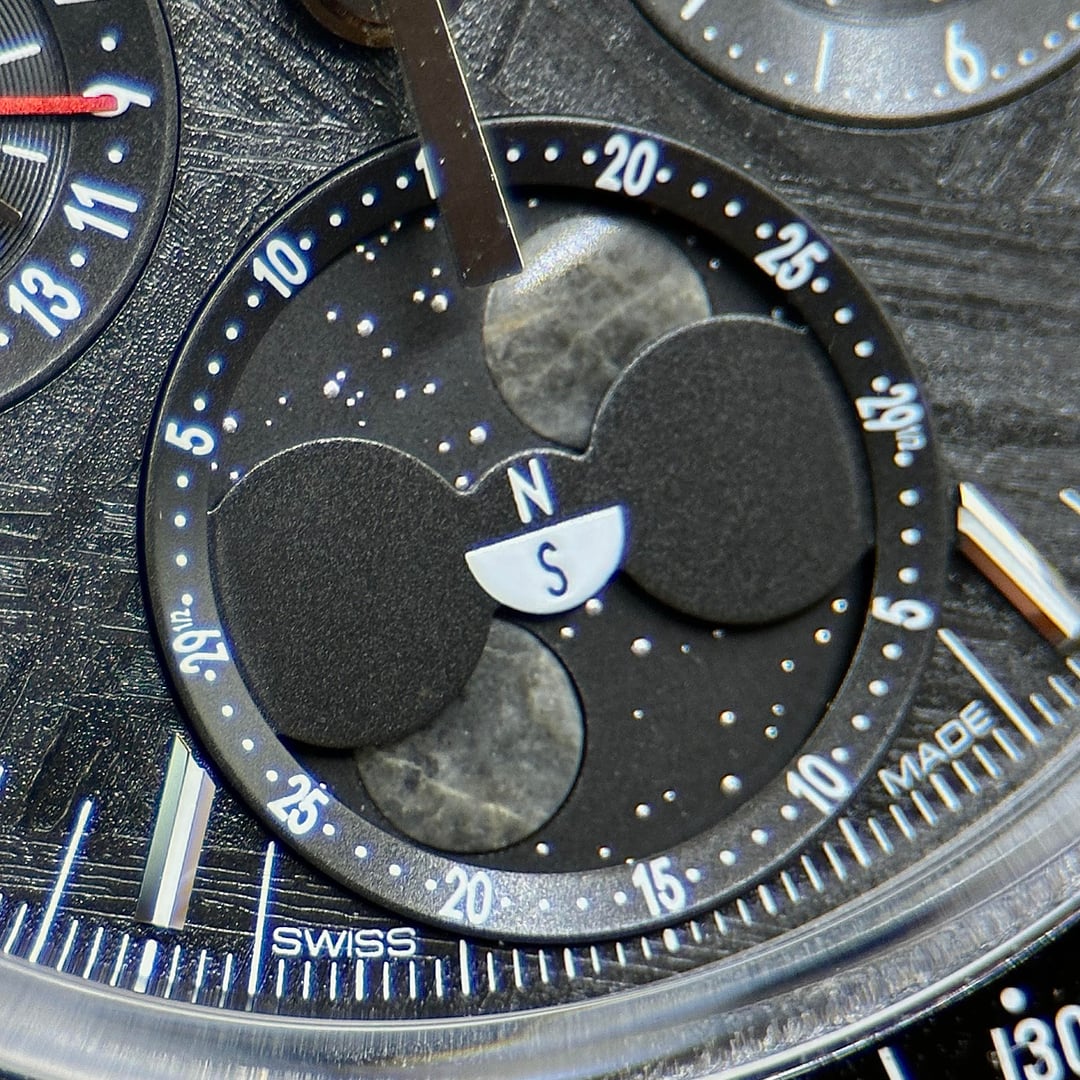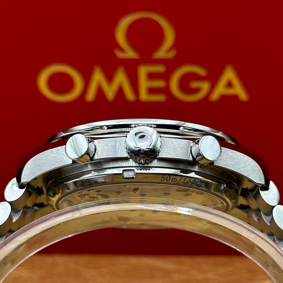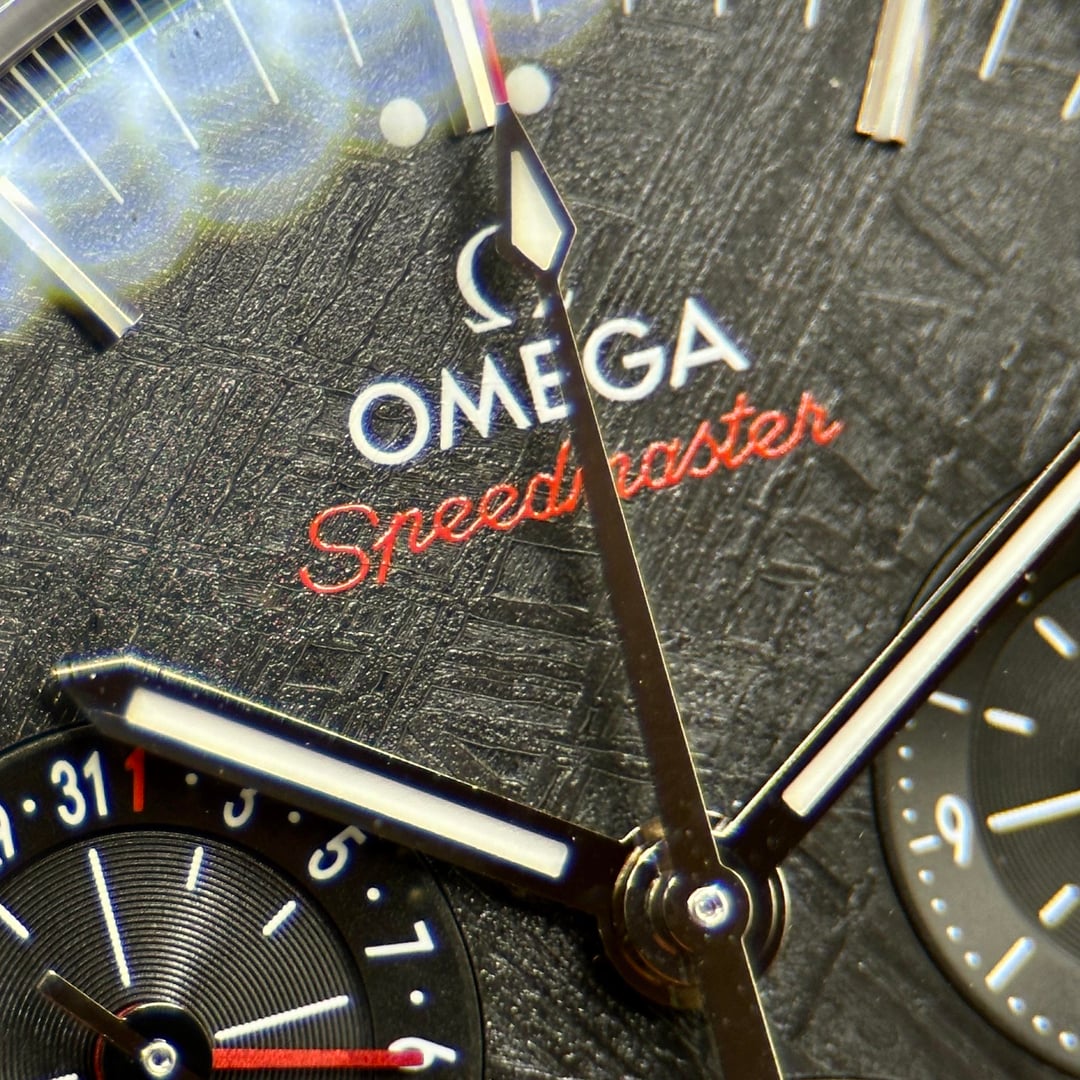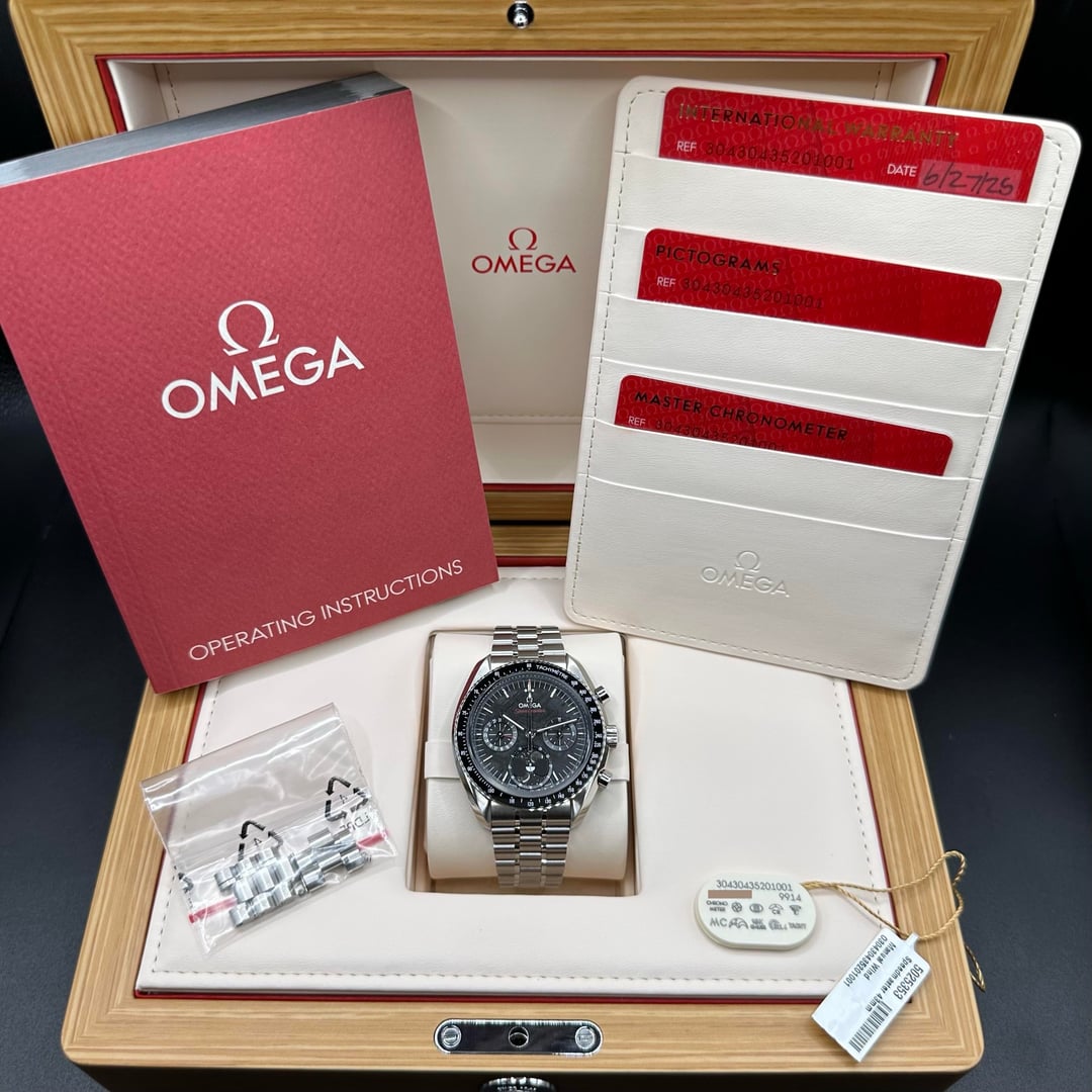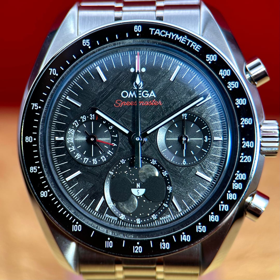 The Speedmaster stands as one of OMEGA’s most legendary timepieces, forever linked to all six lunar missions. This 43mm Speedmaster Moonphase is a powerful tribute to that legacy, distinguished by its extraordinary use of genuine lunar meteorite in the moonphase display. The dial is crafted from a PVD black-coated meteorite plate, creating a dramatic cosmic texture that is both rare and visually striking. The hour and minute hands, along with the applied indexes, are rendered in 18K white gold, as are the hands on the two black-coated subdials, adding a refined contrast to the dark celestial surface. At 6 o’clock, the signature Moonphase complication showcases north and south hemisphere indications, featuring two sculpted, polished, and domed moons made from authentic lunar meteorite that fell to Earth—an exceptional and symbolic detail rarely seen in modern watchmaking. The polished and brushed stainless steel case is paired with a black ceramic bezel ring featuring a white enamel tachymeter scale, delivering a bold yet elegant presence. The watch is fitted to the wrist with a polished-brushed stainless steel bracelet, complete with OMEGA’s patented comfort release adjustment system, inspired by the legendary Speedmaster design. Powering the watch is the OMEGA Co-Axial Master Chronometer Caliber 9914, a manual-winding chronograph movement officially certified by METAS, offering exceptional precision, durability, and anti-magnetic performance—combining technical mastery with historic prestige. * Brand: Omega * Model: Speedmaster Moonphase Meteorite * Reference: 304.30.43.52.01.001 * Case Size: 43mm * Case Material: Stainless Steel * Dial: Genuine Meteorite * Movement: Omega Caliber 9914 Manual * Power Reserve: Approximately 60 hours * Crystal: Sapphire crystal * Caseback: Sapphire exhibition * Water Resistance: 50 meters * Bracelet: Stainless steel MSRP $19,300.00 LOW C 15K Asking $13,989.00 Includes Full set: Inner/Outer Box Hang Tag Warranty Card 2025 Master Chronometer Pictrograms Folio