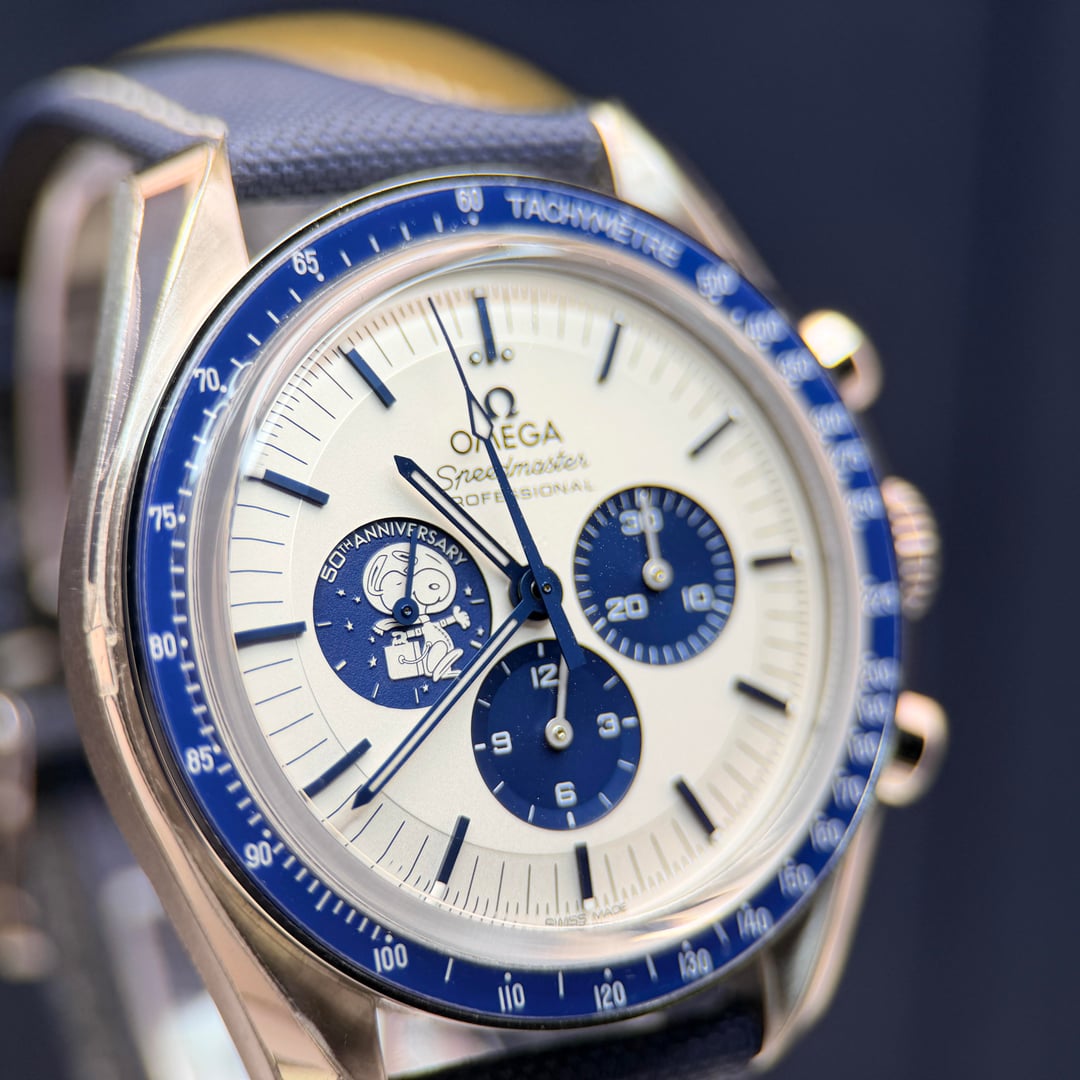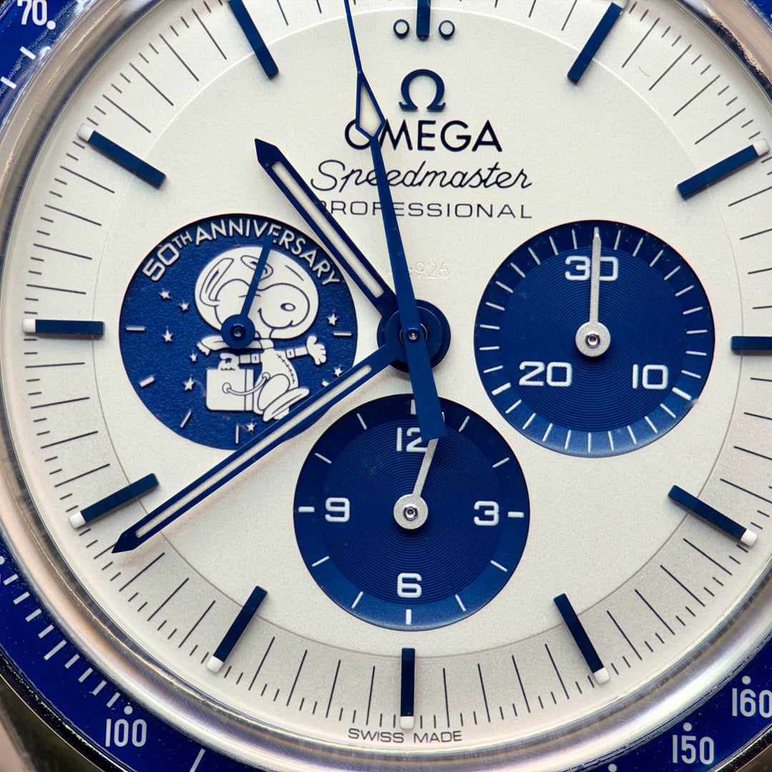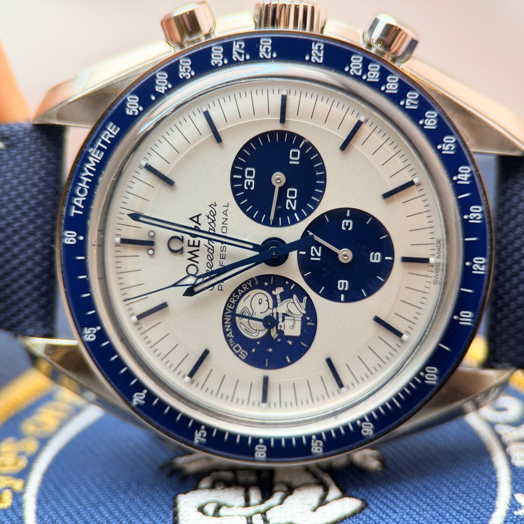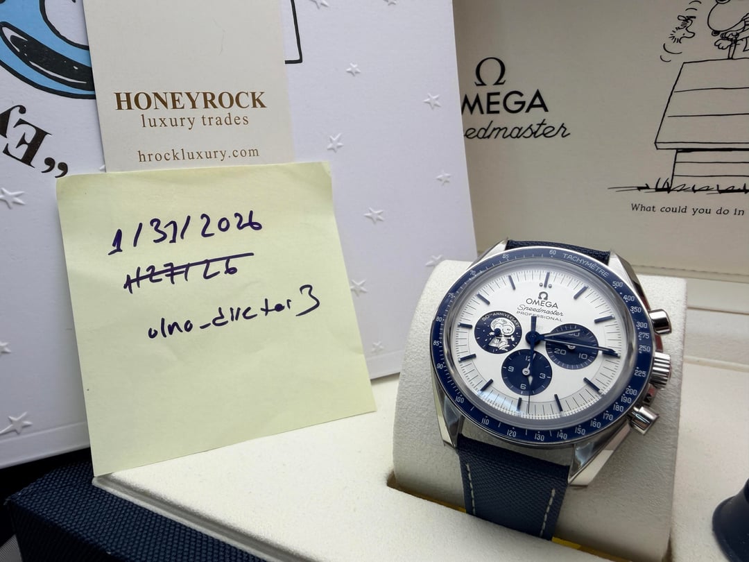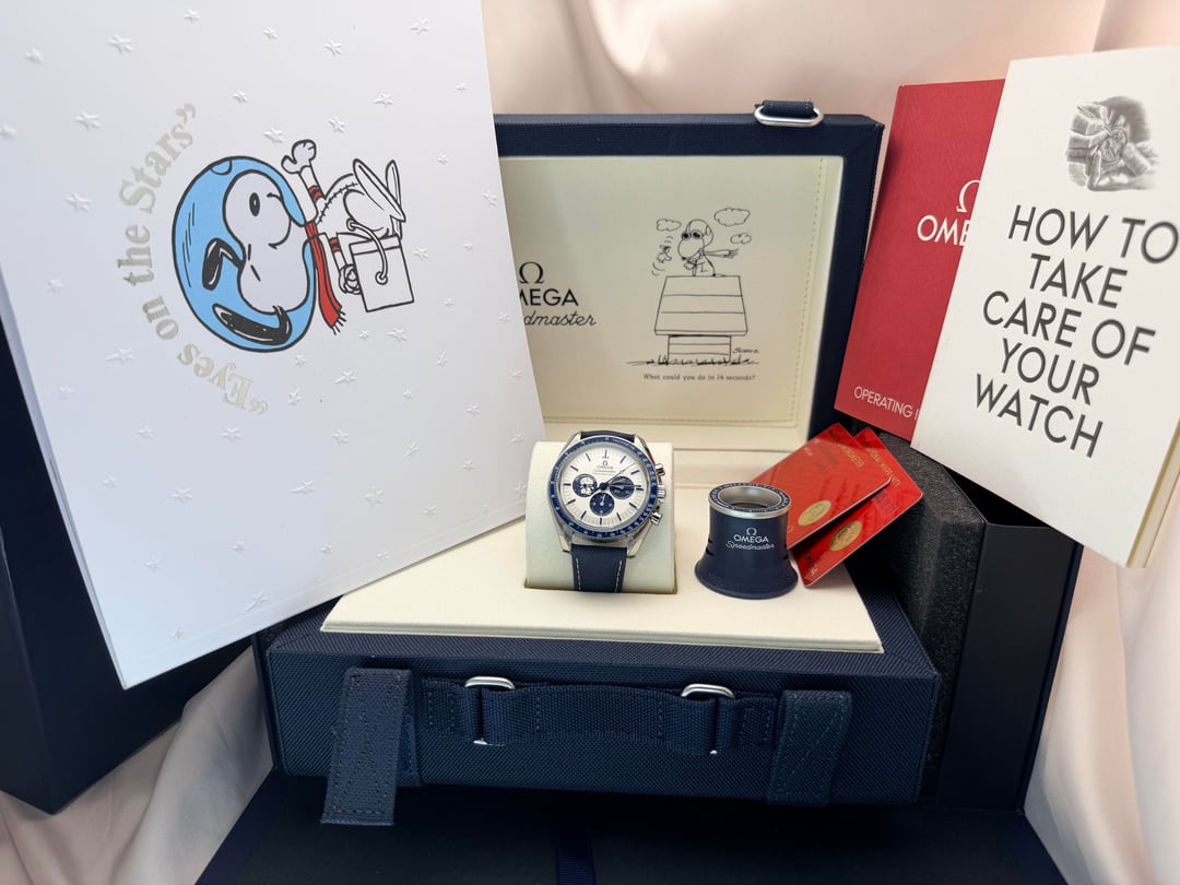 Omega Speedmaster “Silver Snoopy Award” 50th Anniversary Ref. 310.32.42.50.02.001 | 2025 | Brand New | Full Set Price: 14959 + ship Offered here is the iconic Omega Speedmaster Silver Snoopy Award 50th Anniversary, presented in brand new condition, fully stickered, and complete as a full set. A highly collectible modern Speedmaster celebrating NASA’s Silver Snoopy Award and Omega’s pivotal role in space exploration. The 42mm stainless steel case is paired with a crisp silver-tone dial featuring blue accents and the instantly recognizable Snoopy motif at 9 o’clock. Powering the watch is Omega’s Master Chronometer Caliber 3861, offering Co-Axial escapement, METAS certification, and exceptional resistance to magnetism. The sapphire caseback reveals the celebrated animated Snoopy lunar scene—one of the most creative and technically impressive casebacks in modern watchmaking. Highlights • Year: 2025 • Condition: Brand new, unworn • Factory stickers: Fully intact • Set: Complete full set (inner & outer boxes, manuals, cards, accessories) • Case: 42mm stainless steel • Movement: Omega Caliber 3861, manual wind, Master Chronometer • Crystal: Sapphire front and back • Dial: Silver with blue accents and Snoopy sub-dial • Strap: Blue nylon fabric strap with deployant clasp • Water resistance: 50 meters A cornerstone modern Speedmaster and one of the most sought-after Snoopy editions, combining historical significance, technical excellence, and enduring collectability.