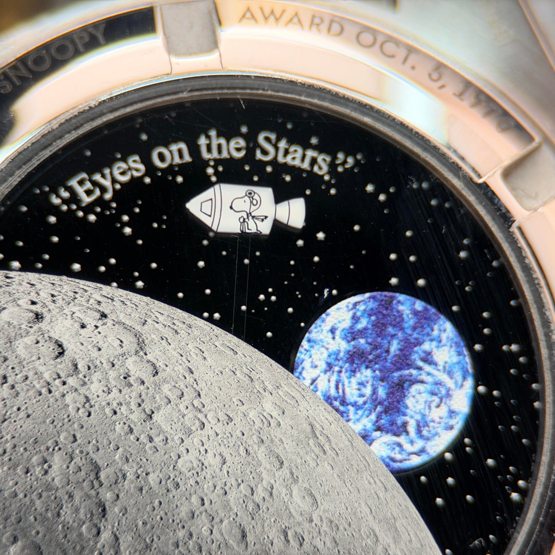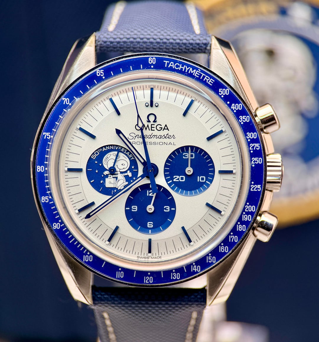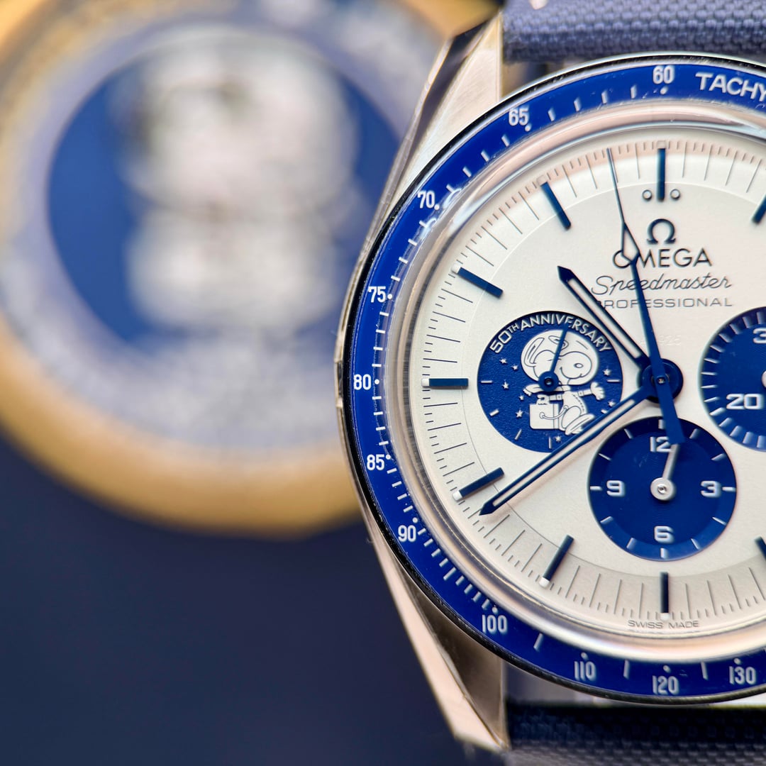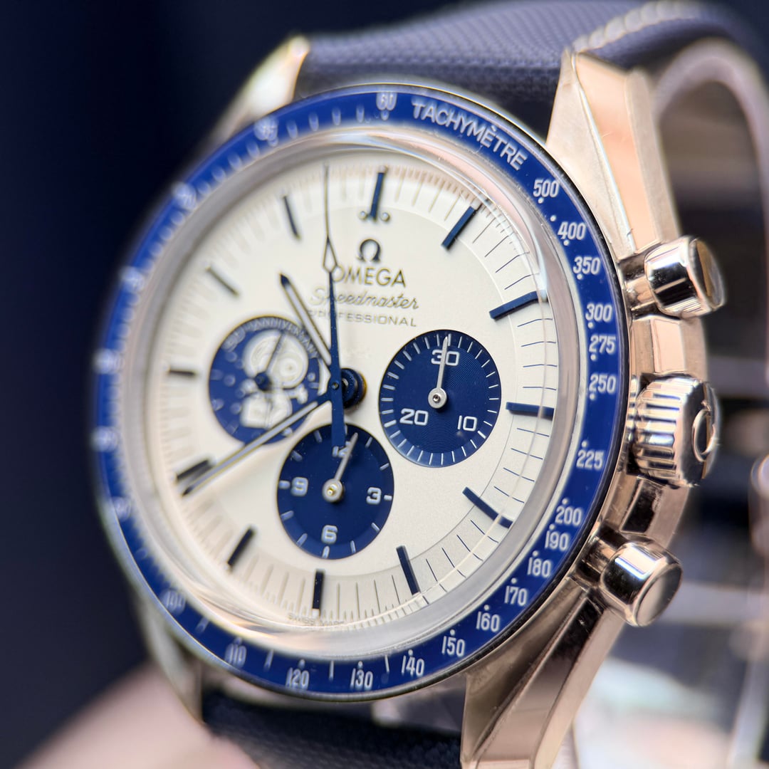 Omega Speedmaster “Silver Snoopy Award” 50th Anniversary Ref. 310.32.42.50.02.001 | 2025 | Brand New | Full Set Price: 14959 + ship Offered here is the iconic Omega Speedmaster Silver Snoopy Award 50th Anniversary, presented in brand new condition, fully stickered, and complete as a full set. A highly collectible modern Speedmaster celebrating NASA’s Silver Snoopy Award and Omega’s pivotal role in space exploration. The 42mm stainless steel case is paired with a crisp silver-tone dial featuring blue accents and the instantly recognizable Snoopy motif at 9 o’clock. Powering the watch is Omega’s Master Chronometer Caliber 3861, offering Co-Axial escapement, METAS certification, and exceptional resistance to magnetism. The sapphire caseback reveals the celebrated animated Snoopy lunar scene—one of the most creative and technically impressive casebacks in modern watchmaking. Highlights • Year: 2025 • Condition: Brand new, unworn • Factory stickers: Fully intact • Set: Complete full set (inner & outer boxes, manuals, cards, accessories) • Case: 42mm stainless steel • Movement: Omega Caliber 3861, manual wind, Master Chronometer • Crystal: Sapphire front and back • Dial: Silver with blue accents and Snoopy sub-dial • Strap: Blue nylon fabric strap with deployant clasp • Water resistance: 50 meters A cornerstone modern Speedmaster and one of the most sought-after Snoopy editions, combining historical significance, technical excellence, and enduring collectability.