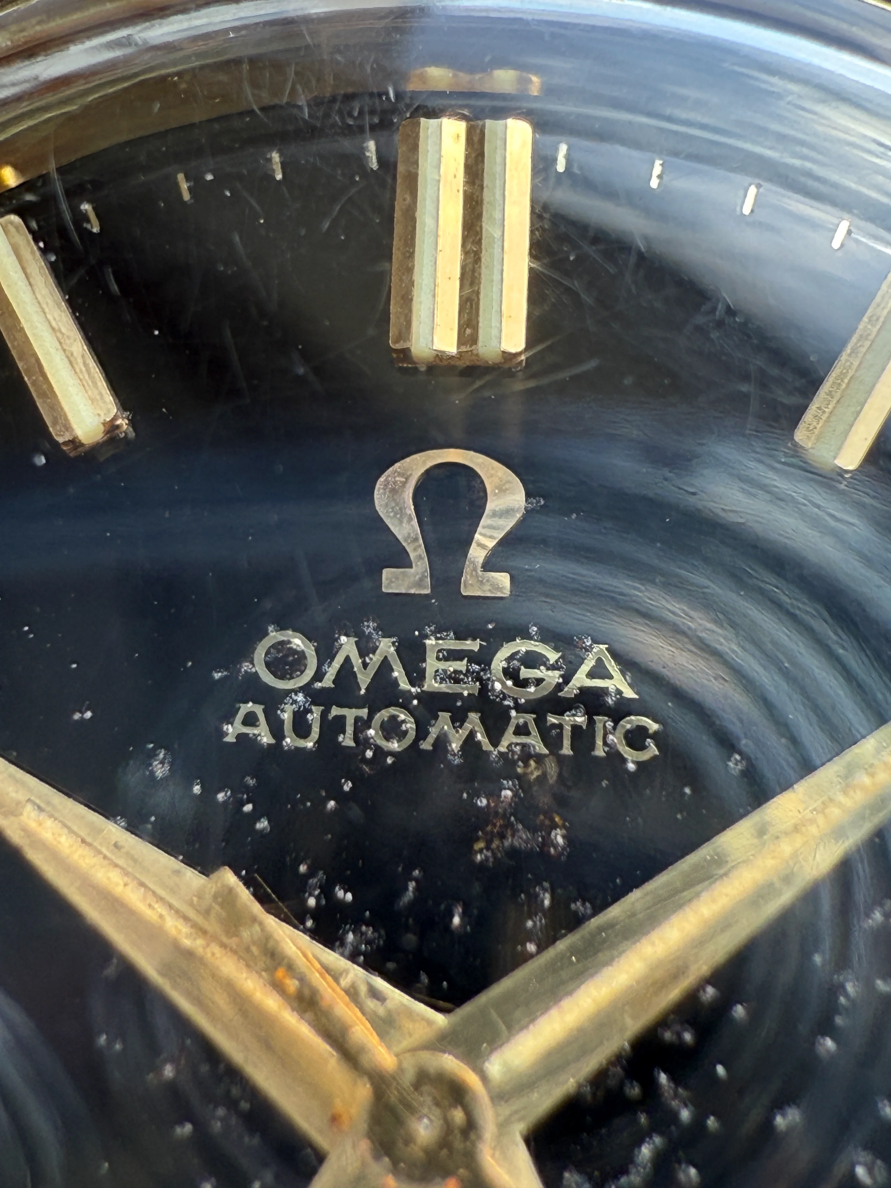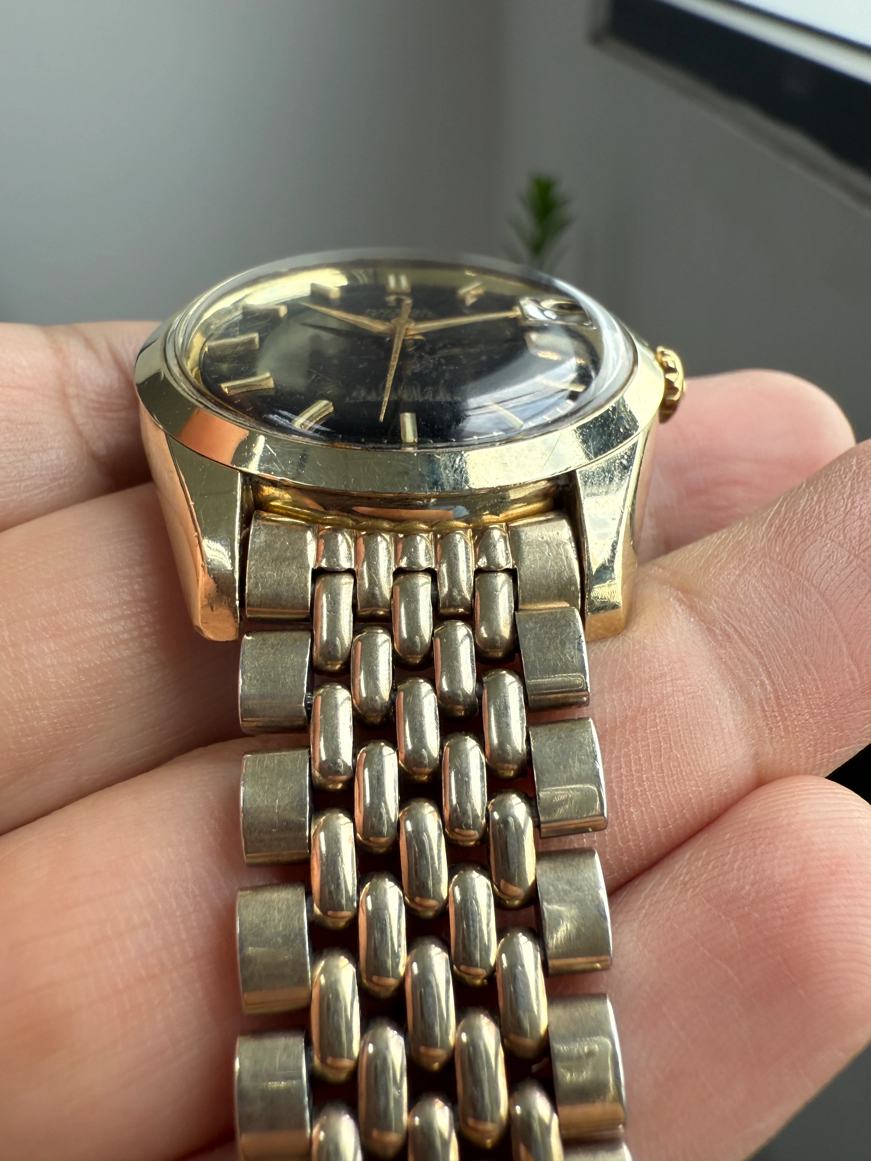 - Dial: Original black gilt dial with gold tone scripts; faceted date-aperture frame at 3; dauphine hands; hands and hour markers have lume; prints, hands and hour markers are all good. The dial surface has been aged and damaged in the center area (details are shown in photos below).