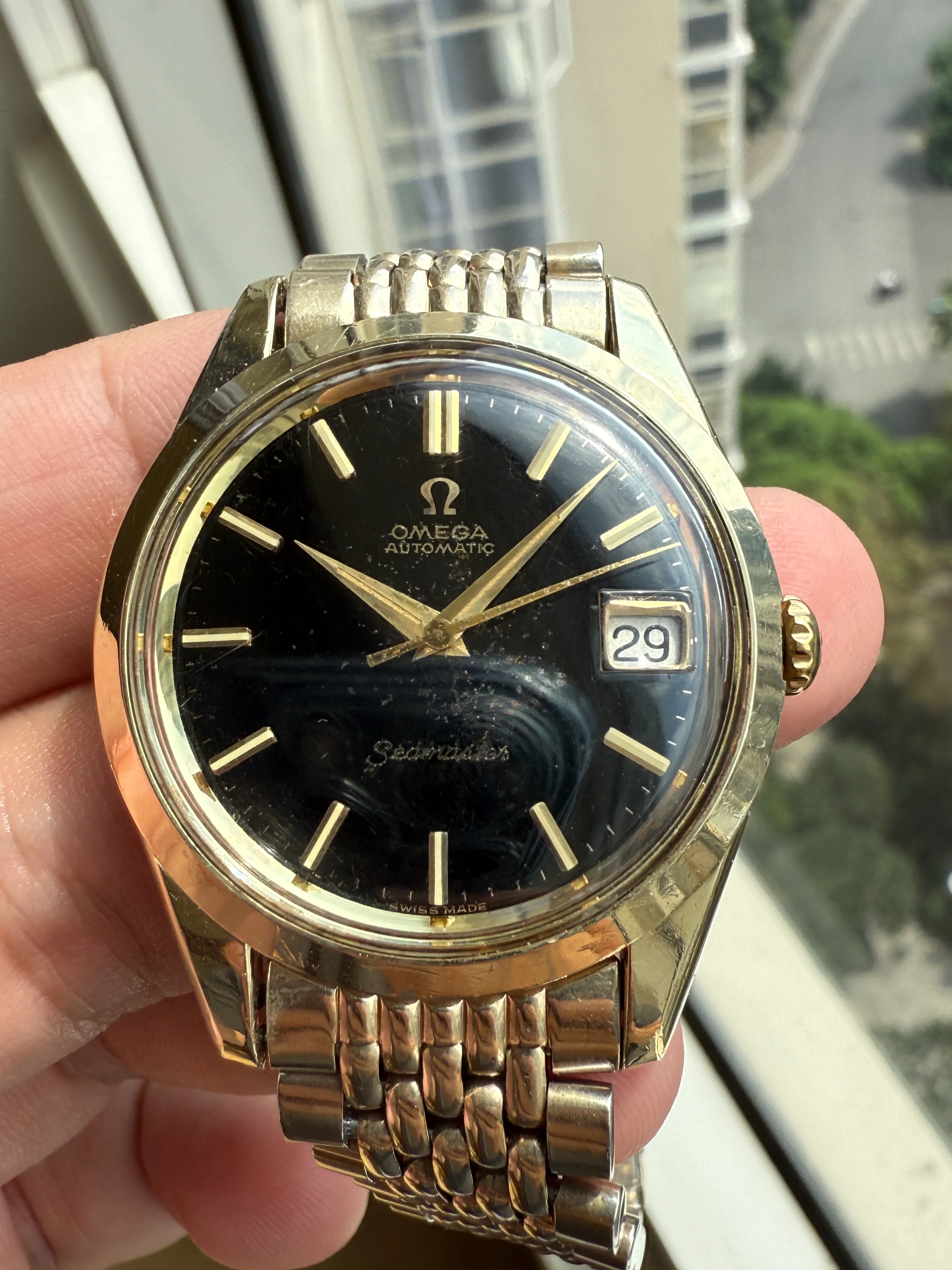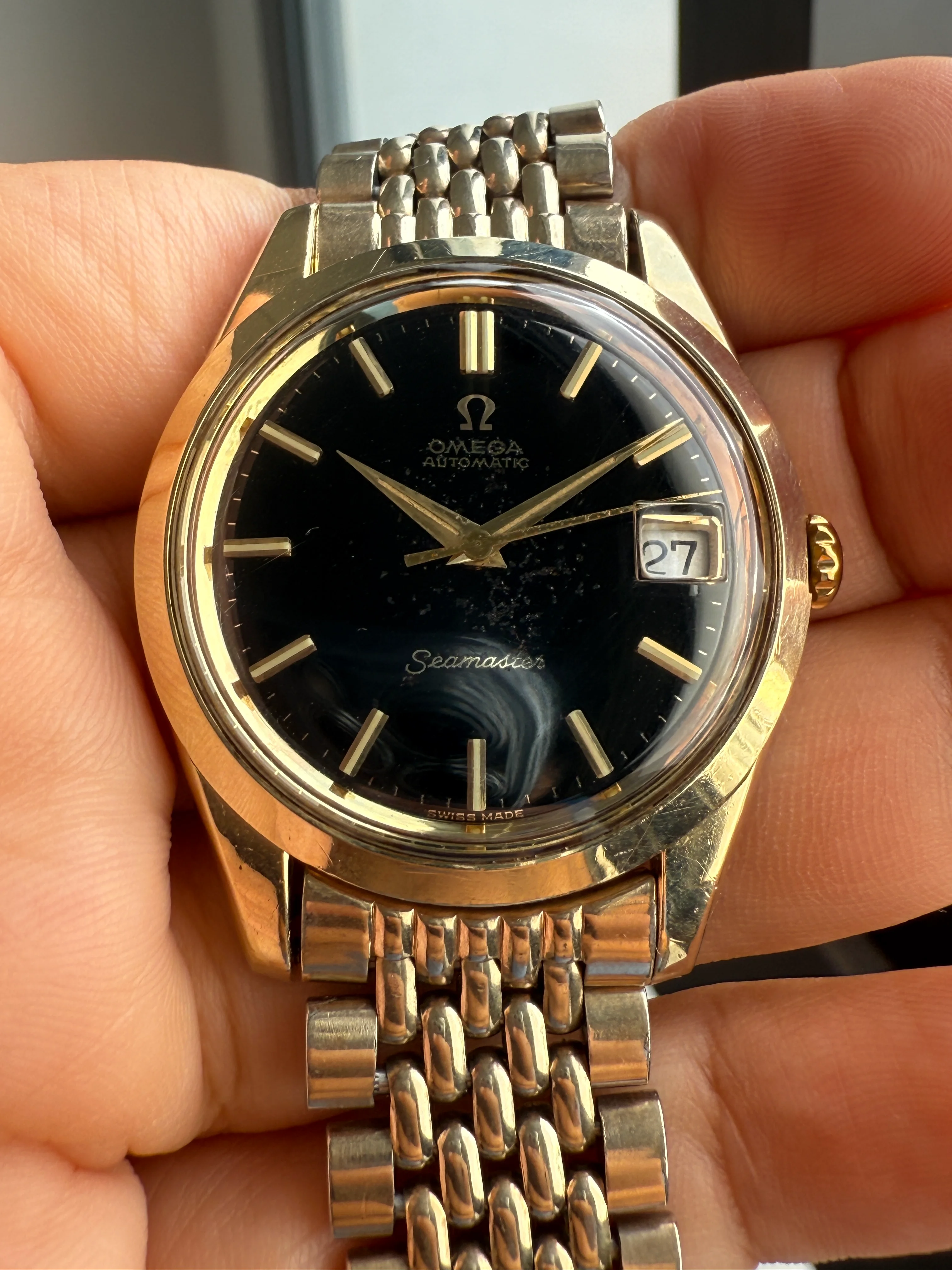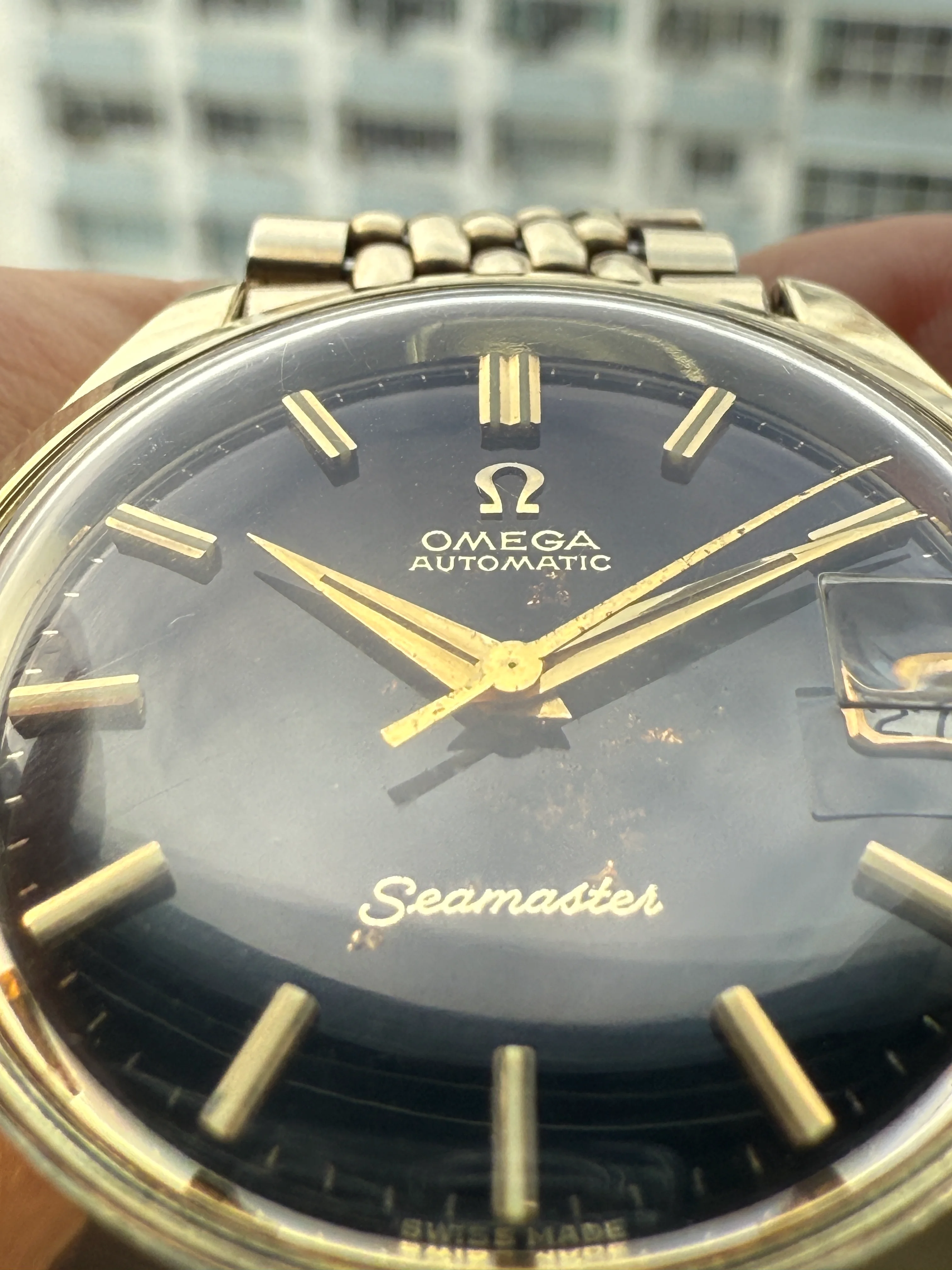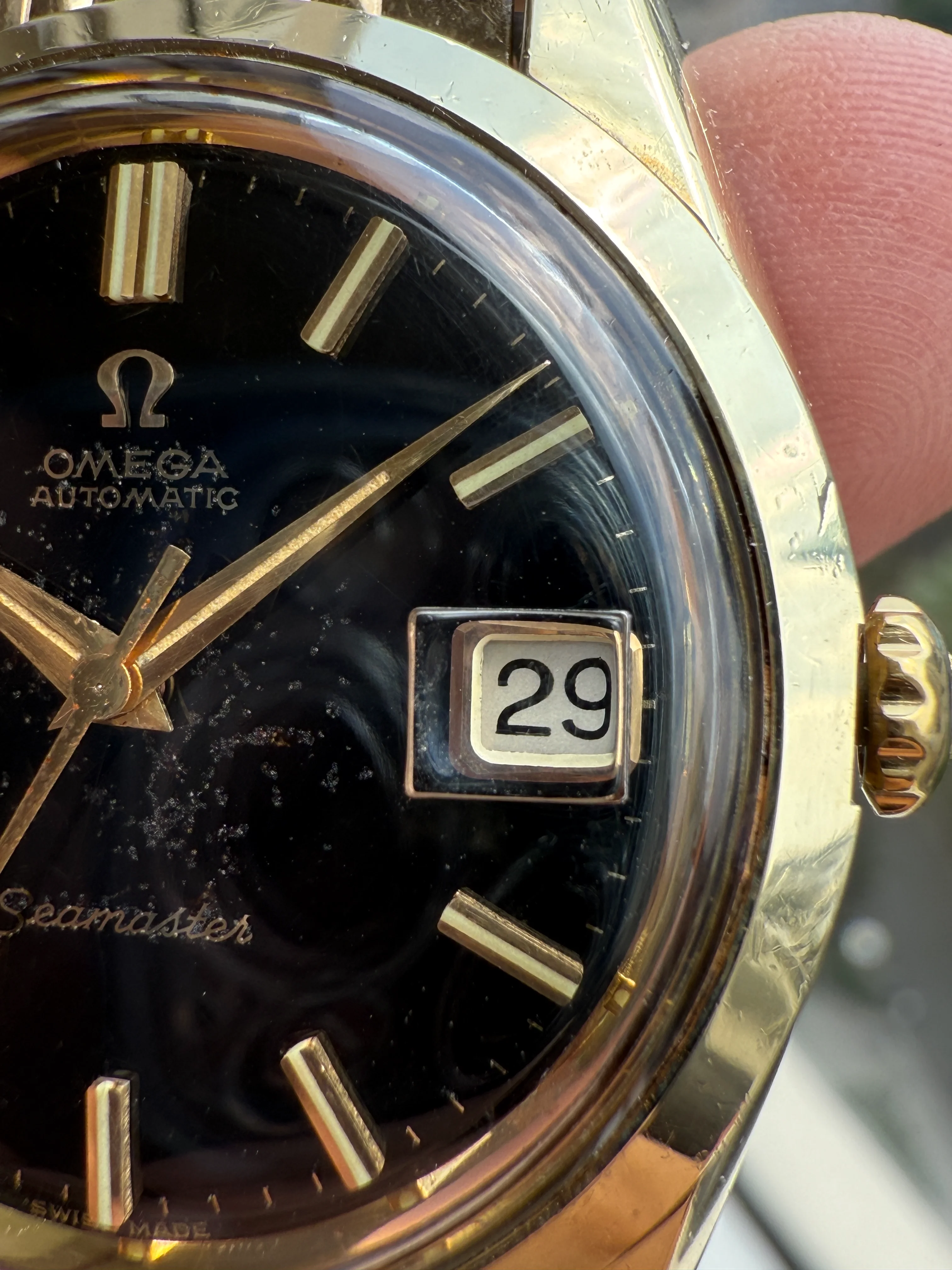 Hi everyone, it's so nice I could come back here after spending one month in the "Watches for sale" section. For sale today is a very nice Omega 166.010, black gilt dial (re-posted).