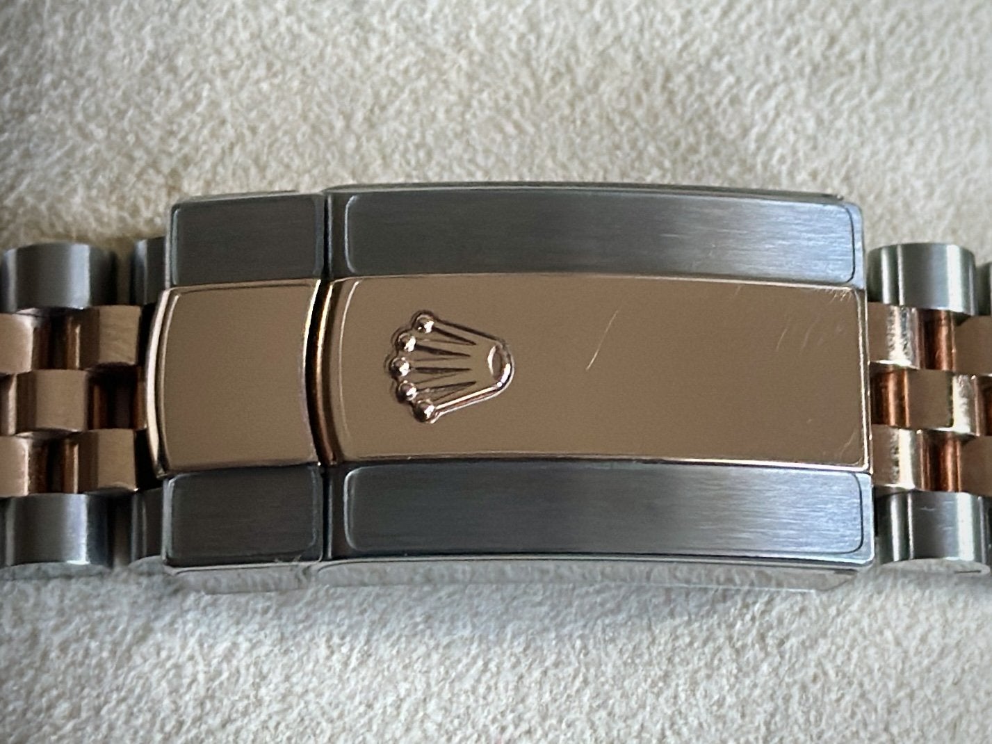 DJ41 Two-tone Steel & Rosegold with Fluted Bezel and Jubilee Bracelet in VG Condition! Very light hairline on clasp right before owner installed aftermarket stickers. Comes as a full set with inner/outer boxes, outer sleeve, white serial tag, green cosc tag, bezel protector, booklets, card holder and warrranty card dated 01.2022. Factory Warranty til 2027