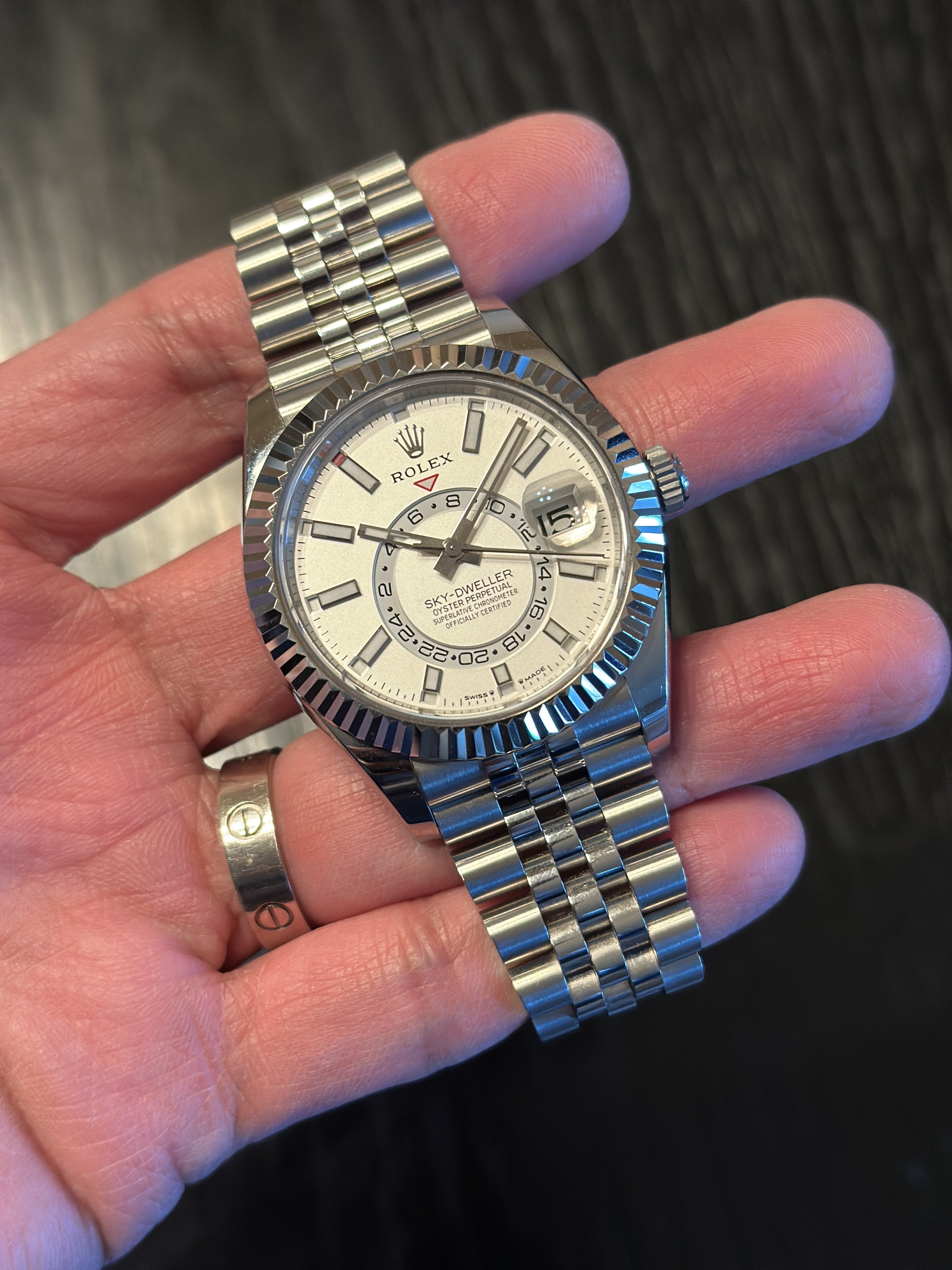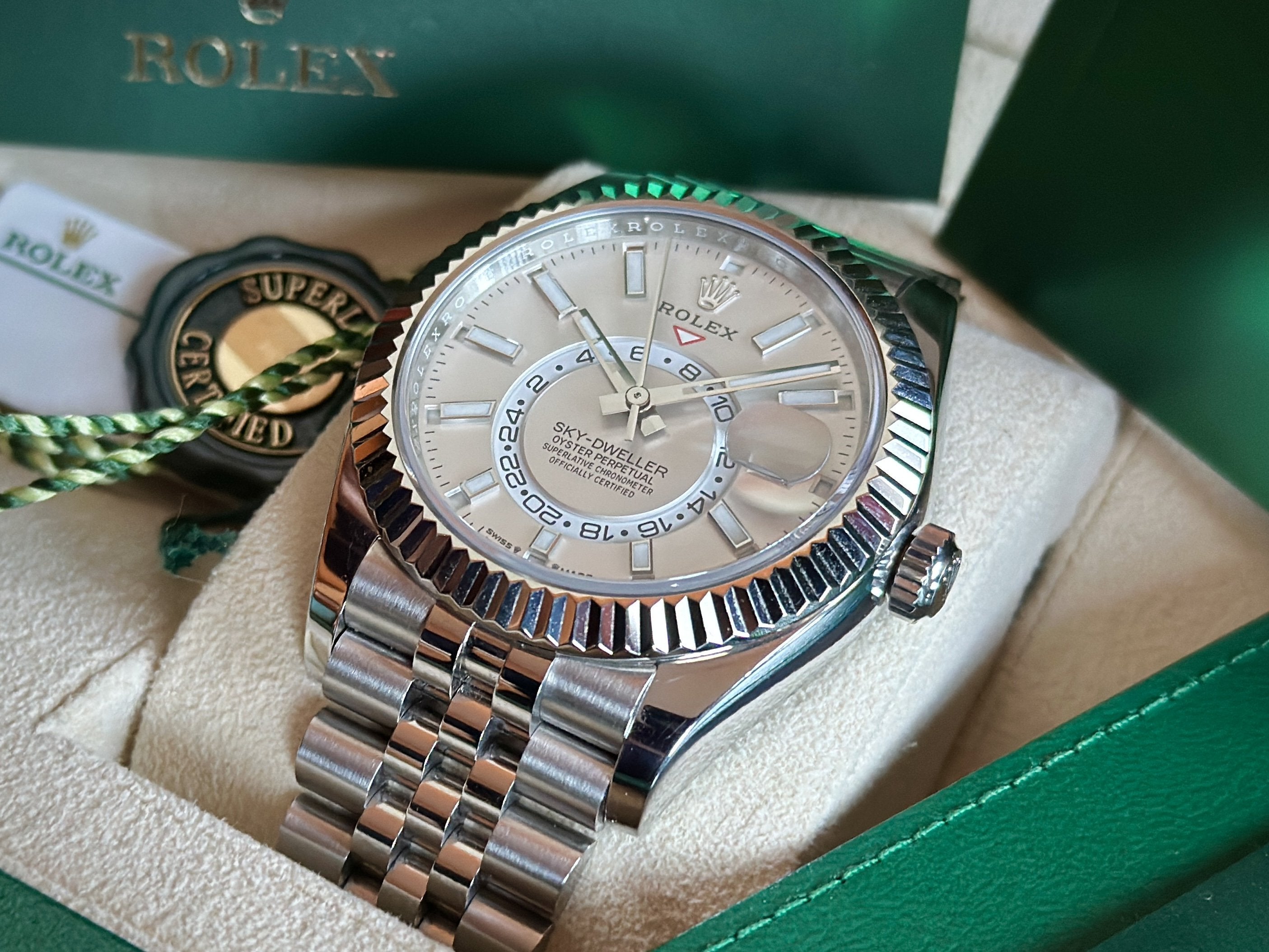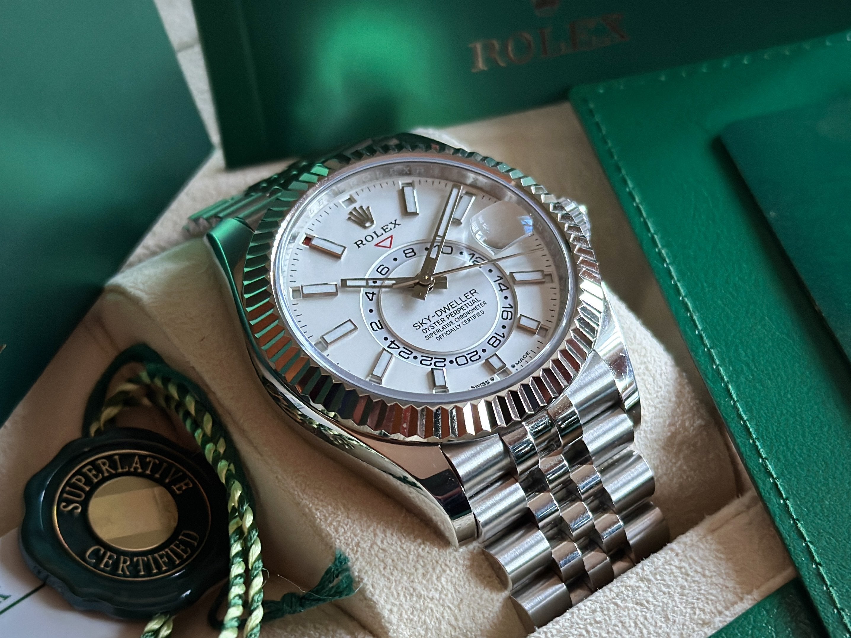 42mm Sky-Dweller, most complicated R0LEX model in VG Condition! Watch shows minor hairlines on polished side of case and clasp. Comes complete with inner/outer boxes, white serial tag, green cosc tag, booklets, card holder and warranty card dated 12.2023. Factory Warranty til 2028