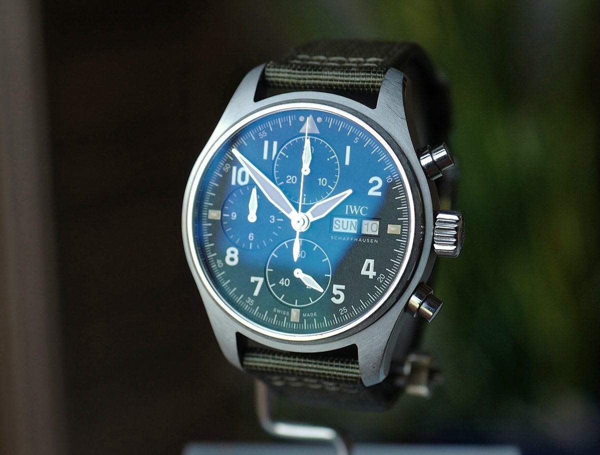 Preowned in excellent condition and guaranteed to be 100% authentic. IWC Pilot's Spitfire Chronograph and day/date function. Black Dial with vintage style cream-colored luminous markers and hands. Military style nylon green Strap. Model IW387901. Stainless Steel case that measures 41mm. Engraved tang clasp. Fixed bezel. Dial description: Silver tone luminous hands and Arabic/Index hour markers with minute markers around the outer rim with 3 sub-dials on a Black dial. Automatic self-winding (when worn) movement. Chronograph sub-dials display: 60 Second, 30 Minute, 12 Hours. Calendar: Day of the Week and Date in 3 o'clock area. Powered by IWC Calibre 69380 engine with a 46 hours power reserve. Watch functions: Date, Power Reserve, Hour, Minute, Second, Chronograph, Day. Screw in crown. Scratch Resistant Sapphire crystal. Case thickness: 15.30mm. Solid case back. Water resistant to 60 Meters - 200 Feet. Also known as model: IW3879-01, 3879-01, 387901, IW3879.01.