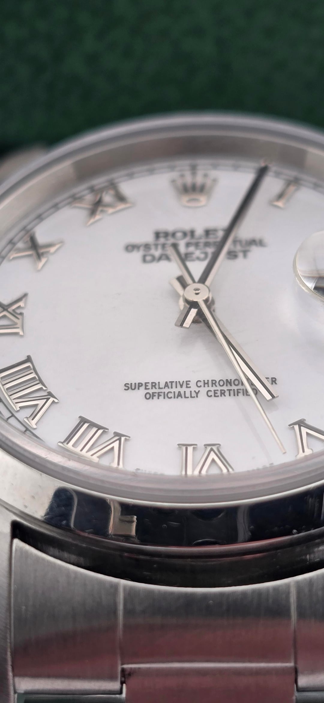 For sale is a Rolex Datejust with a beautiful white Roman Dial.
