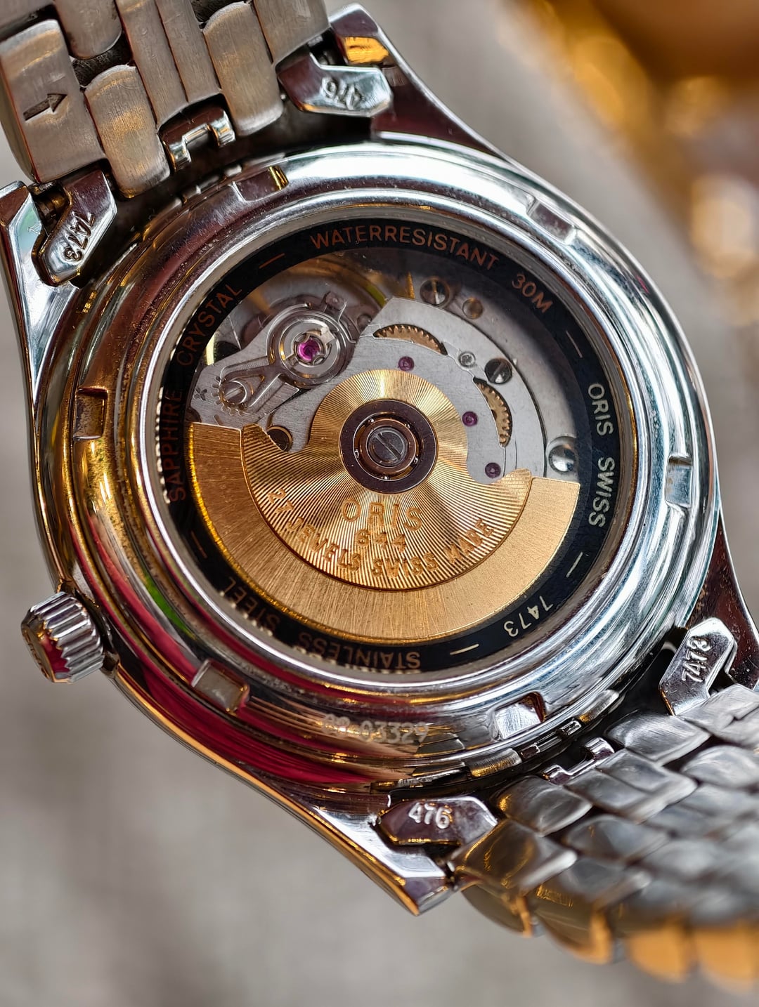 Automatic Oris movement with reverse pointer date and small seconds. Freshly serviced and running well. All parts original.