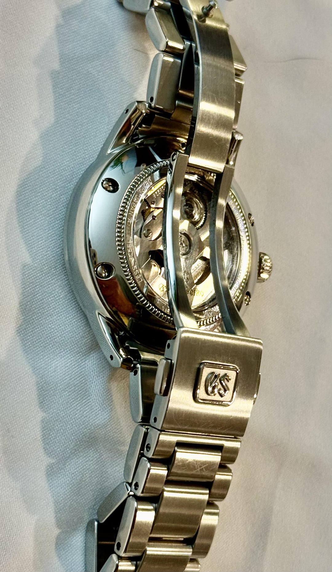 Here’s a chance to pick up the sold out limited edition Hodiknee x Grand Seiko GMT on stainless steel bracelet. Grand Seiko SBGM239 Automatic GMT - numbered 089/500 and comes as a full set. Dial is stunning twilight blue with silver accents (exclusive to this limited edition), pictures don’t really do it justice. The Zaratsu polished indices sparkle and grab light, almost looking like diamonds at times. Price $3250 with 2-3 dat express shipping to FedEx store near you. 39.5mm case size 13.7mm thickness 19mm lug width Powered by the renowned Grand Seiko 9S66 Automatic GMT movement. Complete set: Outer box, inner box, rice paper, hang tag, cloth pouch, GS inspection certificate, manual, and original warranty booklet. Watch is in very good shape with only a few light scratches on the bracelet (can easily be brushed out). Case and crystal are clean. One of the tiny end screws for an extra link was lost, if this was needed it can easily be replaced at a GS AD, GS customer service or a watch maker. 39.5mm case size 13.7mm thickness 19mm lug width Display case back Please comment before reaching out. Thanks for looking.