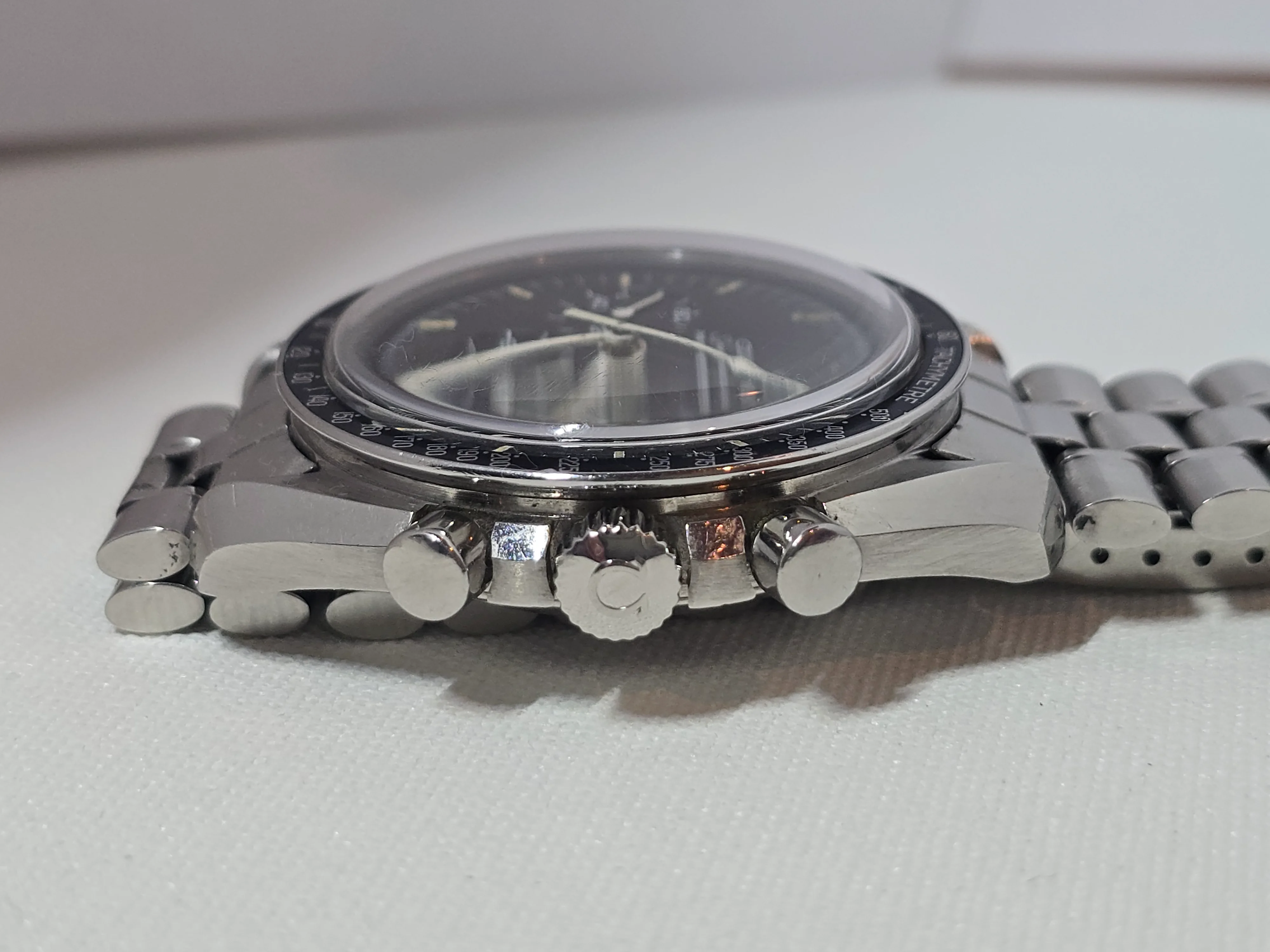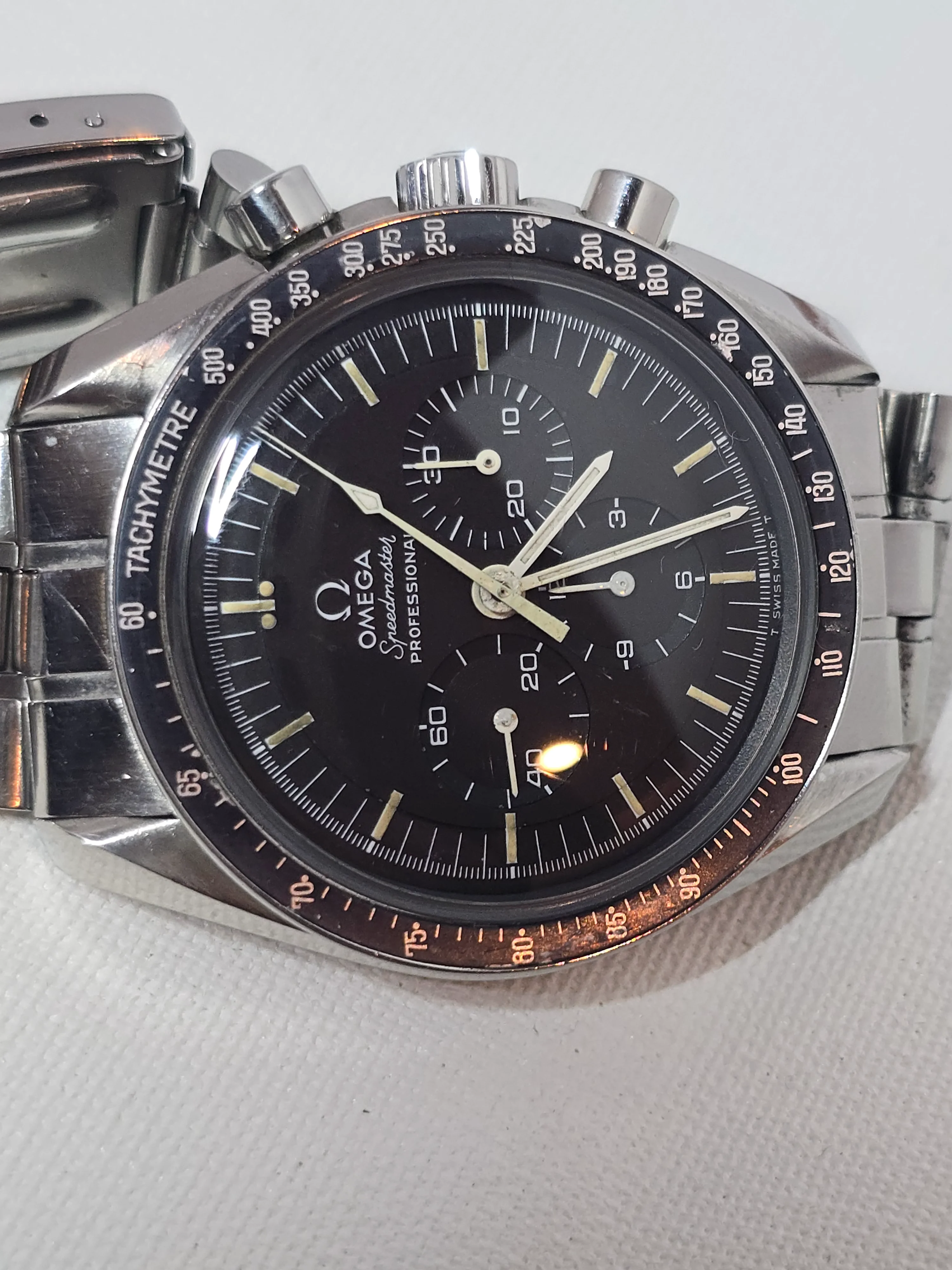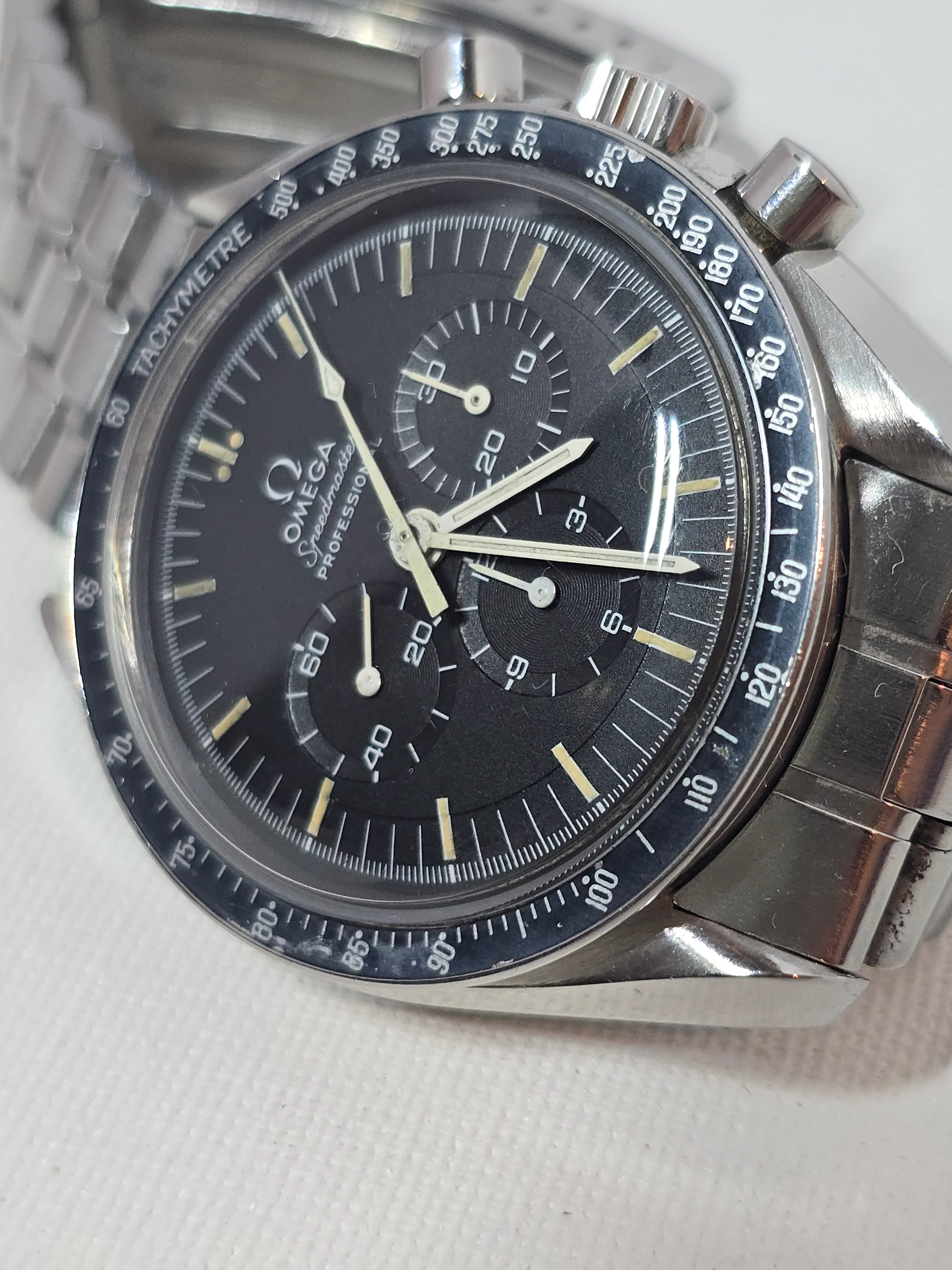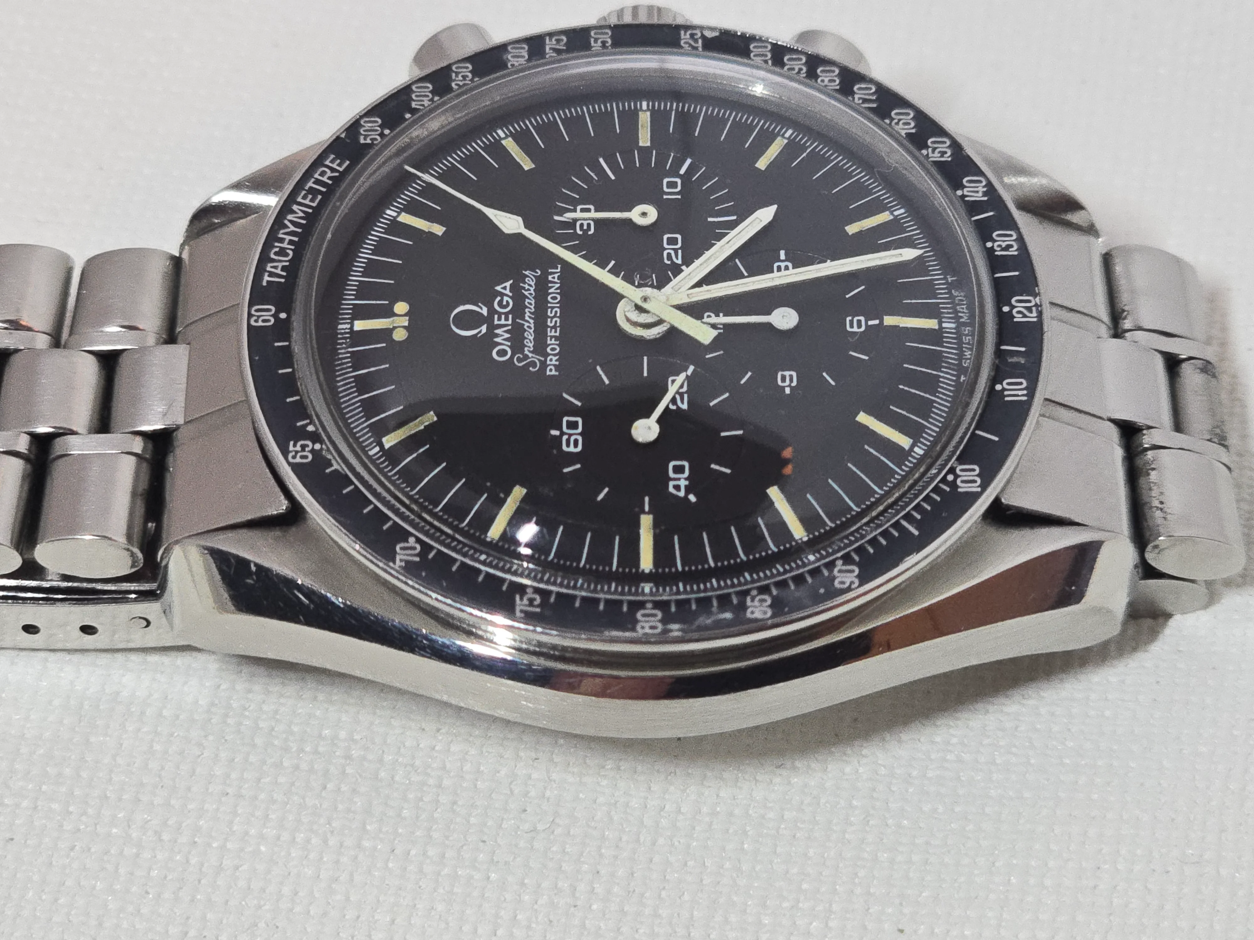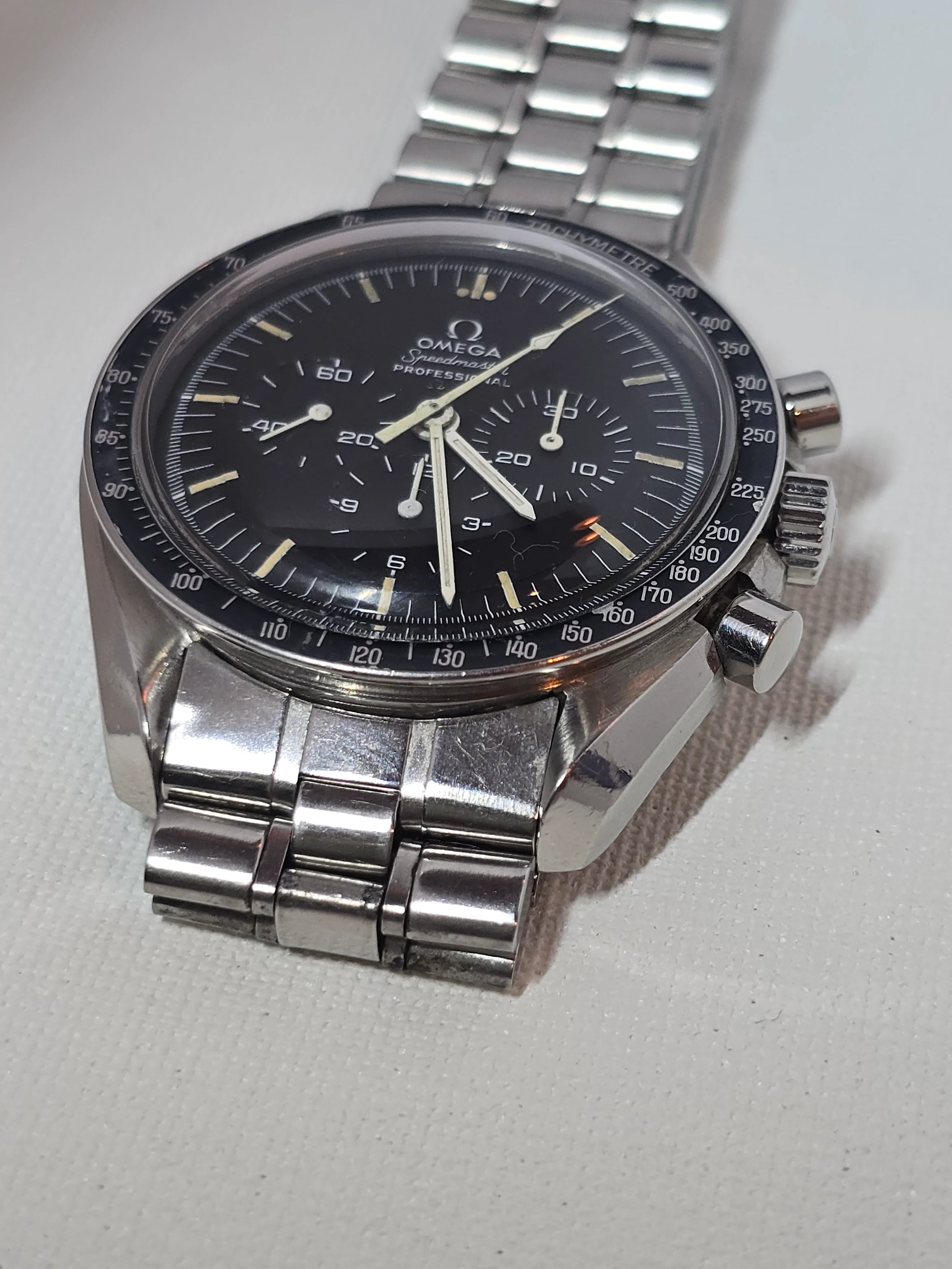 145.022-69 Speedmaster with straight writing Apollo XI caseback. Includes correct 1116 bracelet with endlinks. No accessories. Serviced Nov 2023.