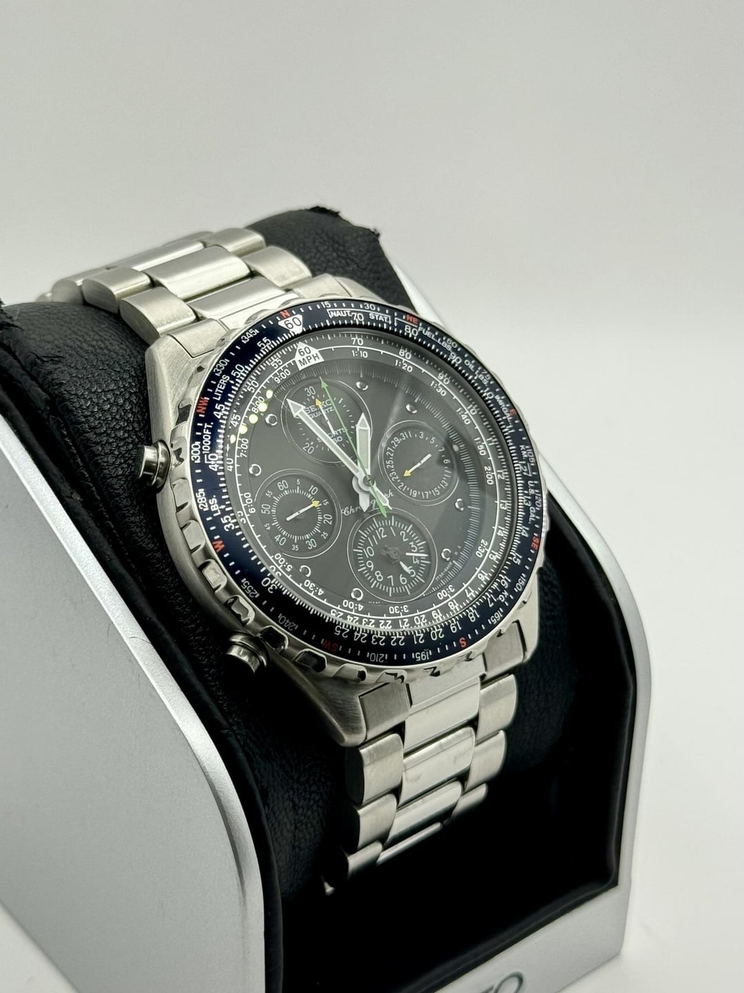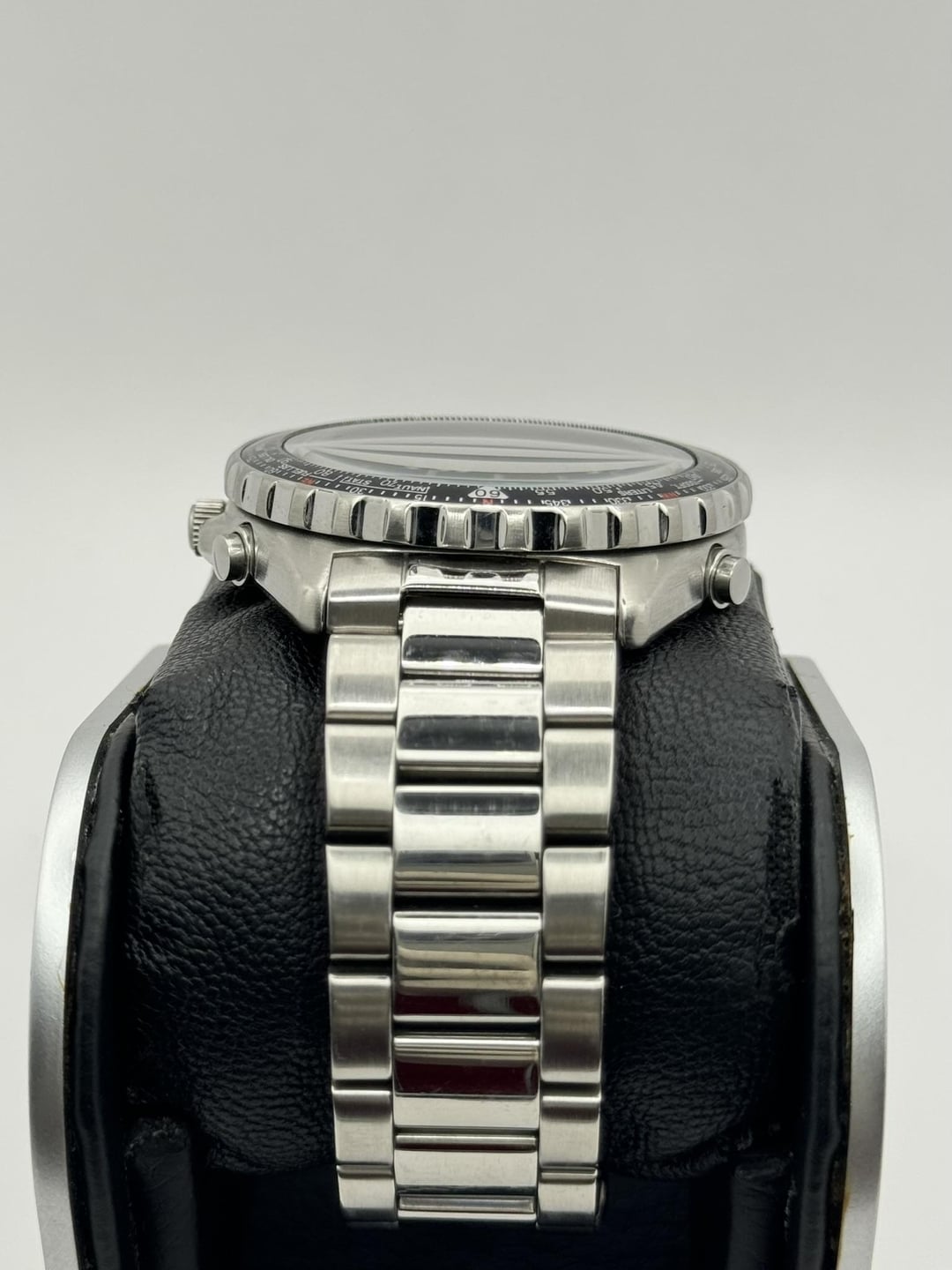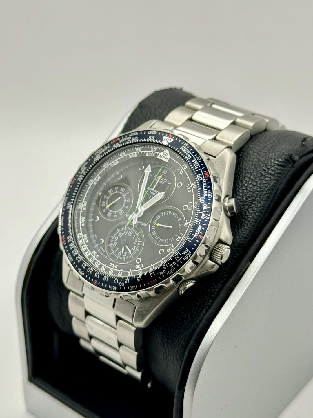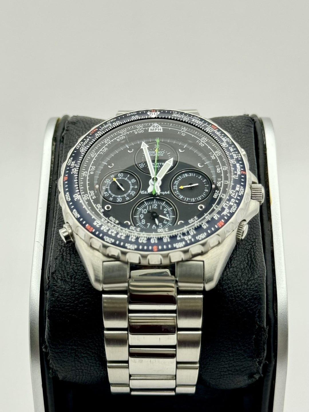 Hi everyone, Up for sale is a Seiko 7T34-6A00 Flightmaster quartz chronograph. Here is everything you need to know: Specifications: * Reference Number: 7T34-6A00 * Serial Number: 2D0XXX * Year of Production: December 1992 * Movement: Seiko 7T34 Quartz; features include chronograph, alarm, and date display * Case Material: Stainless Steel * Case Diameter: 43 mm * Lug Width: 20 mm * Dial: Black dial with black sub-dials in excellent condition * Crystal: Original glass with a fine scratch at the 11 o'clock position * Bracelet: Original stainless steel bracelet (\~18.5 cm) * Bezel: Bidirectional rotating bezel * Additional Features: All functions, including the alarm, are fully operational Condition: This Seiko 7T34 Flightmaster is in very good condition. All functions, including the often delicate alarm, operate flawlessly. The bidirectional rotating bezel and original signed bracelet enhance the authentic character of this watch. Please note, the watch is sold without the original box and papers. Shipping is from Budapest, Hungary insured. Price: $315 per PayPal F&F (or G&S +5%). I take over the shipping cost from the EU. If you're interested or have any questions, please don't hesitate to reach out to me. Thanks for considering this timeless piece, and happy collecting!