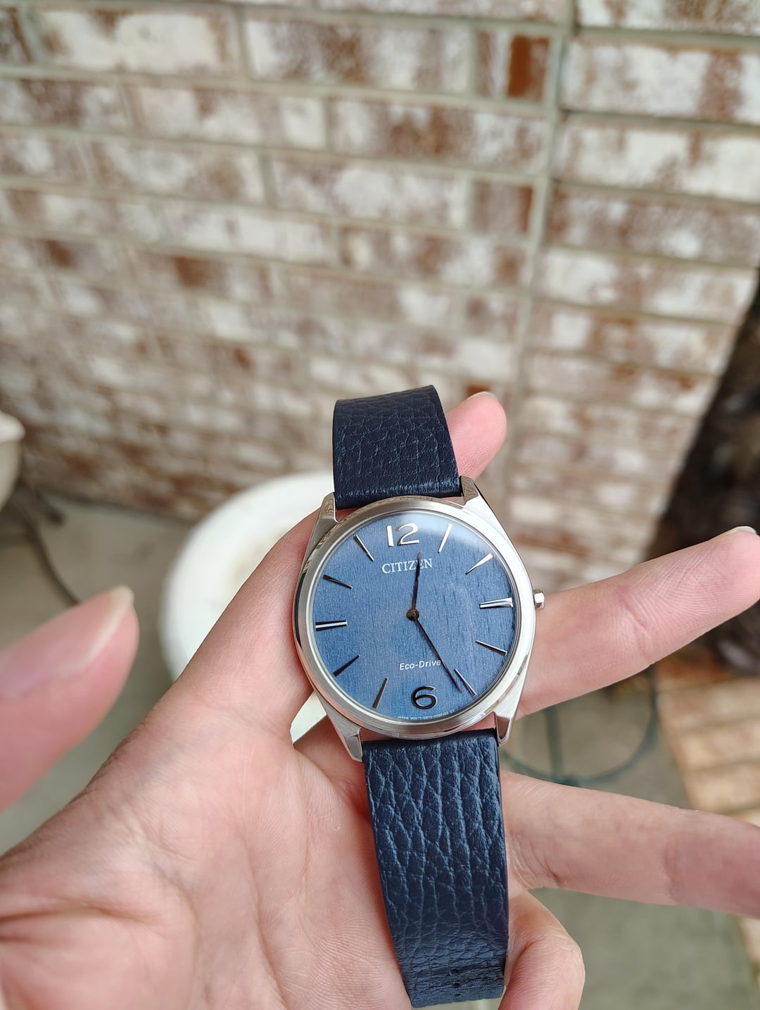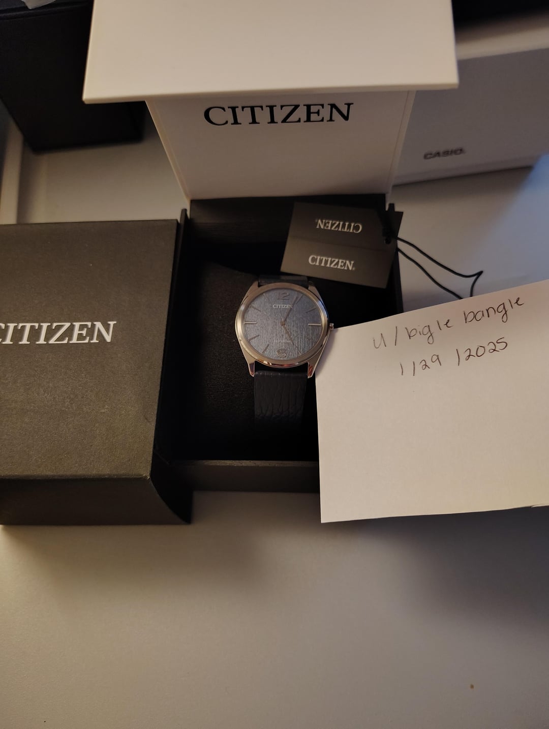 Hello! Up for sale is a Citizen Suratto. Very thin watch that makes it incredible to wear. Dial has an amazing striped texture as well. Watch is in excellent condition, pretty much the only signs of wear you'll see is on the strap. **Price:** **215$** via Paypal F&F. Shipped CONUS **Timestamp**: [https://imgur.com/a/ExLOU93](https://imgur.com/a/ExLOU93) **Movement:** Ecodrive **Case:** Stainless steel 316 L **Diameter:** 38.4 mm **Height:** 4.5 mm **Lug width:** 21 mm **Crystal:** Sapphire