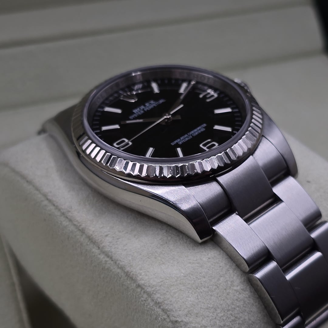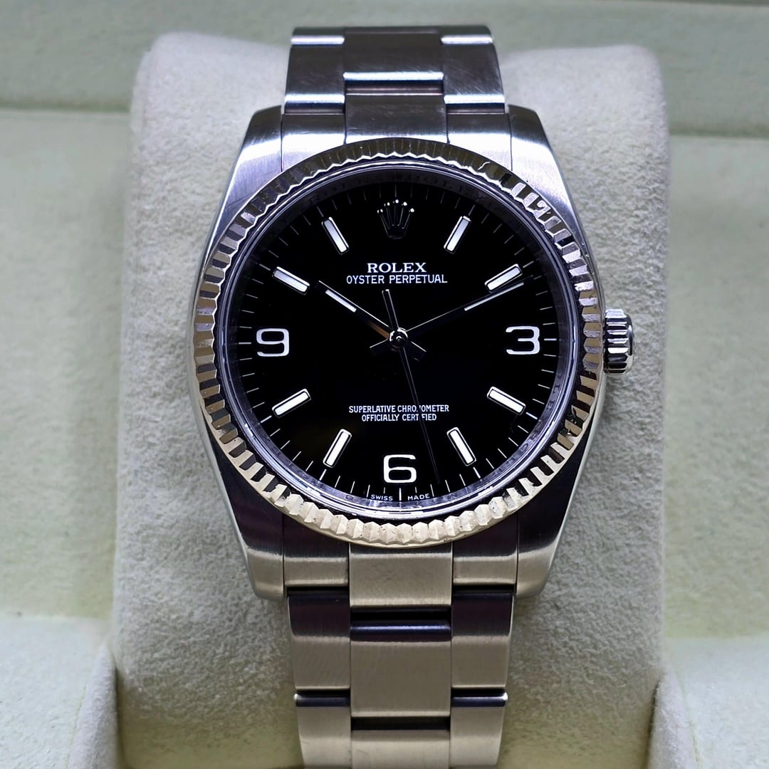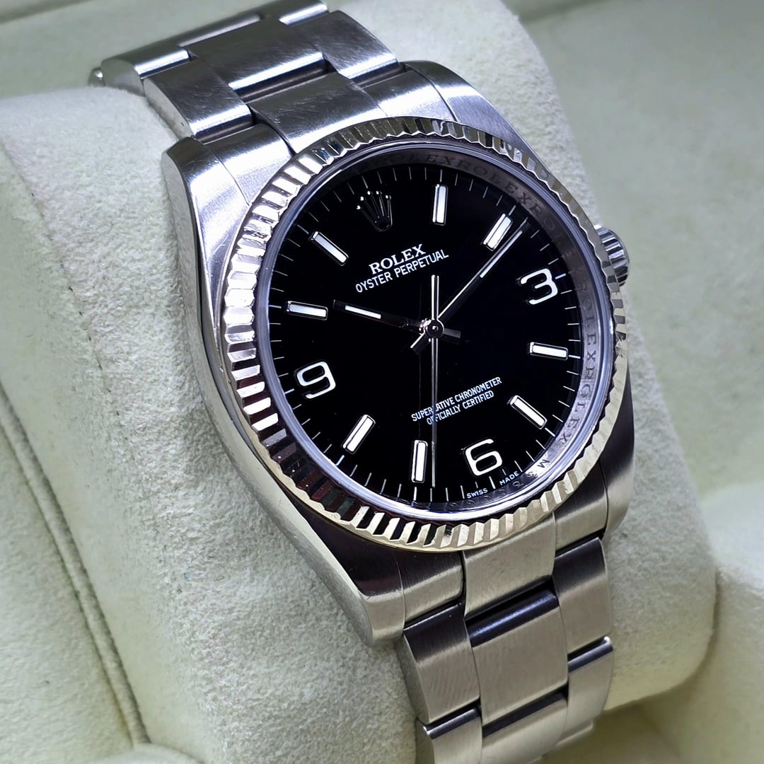 For Sale here is a very cool variant of the 36mm Oyster Perpetual. This is an M serial, so \~2007 production. They weren't made for very long with the white gold bezel, and were soon discontinued for the 116000 reference with the solid steel bezel. This timepiece was service at Rolex Service center in 2023, and so is still under the RSC Warranty! It does also come with a genuine steel bezel, if you want to change up the look. Asking price is $5,500 **All watches sold by us come with a 1 year warranty on movement, case, and bracelet functionality.** We have been trading luxury timepieces since 2017 and operate out of the southeast United States. Accepted forms of payment are wire transfer, trades for other watches, or crypto +2%. Turn your digital coins and memes to IRL assets! After payment has been received, we ship out promptly using Fedex Priority Overnight, fully covered by a private insurance company. Packages are sent to a Fedex Office or Ship Center to be held for pickup. Armored carrier or personal delivery will be arranged for pieces valued over $150k. More pictures or video available on request! Plenty of references available, so deal with confidence! We pride ourselves on customer service, communication, and will do what you need to make this a comfortable transaction. Most brands and models of luxury timepiece are accepted on trade. Rolex, Audemars Piguet, Patek Phillipe, Richard Mille, Hublot, Panerai, Zenith, Breitling, Vacheron Contantin, F/P. Journe, A. Lange & Sohne, etc. I can do cash either way or multi-watch trades for the right deal! Check out our other listings on mechanical-art . com