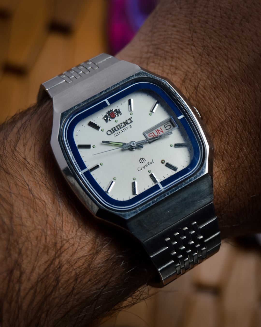 [Timestamp](https://imgur.com/a/4yCTULO) Up for grabs is a charming vintage Orient Crystal Quartz from the 1980s, featuring a retro TV-style case and a linen-textured dial. The clean white dial is accented by sleek stick hands and indices, while the blue lining on the inner bezel provides a bold, stylish contrast. The watch comes fitted with its original stainless steel bracelet, further enhancing its vintage appeal. It's a versatile timepiece that works well for both collectors and casual wearers seeking something unique. Key Dimensions: * Case Size: 36mm x 42mm * Thickness: 10mm * Lug Width: 19mm I'm asking $99, plus shipping via UPS. Payment options are PayPal F&F or G&S (+4.5% international PayPal G&S fees). Feel free to ask for a custom timestamp or check out my other listings for more vintage gems. Let me know if you're interested!