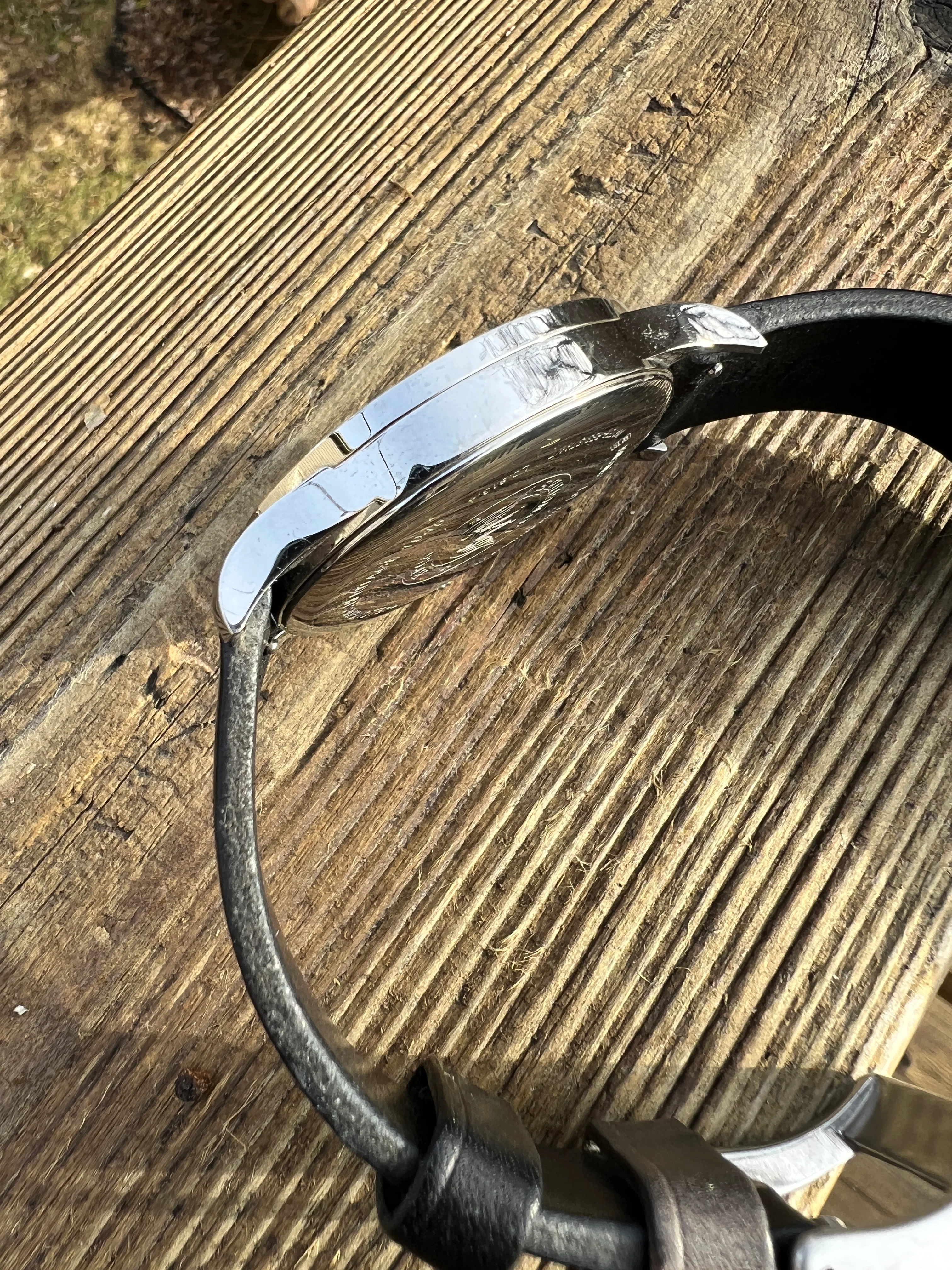 I'm the original owner of this watch, purchased in 2019. I've not worn it a lot, but it does have a few scattered marks here and there. The watch was running a little slow in 2021, so I had it serviced under warranty at that time. I wore it for three consecutive days last week and it lost approximately 3 seconds per day. The pictures below show it with a blue Bas and Lokes strap that matches the hands nicely. I'll include that strap (retail approx. $130) along with the original strap.