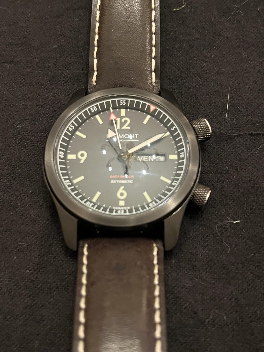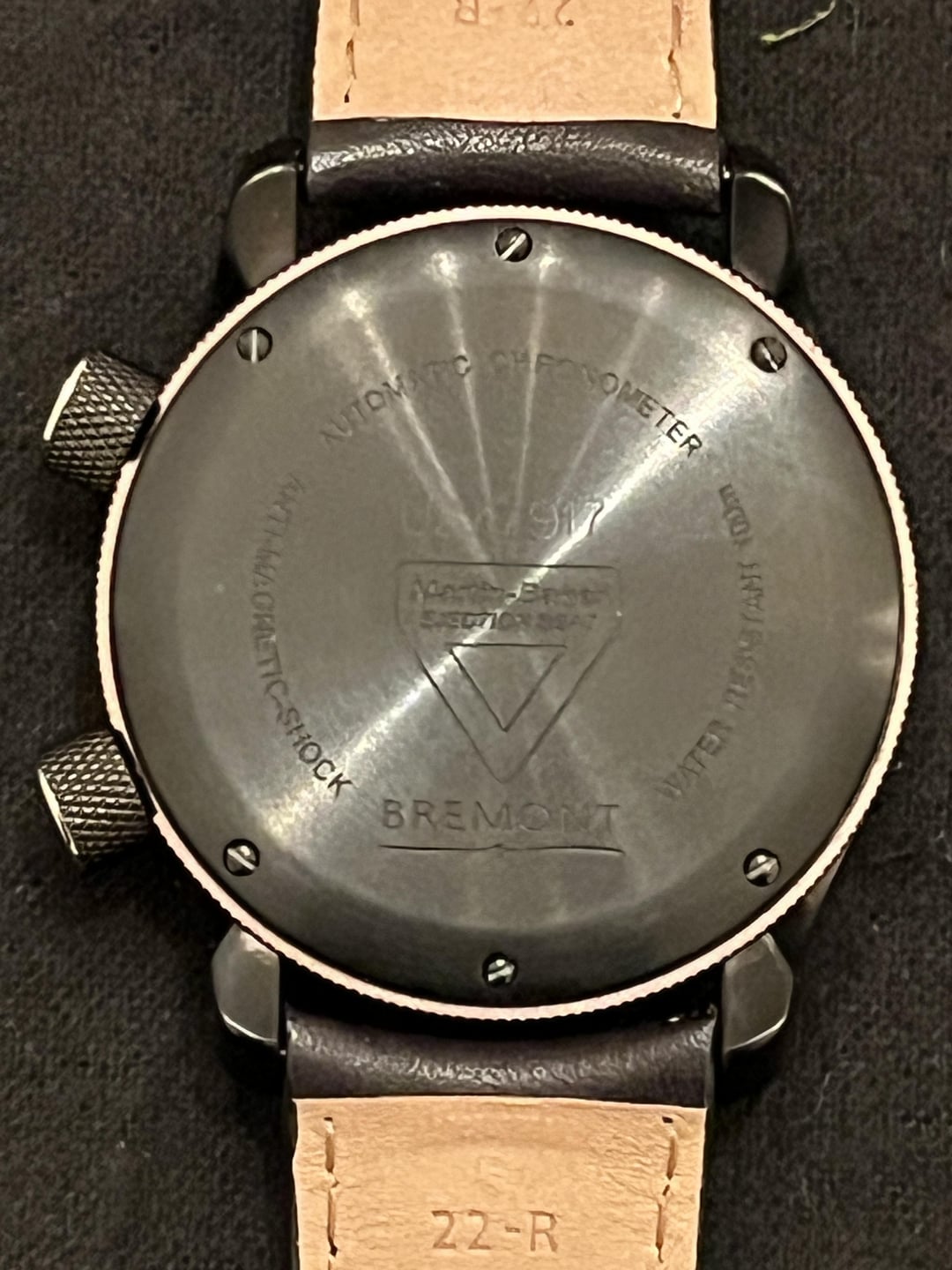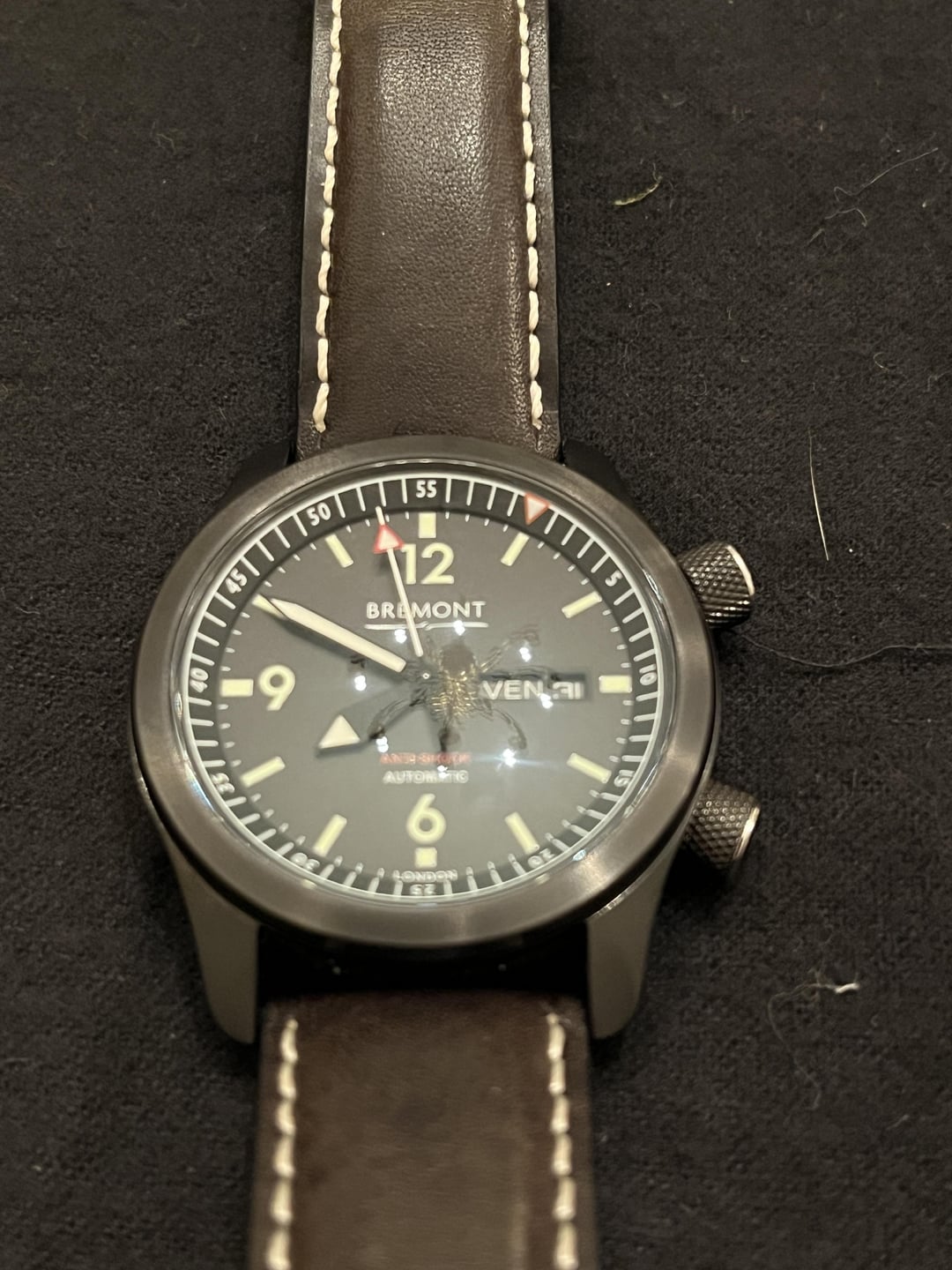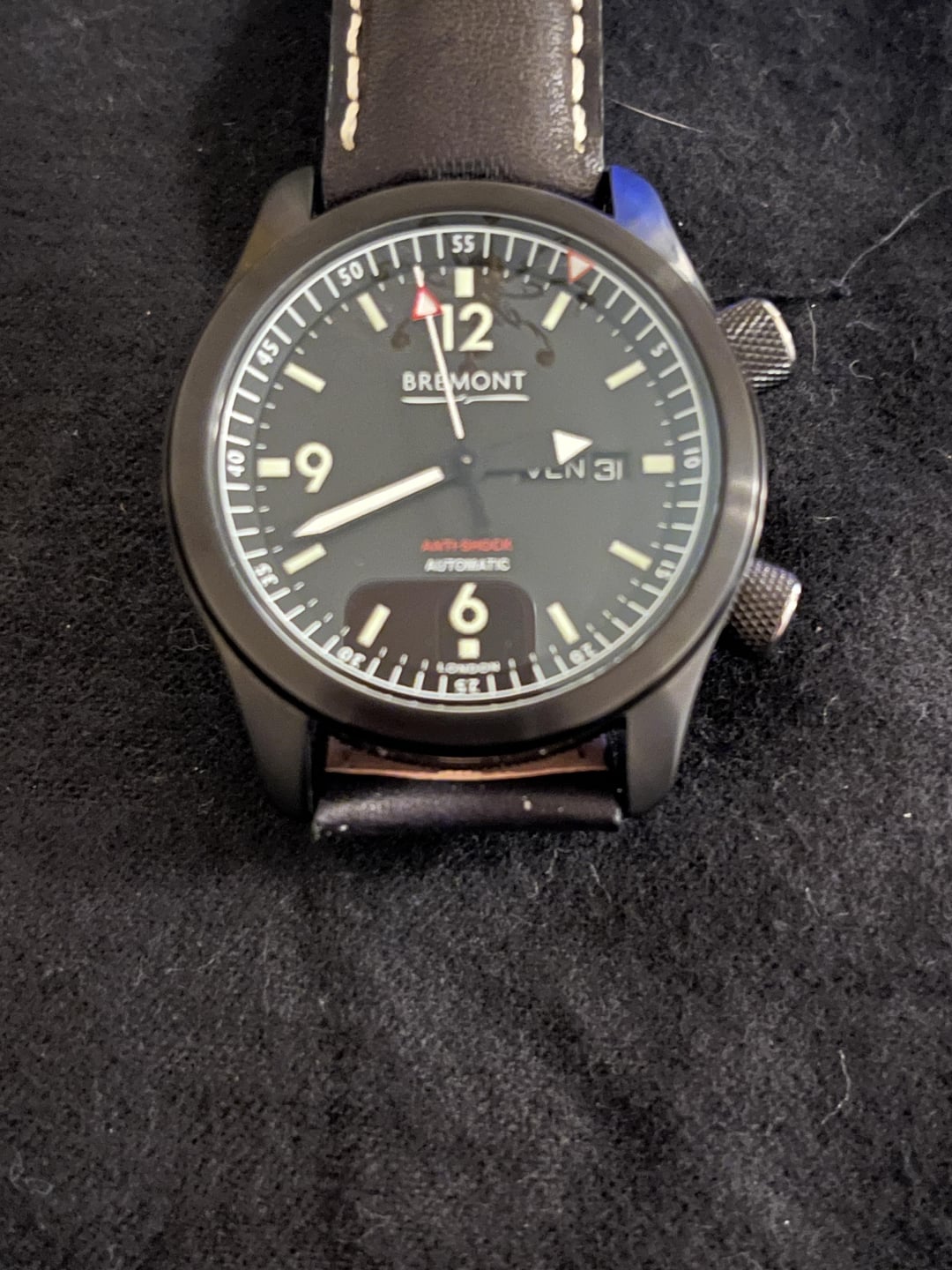 This watch is as stealthy as the U2 for which it was named. This is the quintessential Bremont tool watch with the awesome internal rotating bezel, super compressor-style crowns, DLC coating, and lush leather strap. The watch is hardy and stylish, a true GADA showpiece! I have had the watch for less than a year (bought it NOS), but the watch dates from the mid-to-late-2010s, judging from the minute markers on the internal bezel. The leather strap and the knurled case have faded to a softer black with time. The DLC is basically immaculate. The only flaw (besides the creases in the strap and coloration) is a light scratch in the knurling between 7:45 and 8:15. I have tried to capture the slight imperfection in the photos. I am sad to let this one go because it is an amazing tool and everyday watch. The black is intense. The price is $1900. I will accept PayPal, Venmo, or Zelle. I prefer F&F, but G&S is fine (buyer pays fees). I have reviews here, on eBay, and WUS. I am happy to hop on a call or WhatsApp to establish a personal connection. I SHIP TO THE US AND CANADA unless otherwise arranged. Happy Hunting!