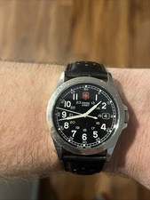 Time stamp/album https://imgur.com/a/5O7WGe3 For sale is a kind of a rare piece of Victorinox Swiss Army (VSA) running a manual wind Unitas movement that runs better than cosc and has about 55 hours of reserve. 44mm case and about 13.5 mm thick with 21 lugs. The leather strap is basically brand new still, genuine VSA Decent lume, pictured in album