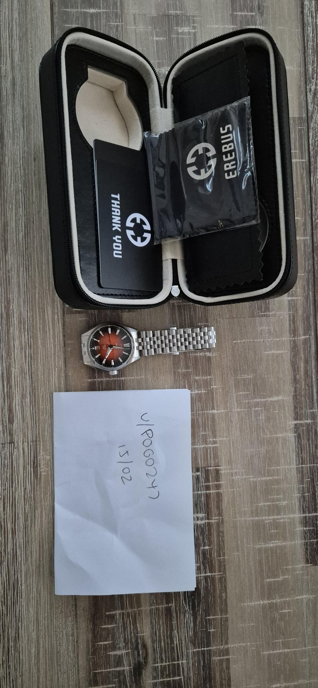 Erebus Ascent Orange Fume for sale. Only worn twice and bracelet is still unworn and in shrink wrap. Will also throw in a fitted rubber strap. Looking for $299 USD net to me plus shipping. Watch is located in Sydney, Australia but happy to post internationally and have done so many times on here and on eBay (100% feedback). Payment preference is via Wise but can also do PayPal G&S (+3%) or F&F CASE: 39mm LUG TO LUG: 44.5mm LUG WIDTH: 20mm THICKNESS: 11mm CROWN: 6mm BEZEL: Fixed Polished GLASS: Double Domed Sapphire with Clear AR Coating LUME: BGW9 Super-LumiNova® on Hands, Indices and Bezel Markers CASE: 316L Brushed and Polished BRACELET: ‘O’-Style or ‘J’-Style in 316L Stainless Steel CLASP: Milled and Adjustable WATER RESISTANCE: 100 Meters MOVEMENT: MIYOTA 9015 Happy to provide any additional photos, videos or proof of ownership etc