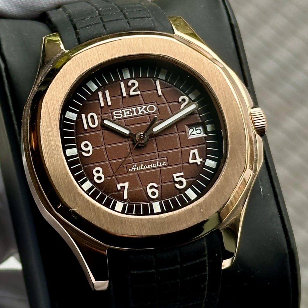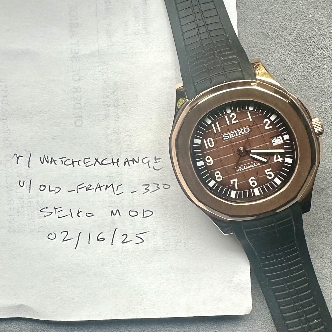 This is a brand new Aquanaut style Seiko Mod. It is a beautiful piece and comes with an uncut OEM style strap that can be cut-to-size for any wrist size. Case material is steel in a rose gold finish with a brown grenade dial and a black rubber strap. Matching rose gold clasp. The strap is very comfortable and sturdy. Case: 41 mm Case Thickness: 11.8 mm Movement: Seiko NH35 Automatic Price: $260 shipoed within CONUS (ships for free) Video Link: [https://imgur.com/a/zCaASbL](https://imgur.com/a/zCaASbL) Comes with a white outer box and black inner box. Please DM me or message me on my Insta @ sfeedytuesday if interested. I am fairly new to Watchexchange (1 sale) but I have a long history and many positive references on Watchuseek.