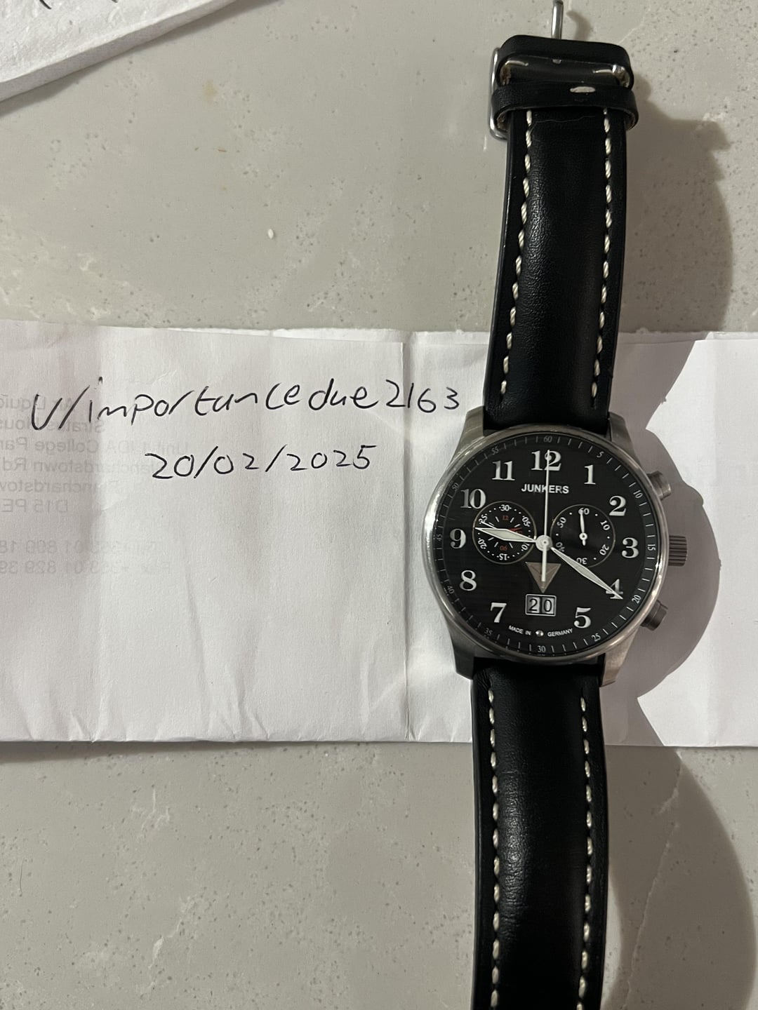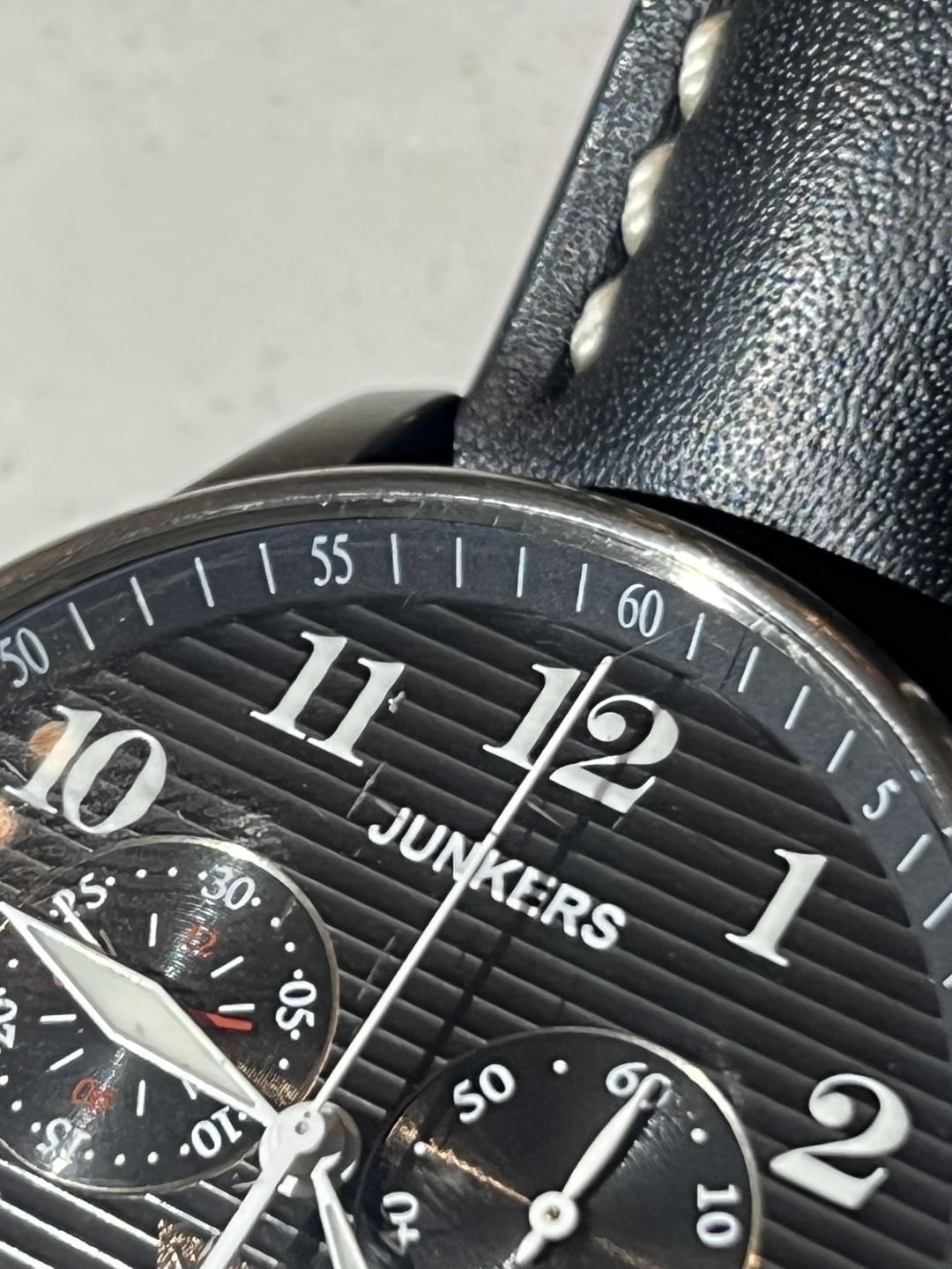 I’m looking to sell my junkers JU52. The watch is in great condition overall apart from a few small scratches on the crystal near the 12 o clock position. These scratches aren’t noticeable unless you are trying to see them. Battery has been replaced recently and runs perfectly. Chronograph runs perfectly aswell. The leather strap has a decent amount of wear as seen in the photos but none of the leather is peeling away. I’m asking $250 which includes worldwide insured shipping. Im also able to FaceTime or answer any questions you have on the watch.