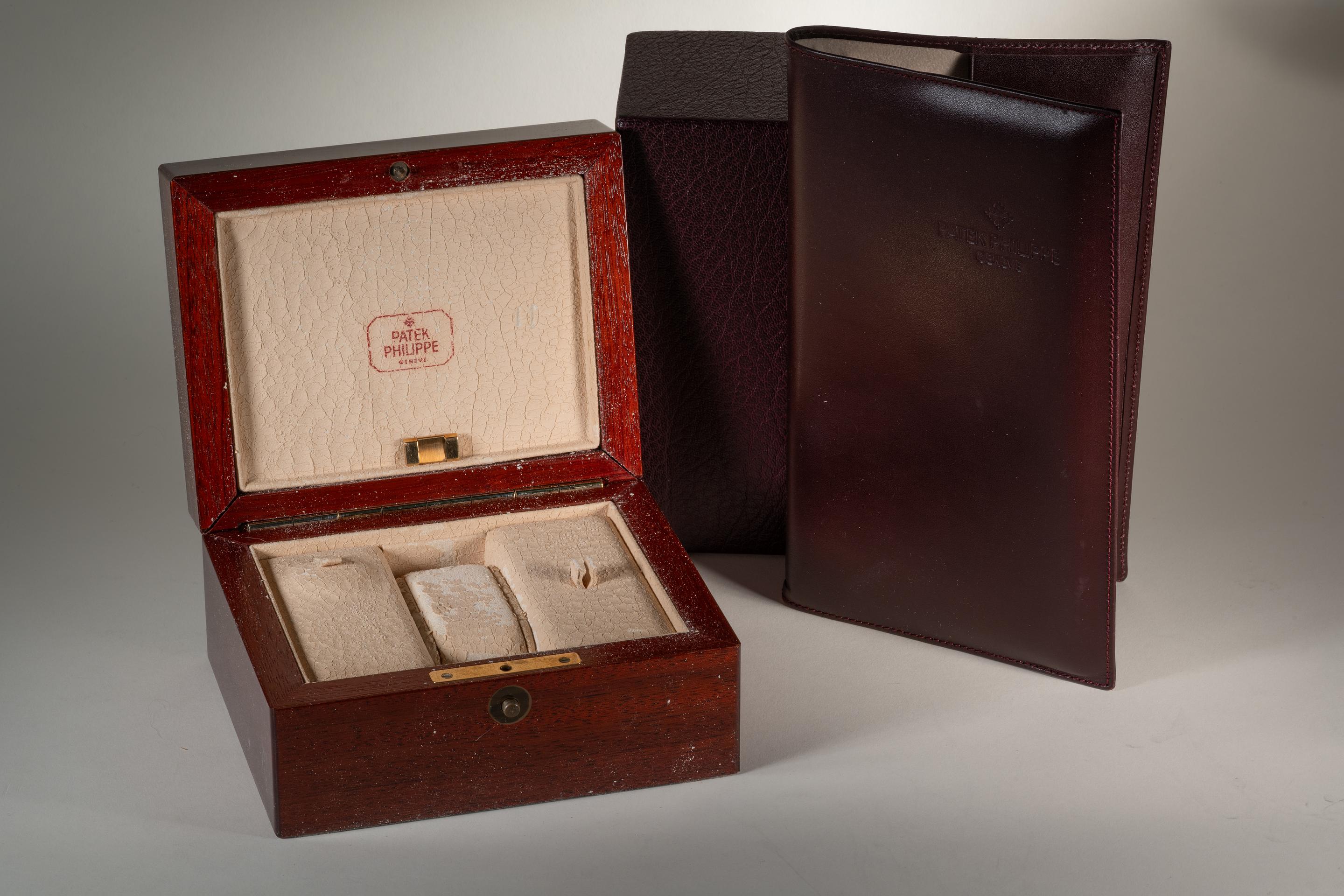 Description: Case: The 38mm 18k yellow gold case is excellent showing a warm rosy patina and only light wear from use. The 18k yellow gold bezel is also in excellent condition showing only light wear form use. Dial: The black grenade tritium dial is excellent showing no visible wear. The lume has aged to a warm vibrant goldenrod hue and the hands have aged significantly lighter than the dial. Bracelet: The 12 link 18K yellow gold Patek bracelet is excellent showing only very light stretch. The watch will fit a 7 inch wrist. Accessories: Box, Papers & Extra Link (Missing the Screw). Notes: In stainless the nautilus bracelet is fine. However it might be one of the few instances where a strap is preferred by most who have an opinion on the matter. In gold however it's a different story. The bracelet with its big chunky brick links seems as though it was designed specifically for gold. Adding to the watch another level of complexity and thrusting it out from under the shadow of it's older brother.