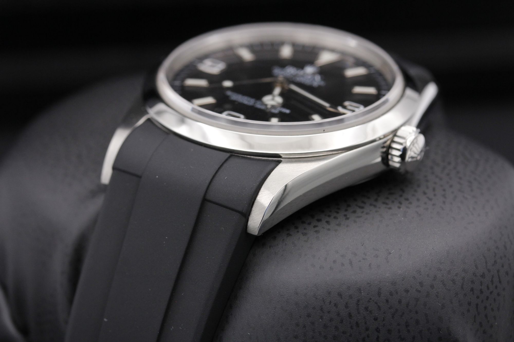 Brand: Rolex Model: Explorer I Reference: 114270 Condition: Pre-Owned Grade: Mint Case Size: 36mm Material: Stainless Steel Dial: Black Bracelet Type: Black Rubber B Strap w. Tang Buckle Movement: Automatic Serial: D - 2005 Age: Modern Box: No Papers: No