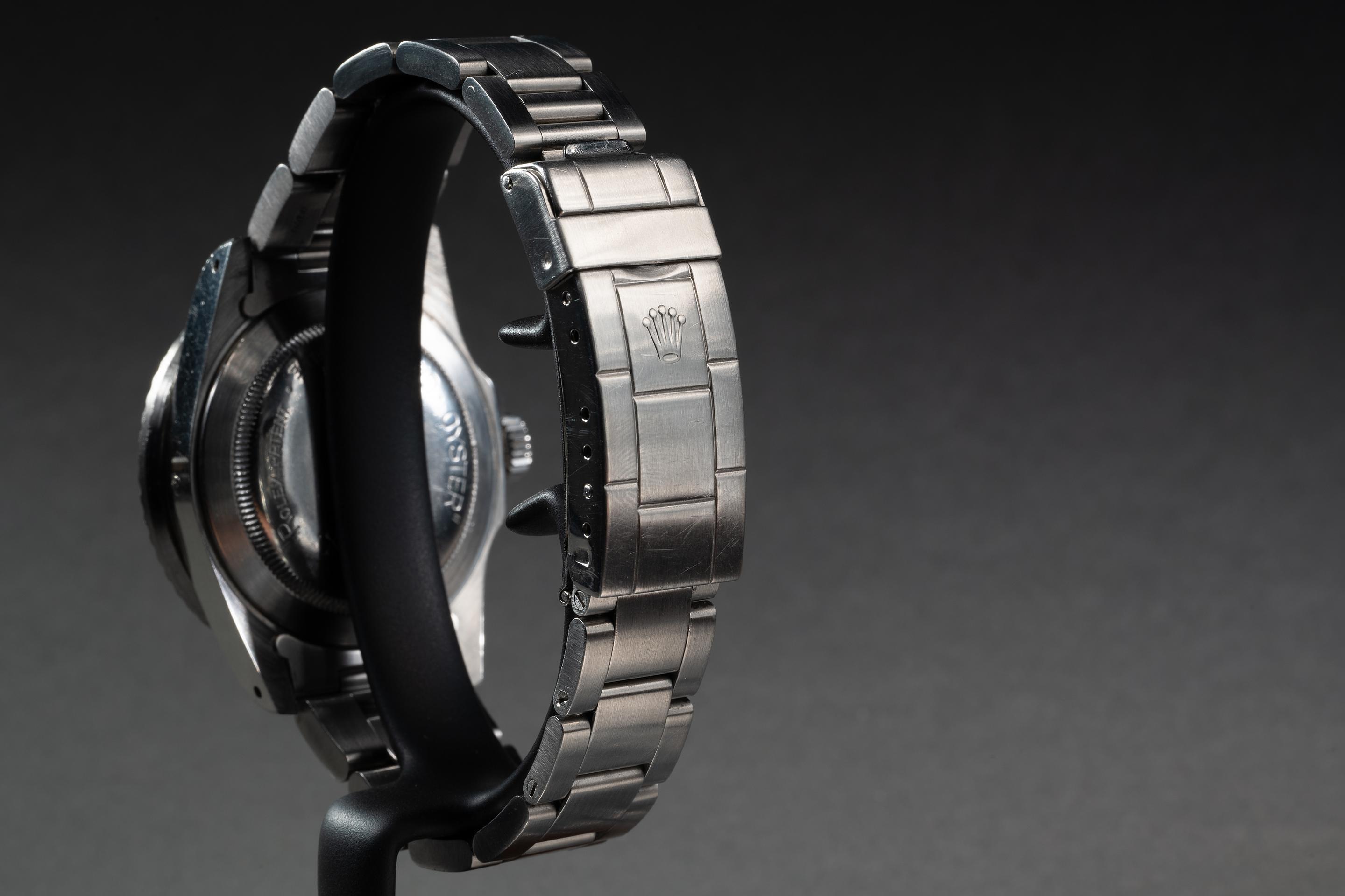 Description: Case: The previously polished case is excellent showing sharp prominent bevels and some light wear from use. The bezel insert is also in excellent condition showing significant fading and only light wear from use. Dial: The matte black MK IV dial is excellent showing only extremely light wear overall. The 11 o'clock index marker shows some light chipping at the very edge of the dial. Bracelet: The 12 link Oyster bracelet is excellent showing only very light stretch for its age. The clasp is stamped with a 1984 date code. Accessories: None.