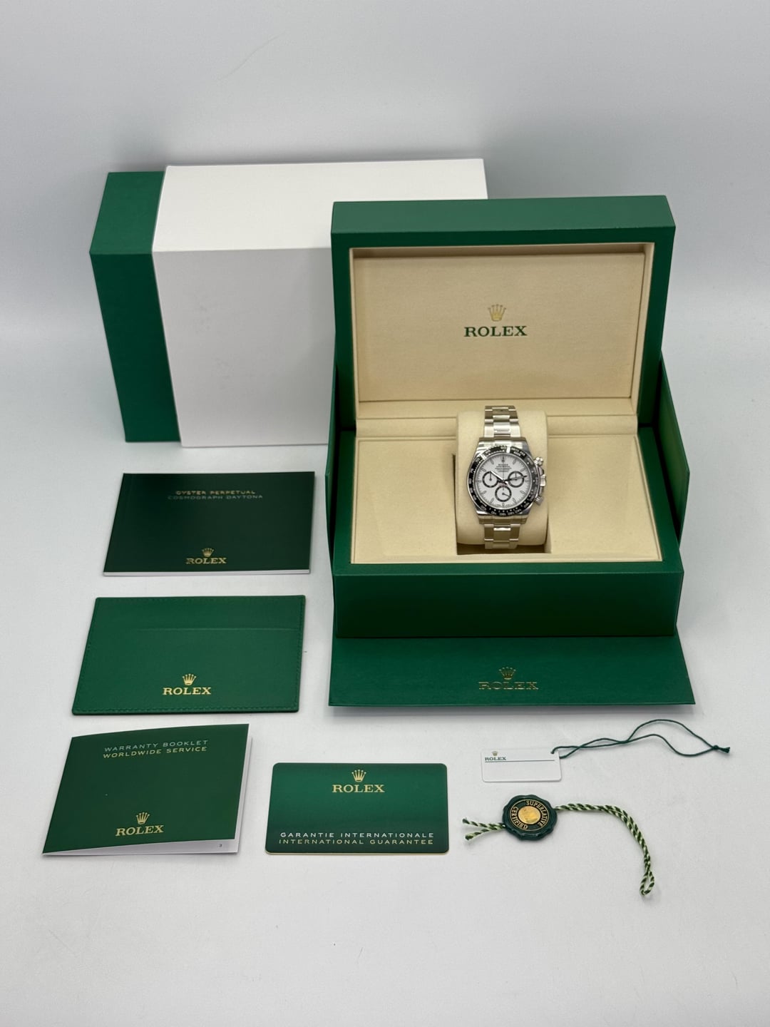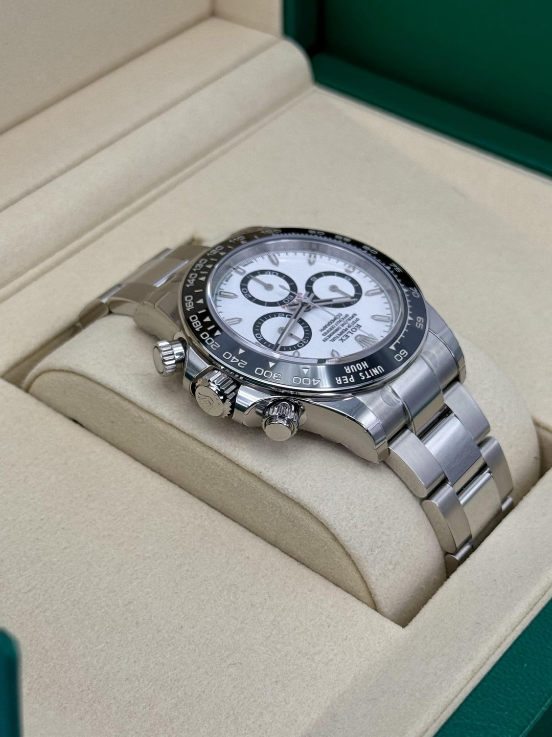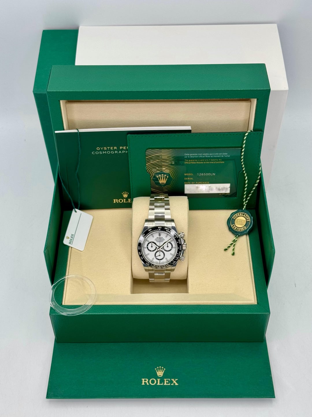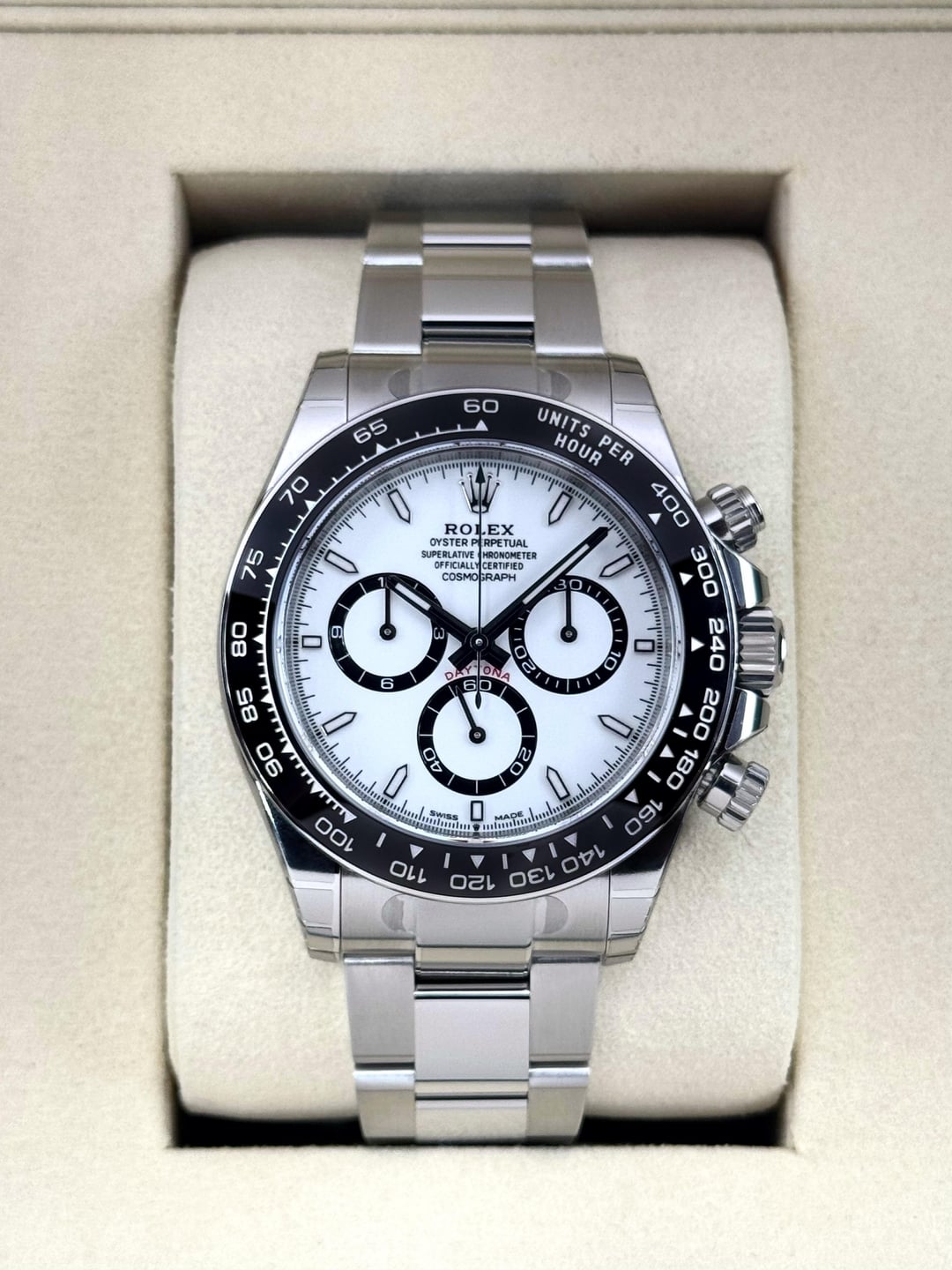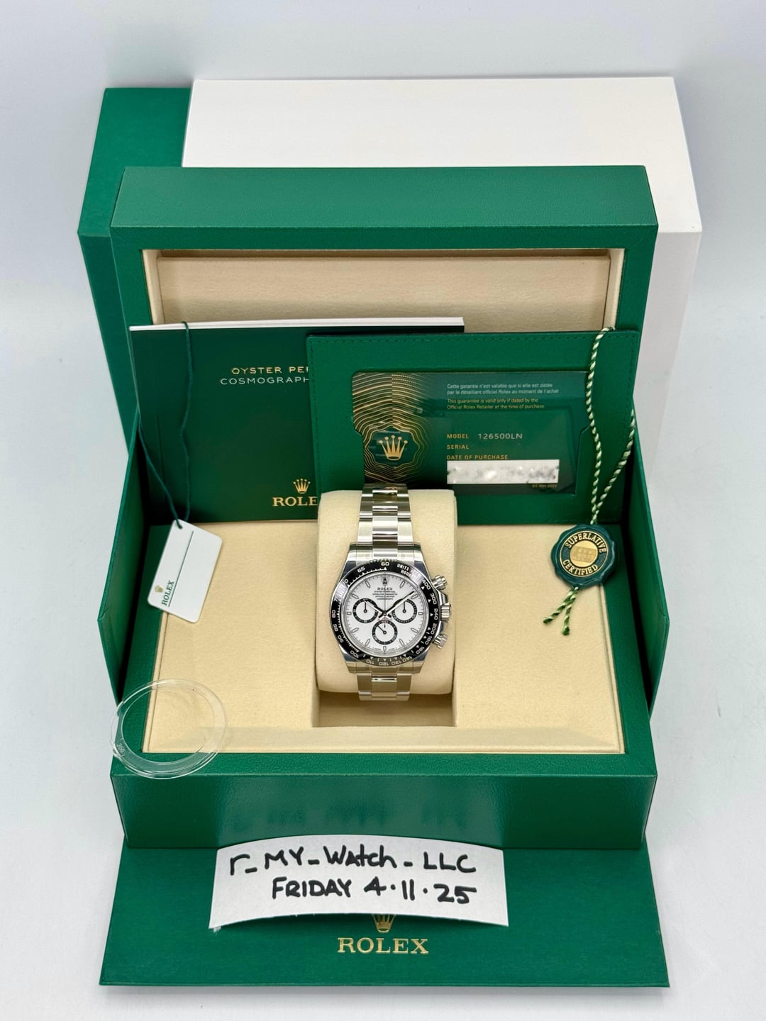🔵NEW 2025 Cosmograph Daytona 40mm 126500LN / 126500 Oystersteel White Panda Dial Oyster Bracelet 🔵Note: Watch is FACTORY ROLEX FULLY STICKERED! Clasp & Link stickers, Barcode and stickers on opposite side of the case. Case Back Sticker. 🔵This is very rare as the factory stickers are normally removed, & stickered watches demand a large premium. 🔵TRADE or SELL us your luxury watch, all brands considered. Message me details. **Includes the following:** ✔️BRAND NEW 2025 UPDATED ROLEX BOX (DOUBLE BOXED & WHITE SLEEVE) ✔️Box and Papers - Yes ✔️Warranty card dated APRIL/2025 ✔️FRESH DATED and FULLY STICKERED ✔️5 year manufacturer warranty ✔️Manual and Warranty booklets ✔️Green and White Hang Tags included ✔️Bezel Protector ✔️Size: 8.0inch wrist (Full Links) ✔️Watch is BRAND NEW/UNWORN ✔️Trades welcome ✔️Appraisal included Business Name: **My Watch LLC** LOCATION: Oak Park, Michigan ✔️[MyWatchLLC.com](http://mywatchllc.com) for current inventory ✔️Google Business Listing [https://g.co/kgs/Cmd6FPW](https://g.co/kgs/Cmd6FPW) ✔️Business Hours M-F 9-6 ✔️Facetime/Video chat/calls welcome to view the watch interested. ✔️Contact: 248-422-0909 via text or call for quickest response. 🟢TERMS: Visit [MyWatchLLC.Com](http://mywatchllc.com) for payments accepted 🟢REFERENCES/REVIEWS: We are well reviewed on all platforms from google, trust pilot, rolexforums, additionally we have 300+ reference in multiple FaceBook watch groups, reference checks welcome. 🟢SHIPPING: If you are not local, we offer Fully Insured FedEx overnight shipping in the USA for a fee. International shipping available.
