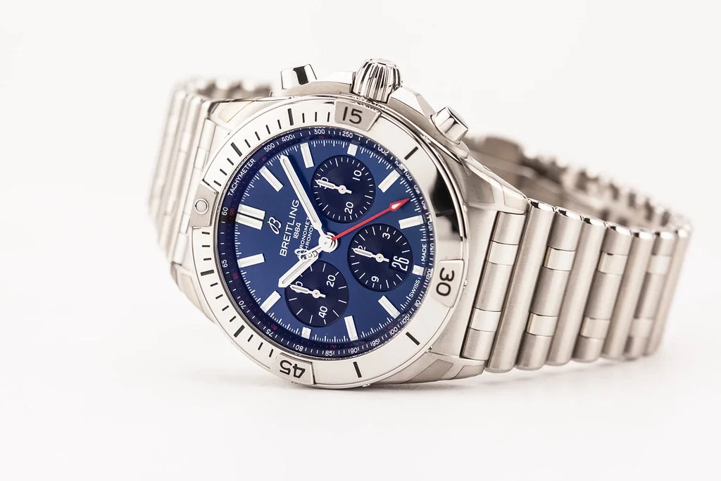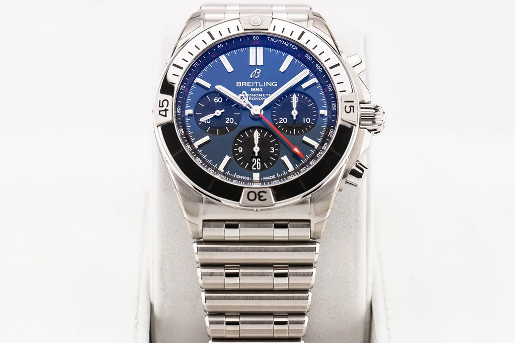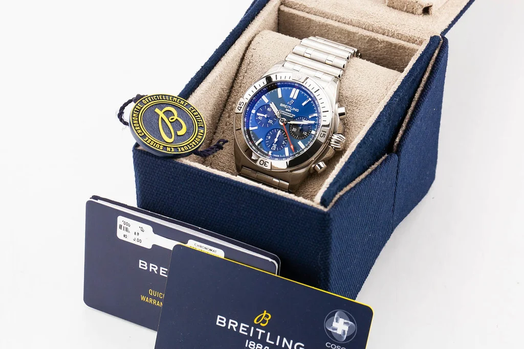 Up for sale is a brand new Breitling Chronomat B01 42 Blue Dial on Bracelet, reference # AB0134101C1A1. It comes complete with all boxes, papers, booklets, hang tag and Breitling Warranty Card dated February 2025.